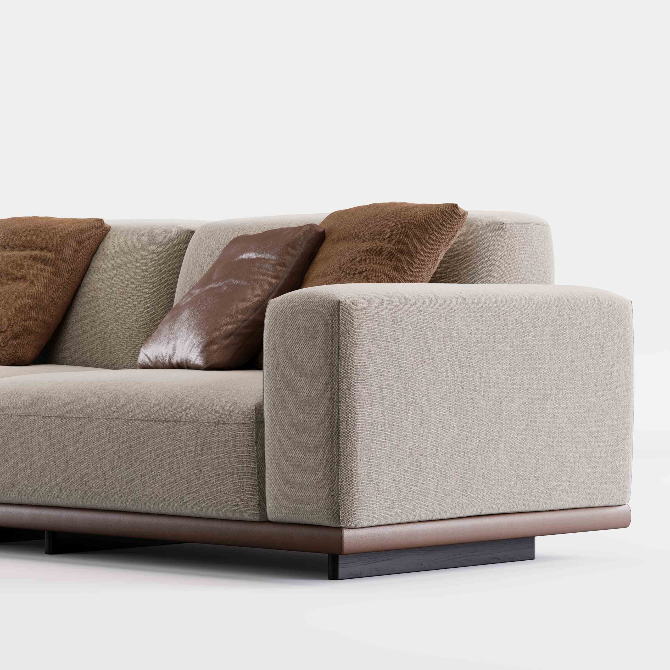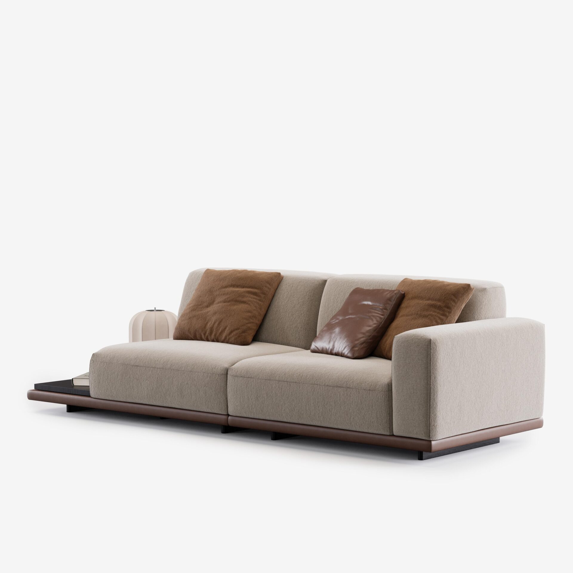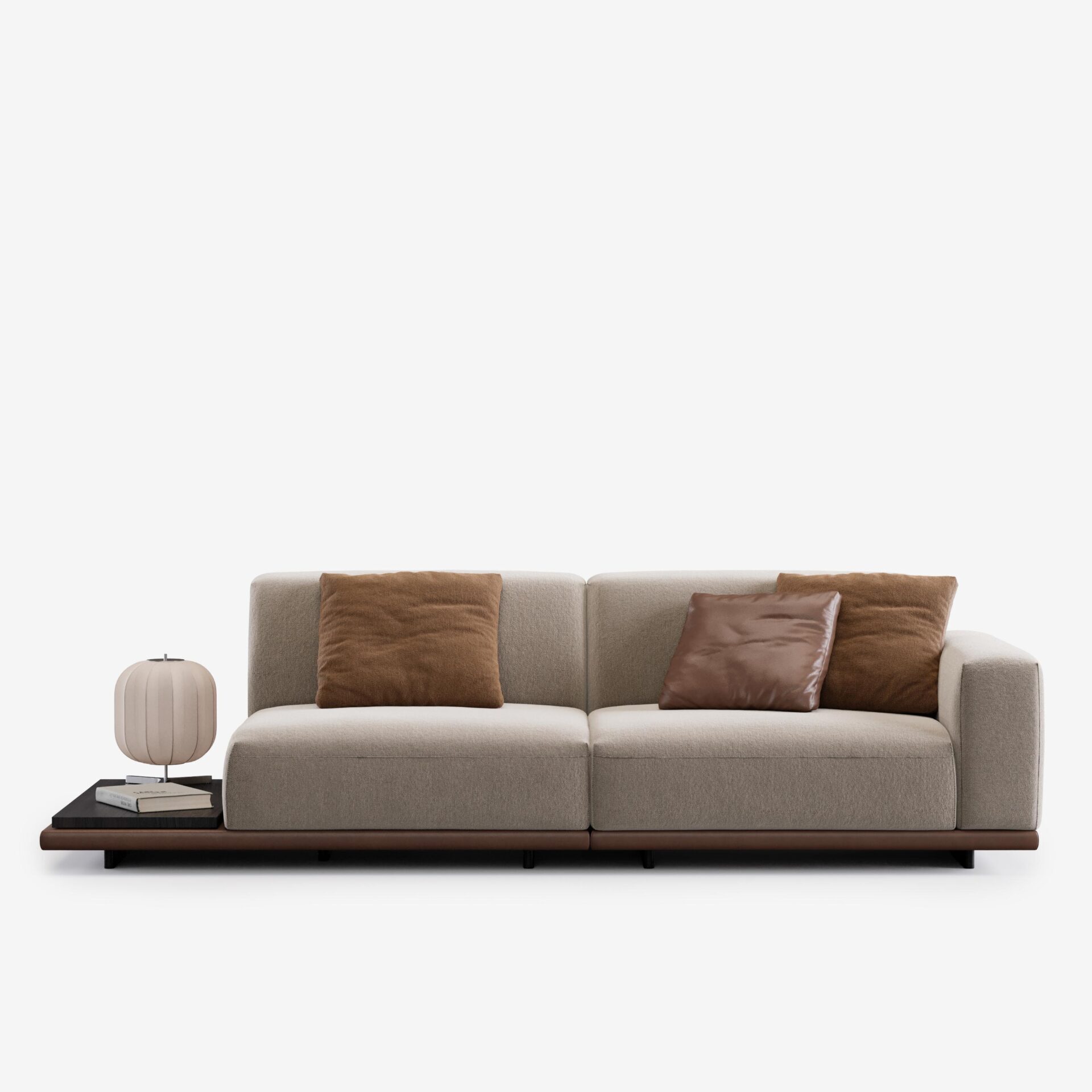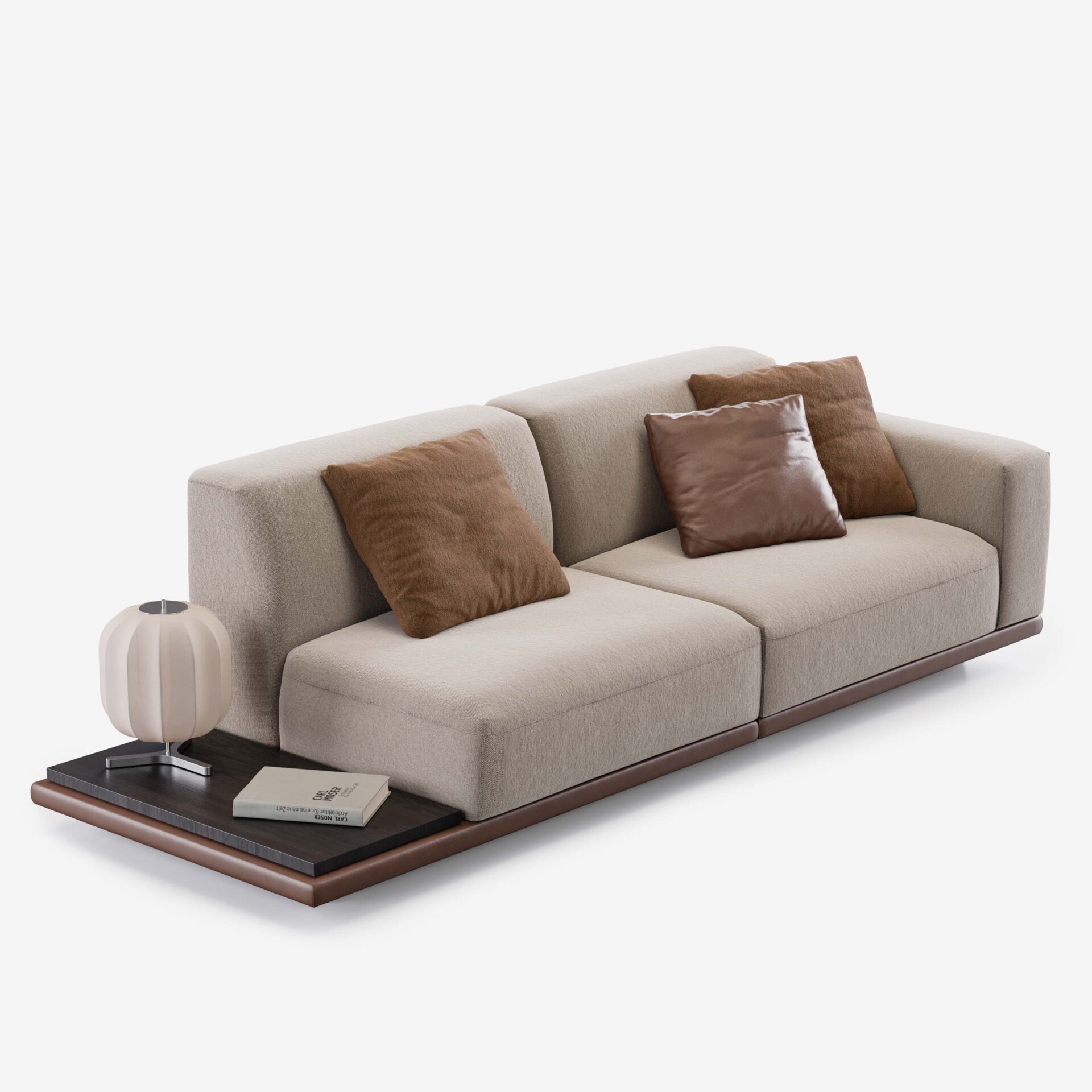 Все модули самостоятельны — их можно комбинировать или использовать по отдельности, создавая именно ту среду, которая вам нужна. Коллекцию дополняют кресла, повторяющие ее пластику, и многофункциональные пуфы-столики с отделкой из шпона дуба. Диван можно персонализировать практичными элементами: подлокотниками, подставками, боковыми столиками и ящиками для хранения, которые легко объединяются с основными модулями.
