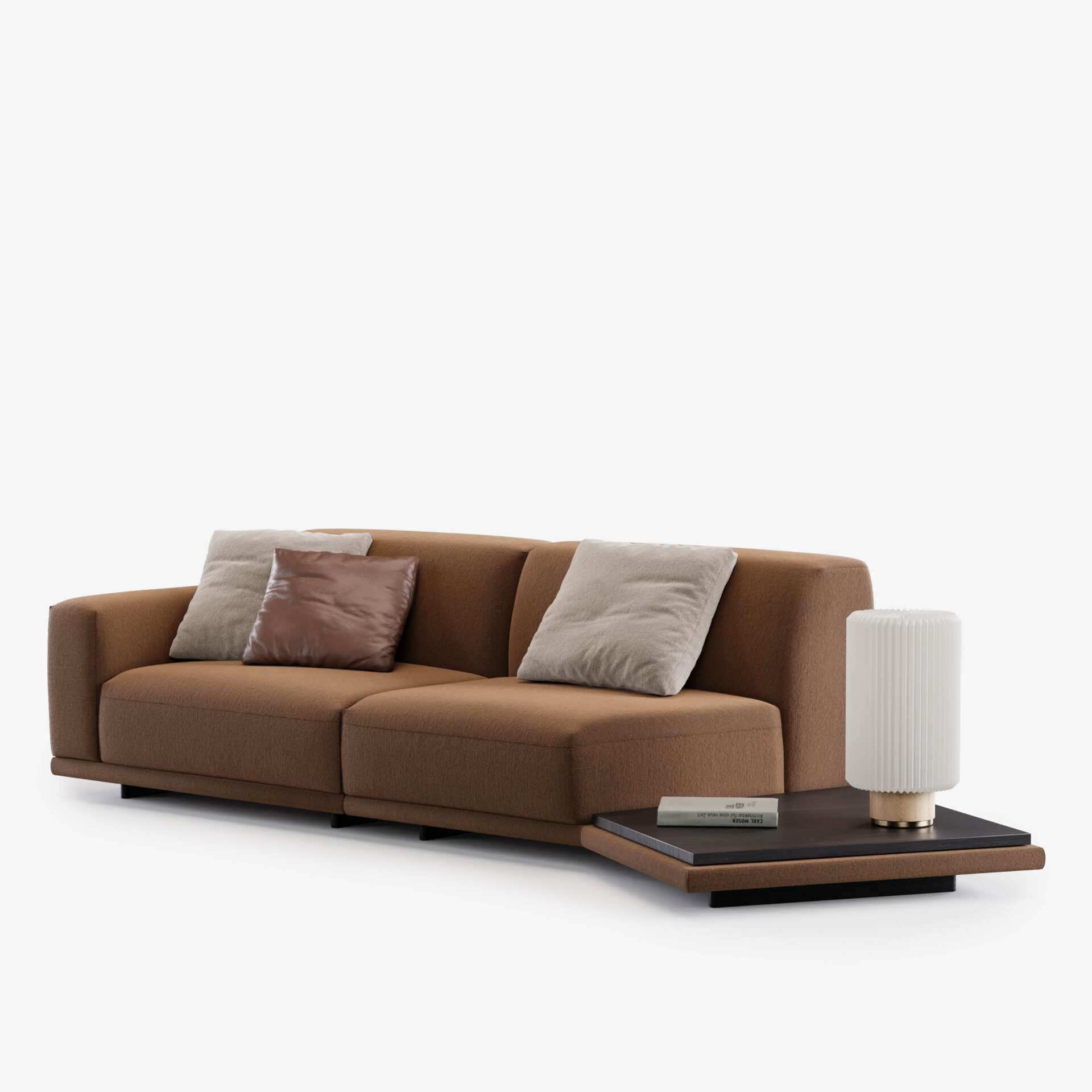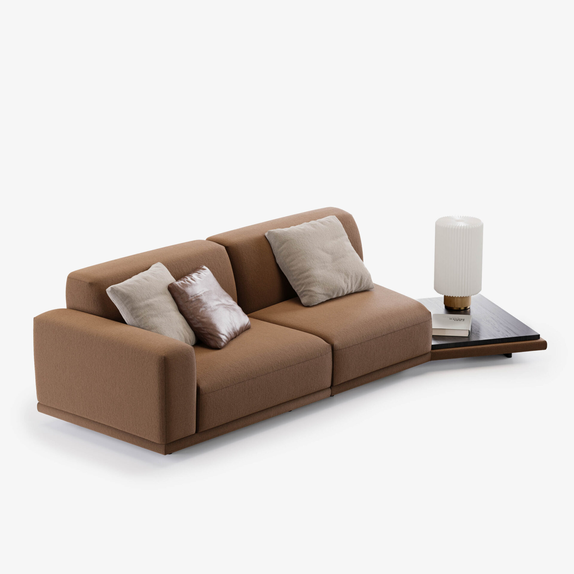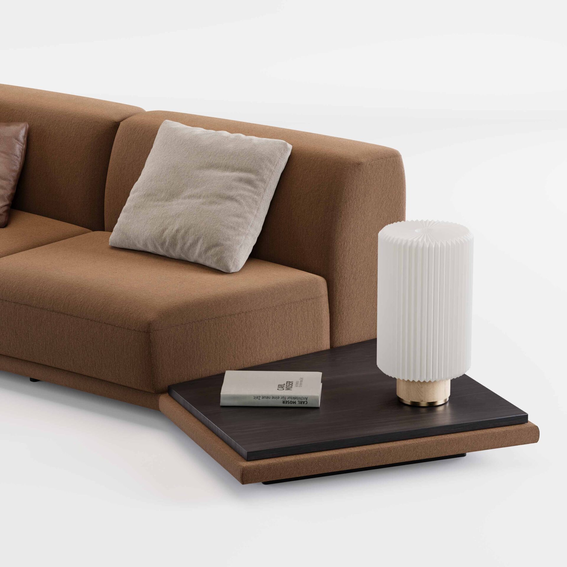 Все модули самостоятельны — их можно комбинировать или использовать по отдельности, создавая именно ту среду, которая вам нужна. Коллекцию дополняют кресла, повторяющие ее пластику, и многофункциональные пуфы-столики с отделкой из шпона дуба. Диван можно персонализировать практичными элементами: подлокотниками, подставками, боковыми столиками и ящиками для хранения, которые легко объединяются с основными модулями.