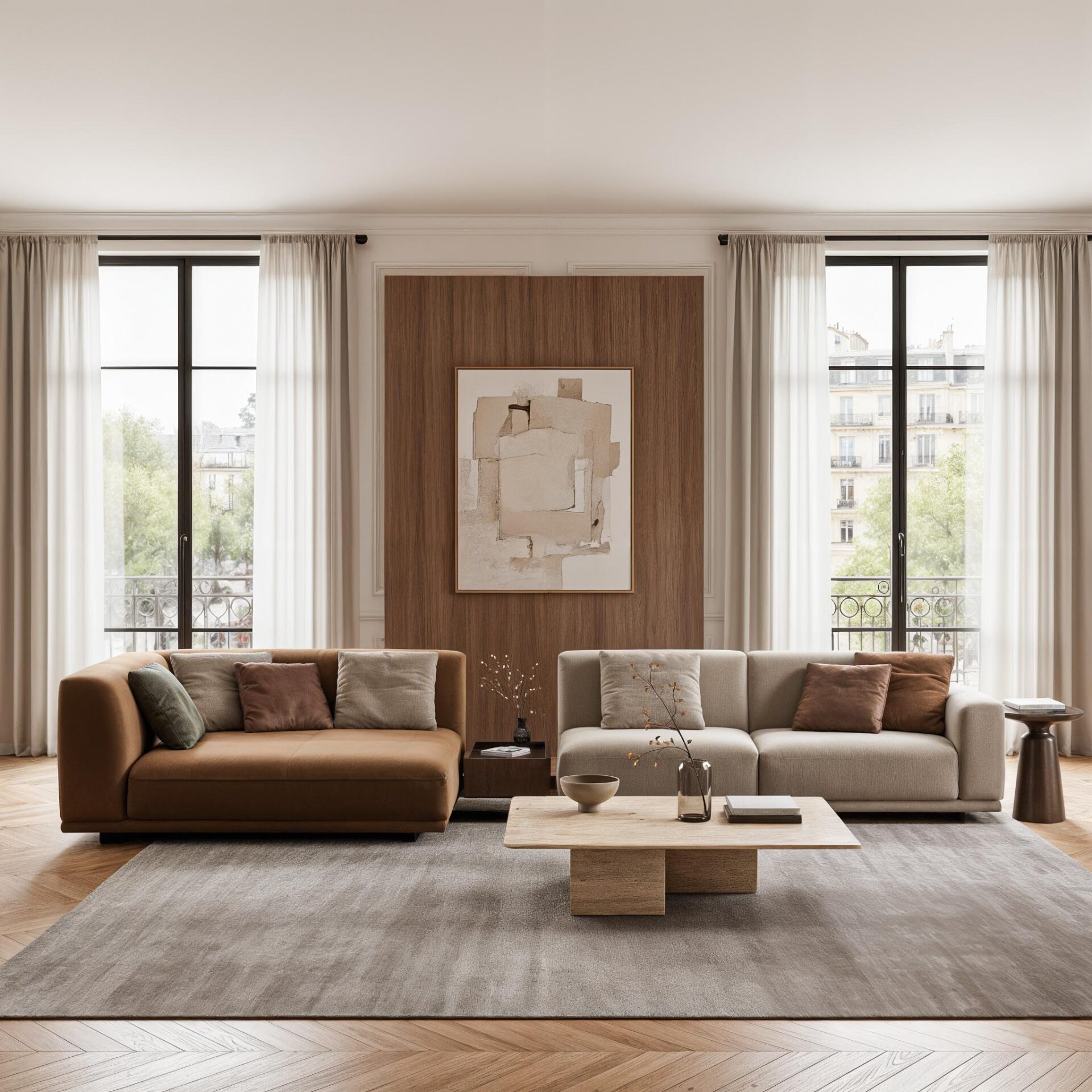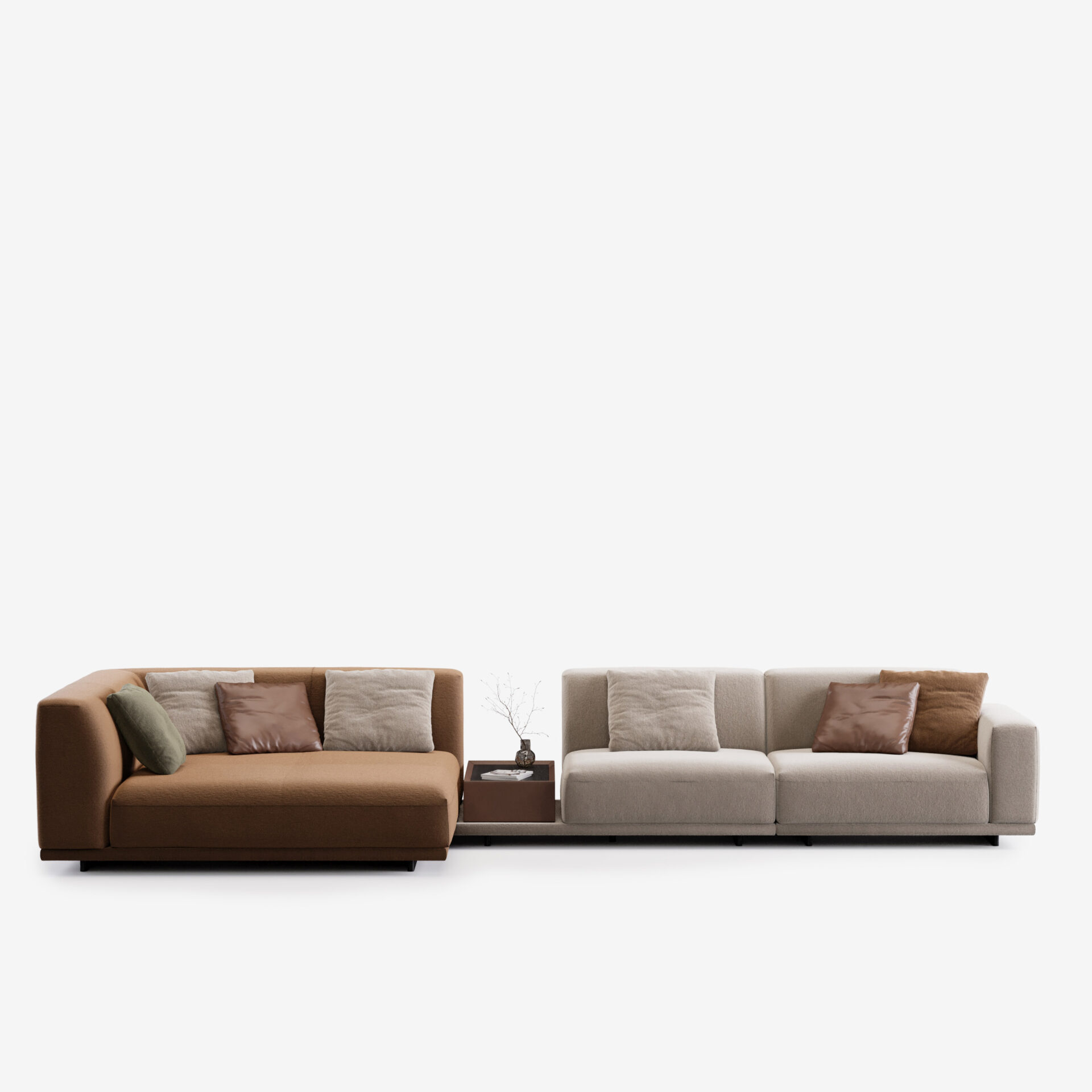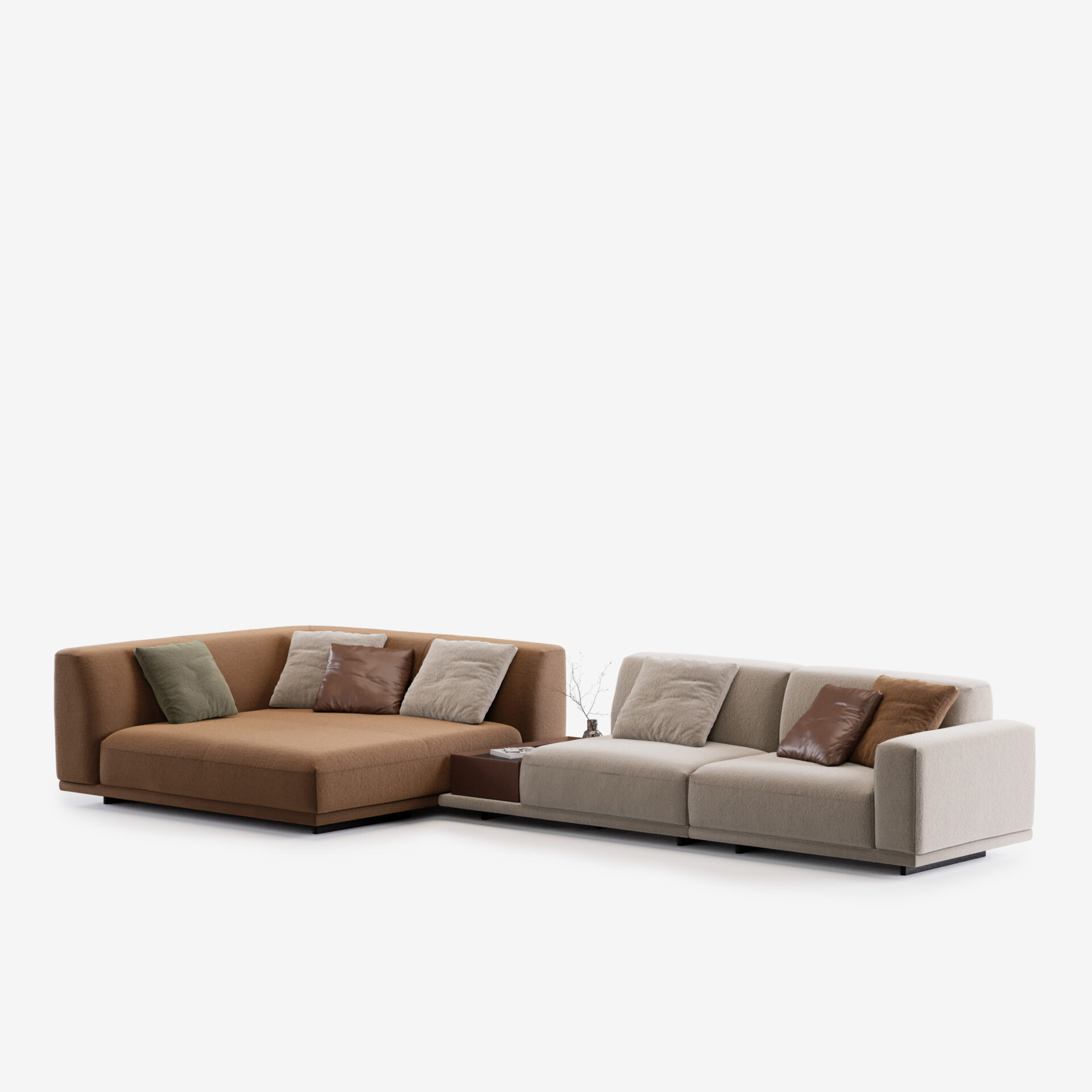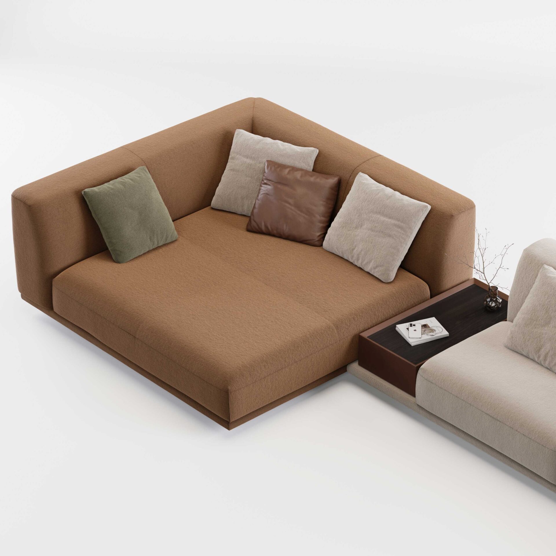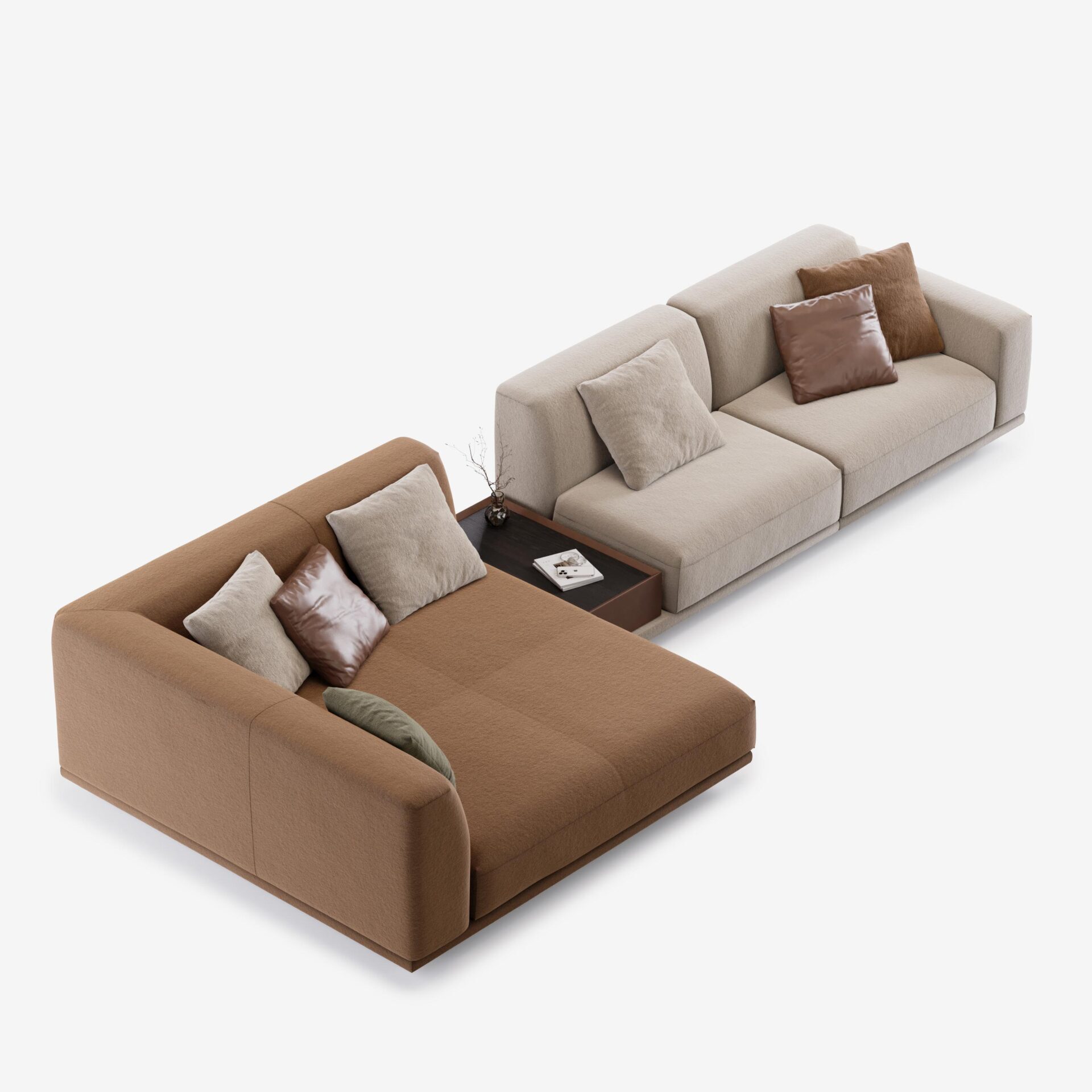 Все модули самостоятельны — их можно комбинировать или использовать по отдельности, создавая именно ту среду, которая вам нужна. Коллекцию дополняют кресла, повторяющие ее пластику, и многофункциональные пуфы-столики с отделкой из шпона дуба. Диван можно персонализировать практичными элементами: подлокотниками, подставками, боковыми столиками и ящиками для хранения, которые легко объединяются с основными модулями.