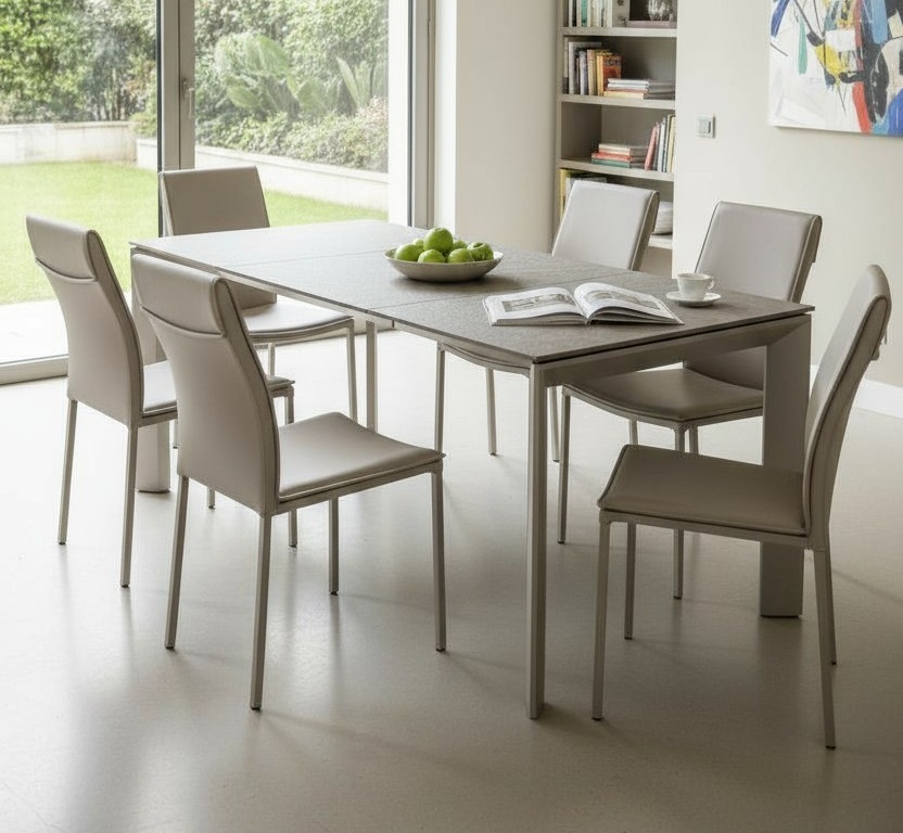 Правильная геометрическая форма стола и стульев позволяет Вам рационально использовать каждый сантиметр Вашего пространства. При необходимости увеличения размера, изножье стола функционально выдвигается — это открывает возможность к использованию довольно большой вставки - 60 см, за счет действия синхронного механизма-“Butterfly”, что позволяет увеличить полезную длину стола от 140 до 200 см.