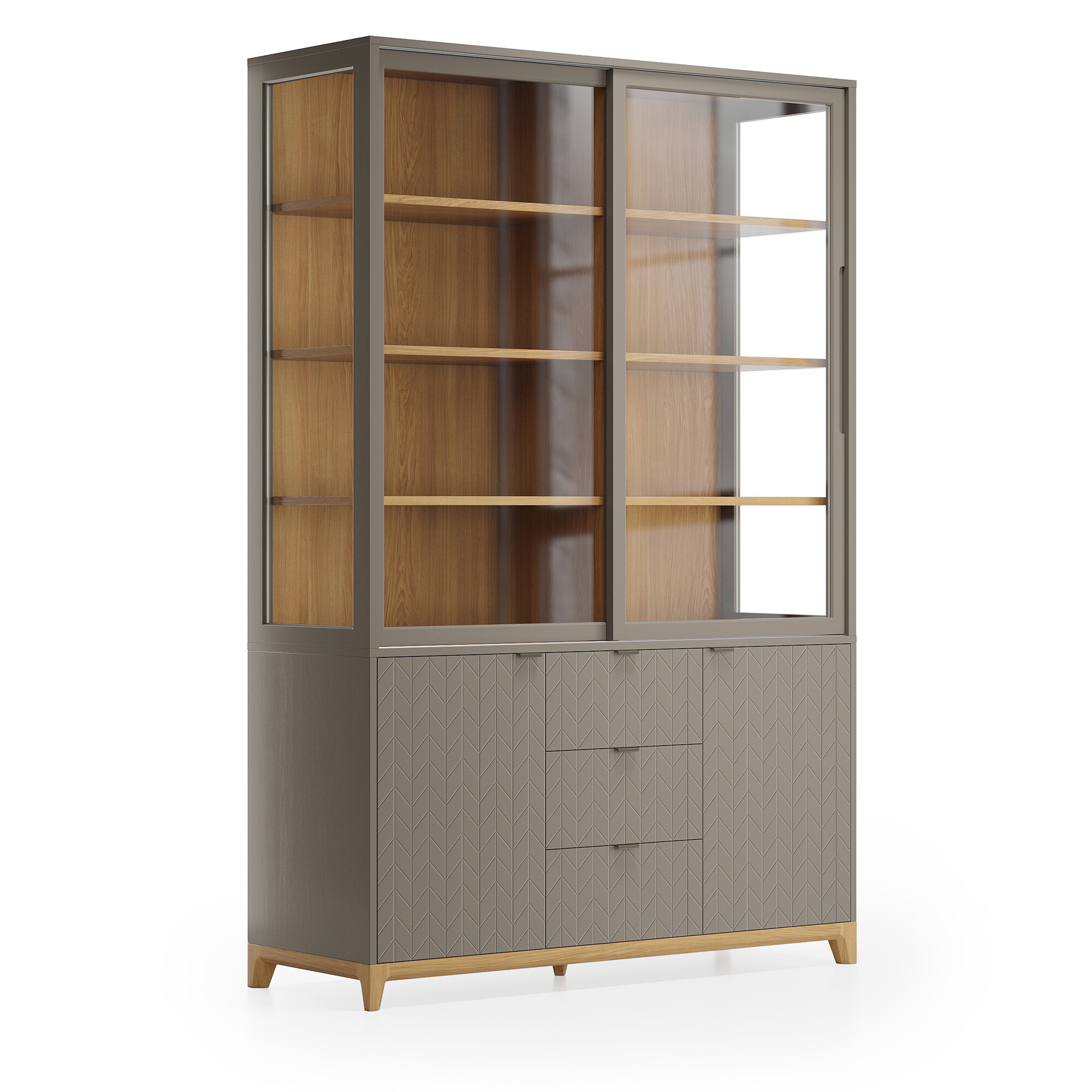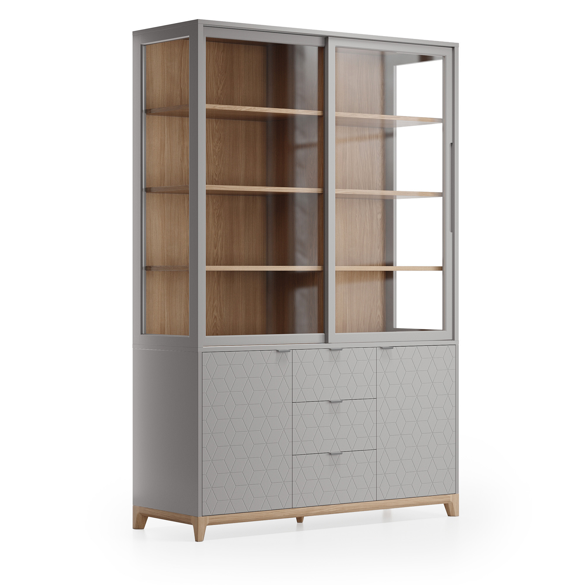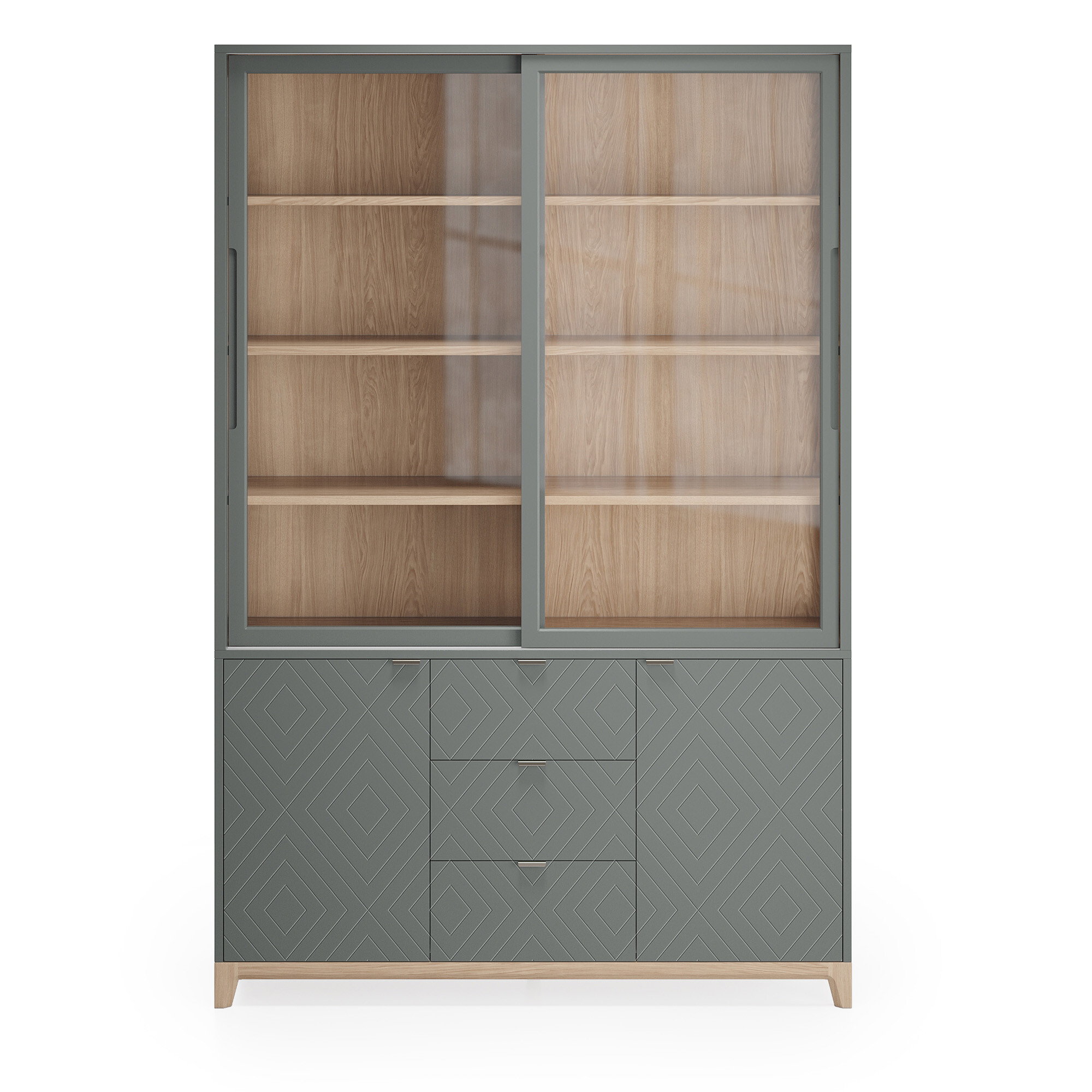 Стеклянные фасады буфета Case CS188 поддерживают визуальную легкость конструкции и создают удачное место для хранения памятных сувениров, книг и аксессуаров, позволяя рассмотреть детали и защищая содержимое от пыли. В нижней части буфета за фасадами с привлекательным узором скрываются вместительные полки и ящики.