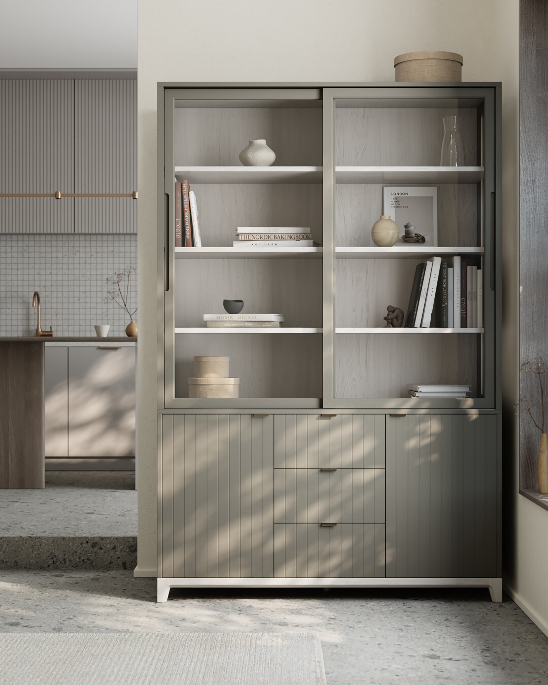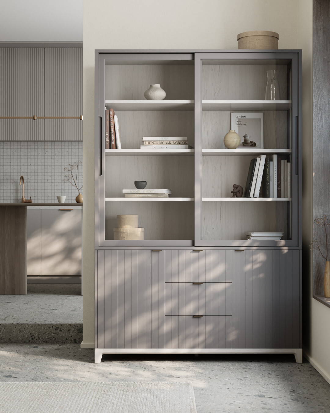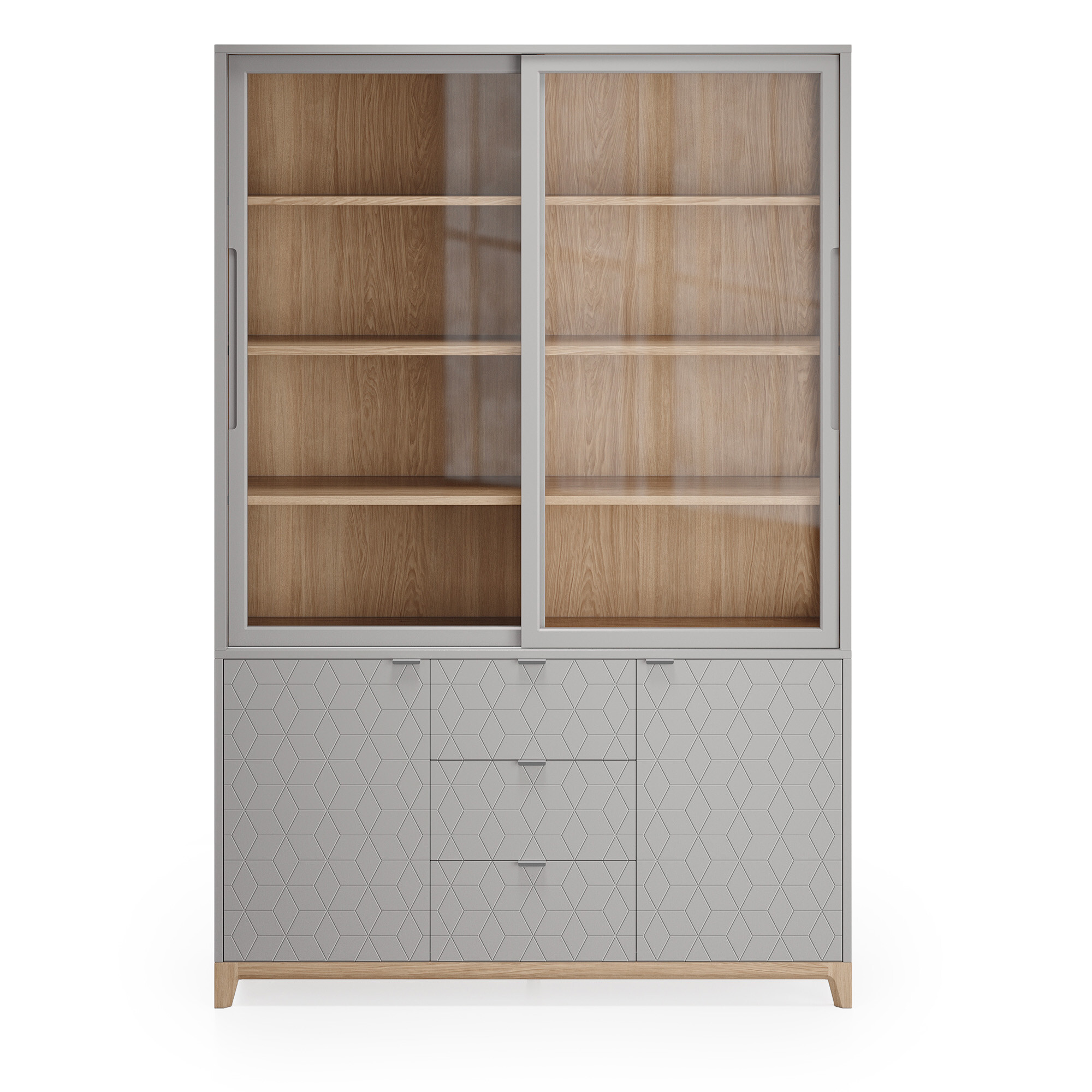 Стеклянные фасады буфета Case CS188 поддерживают визуальную легкость конструкции и создают удачное место для хранения памятных сувениров, книг и аксессуаров, позволяя рассмотреть детали и защищая содержимое от пыли. В нижней части буфета за фасадами с привлекательным узором скрываются вместительные полки и ящики.