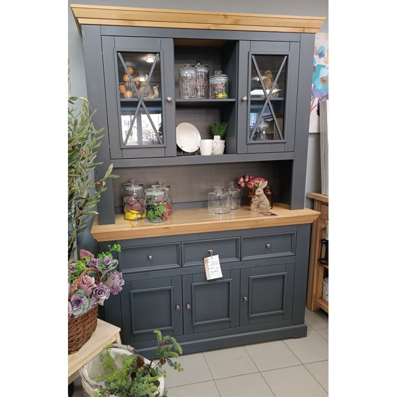 Большой буфет «Форест» из массива сосны. Состоит из комода с 3 дверками и 3 ящиками и надстройки. За дверками комода и надстройки расположено по одной полке. Для открывания ящиков и дверок используется фурнитура немецкого производства компании Hefele.