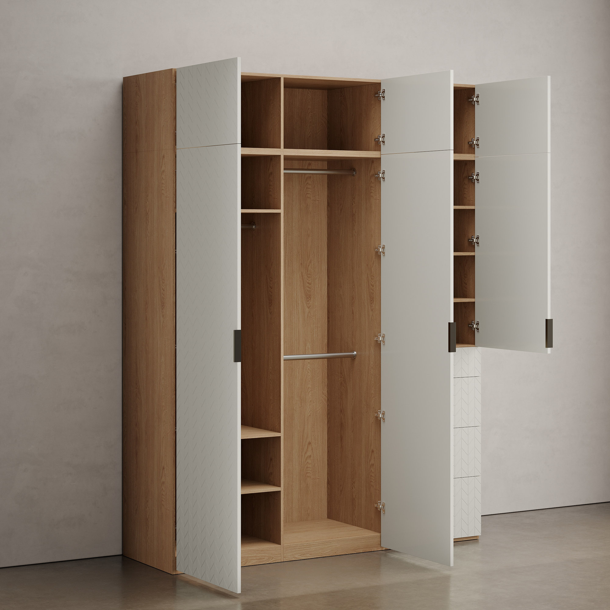– Необходимая высота гардеробной системы достигается с помощью модулей-
