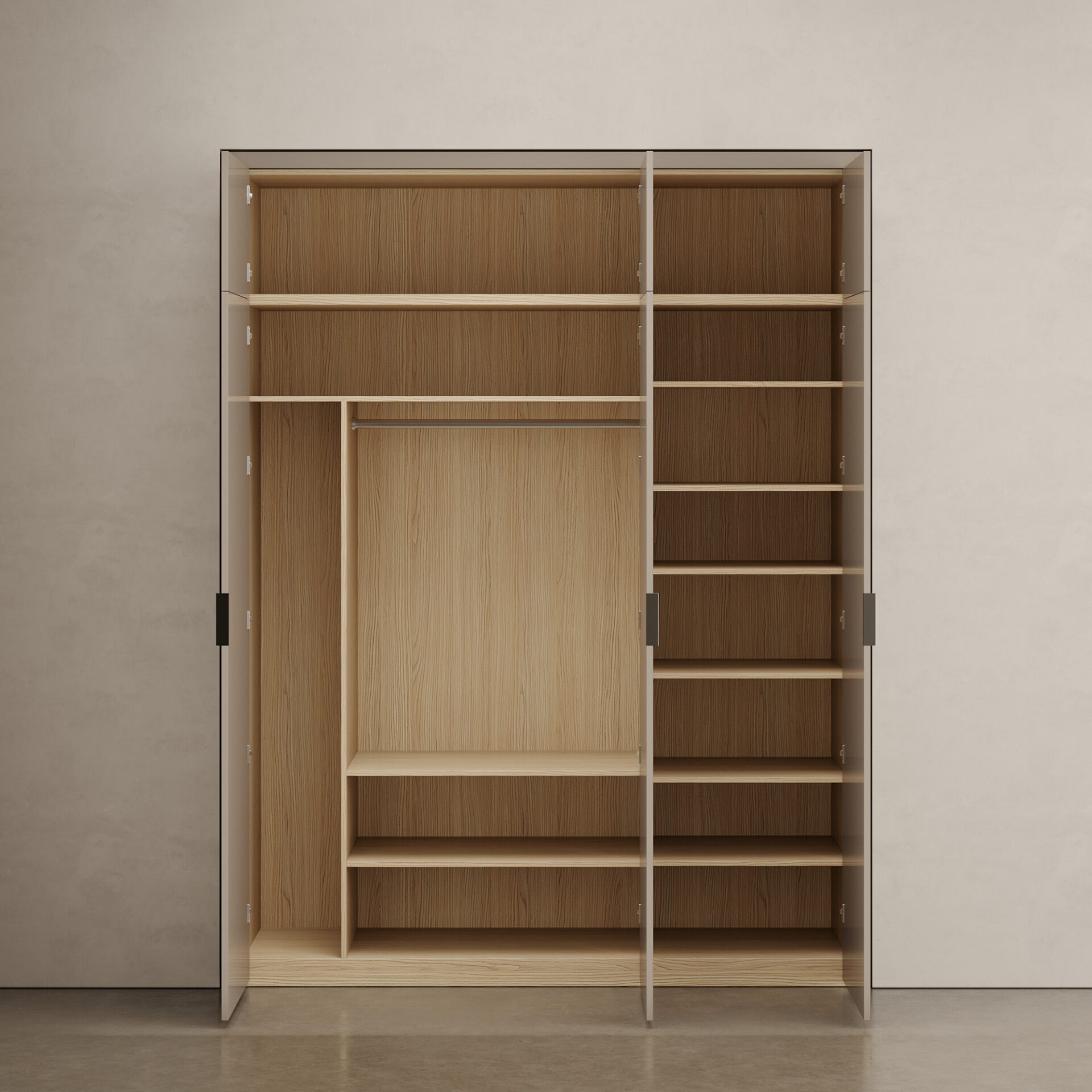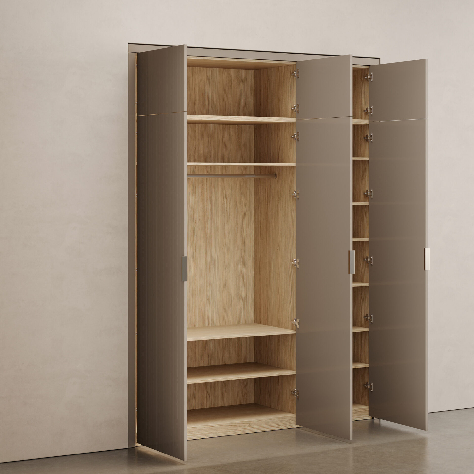 Модульная гардеробная система GARDA с декоративными доборами— стильное и функциональное решение для ниши. Продуманная конструкция изделия позволит систематизировать гардероб и навести порядок в доме. Шкаф состоит из отдельных модулей, которые легко комбинировать между собой — выбирайте нужное наполнение, размеры и меняйте их расположение в зависимости от потребностей. Лаконичный дизайн, обширная цветовая палитра и фасады, декорированные гравировкой, помогут изделию достойно вписаться в современный интерьер, не привлекая к себе лишнего внимания. Высокое качество и удобство пользования сделают шкаф незаменимым элементом вашего дома. Особенности коллекции: – Большой размерный ряд модулей, разнообразное внутреннее наполнение секций (полки, штанги, внутренние и внешние выдвижные ящики); – Необходимая высота гардеробной системы достигается с помощью модулей- антресолей, оснащенных функцией Push-to-Open (открывание с помощью нажатия); – По запросу возможно изменение стандартных модульных размеров (для получения нужной величины гардеробной системы); – Корпус модулей и внутреннее наполнение выполнены из ЛДСП EGGER c текстурой дерева (3 цвета) или без текстуры (2 цвета); – Фасады выполнены из МДФ и доступны в отделке эмалью (30 цветов) с гравировкой или без нее, а так же в отделке натуральным шпоном дуба в тонировке; – Декоративные доборы выполнены из МДФ в той же отделке, что и фасады. Такие декоративные детали применяются при установке изделия в нише или ограниченном пространстве (всех сторон либо частично, в зависимости от задачи); – Все фасады регулируются в трех плоскостях для выравнивания узора гравировки; – Удлиненные ручки-профили выполнены из алюминия и доступны в семи отделках; – Немецкие петли и бесшумные направляющие скрытого монтажа с доводчиками от Hettich; – Предусмотрено крепление к стене.