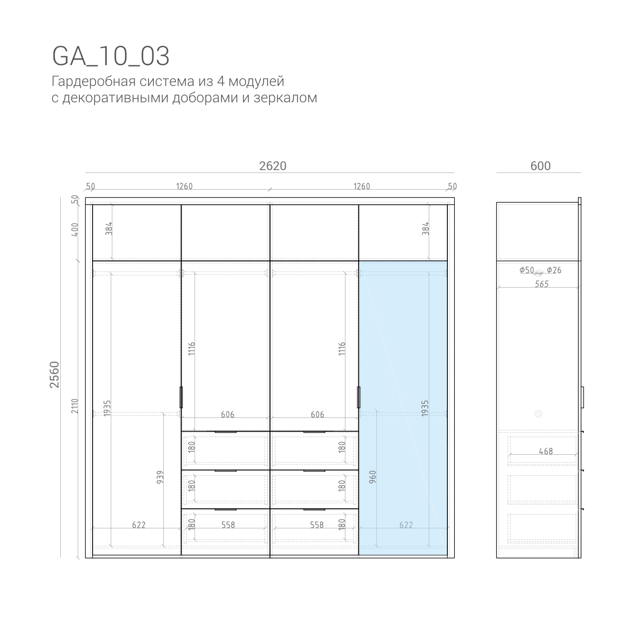 – Необходимая высота гардеробной системы достигается с помощью модулей-