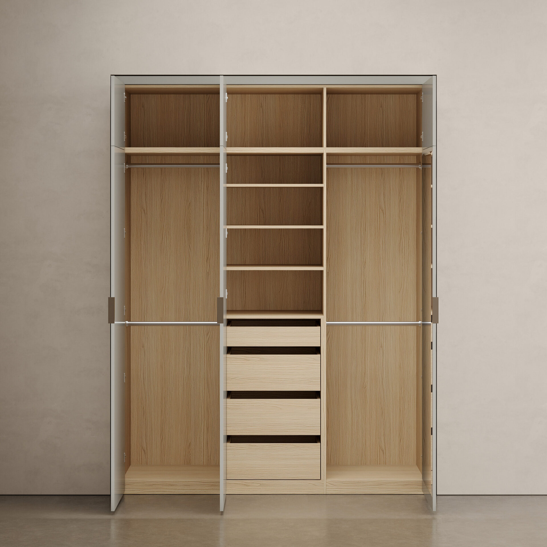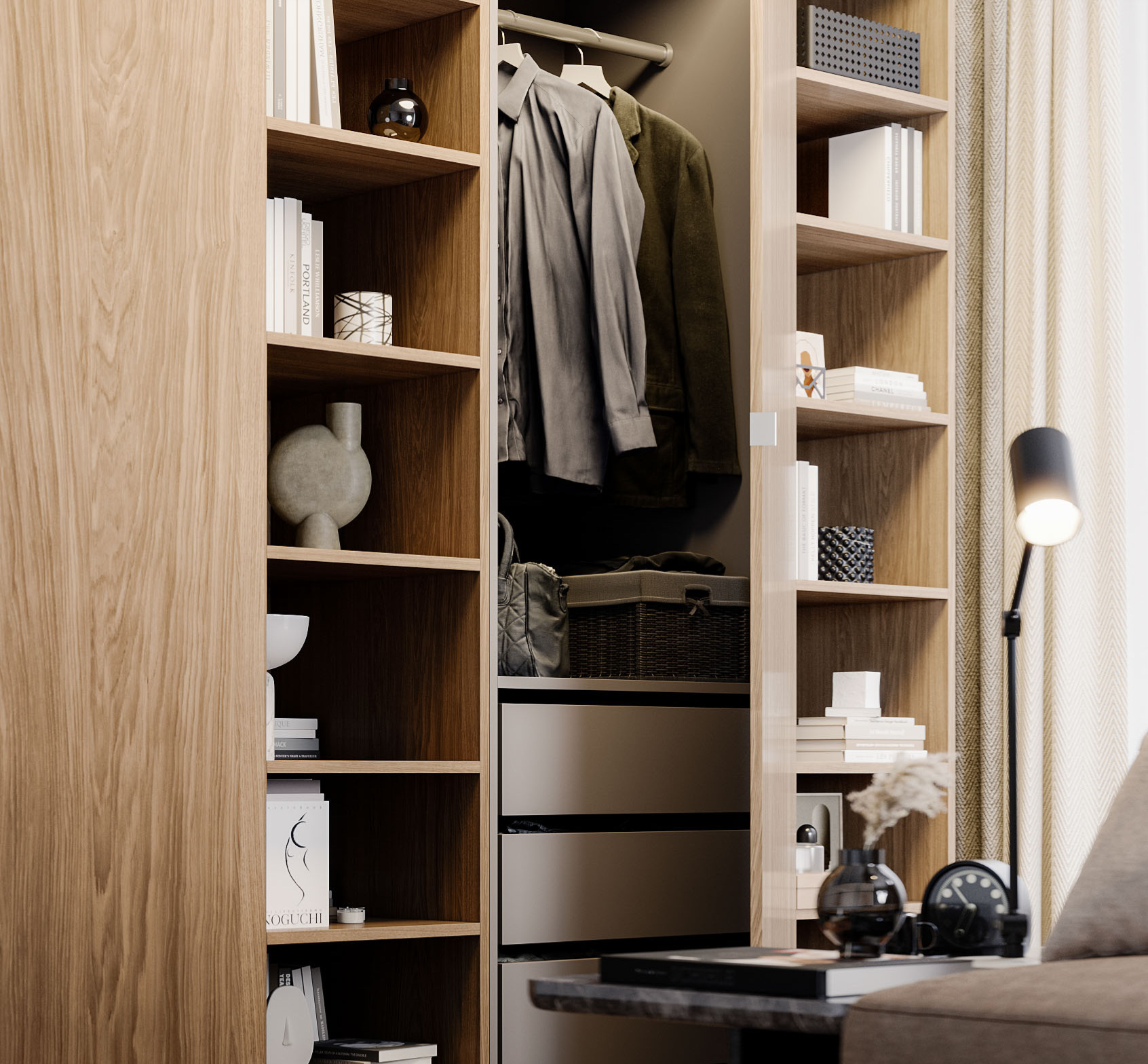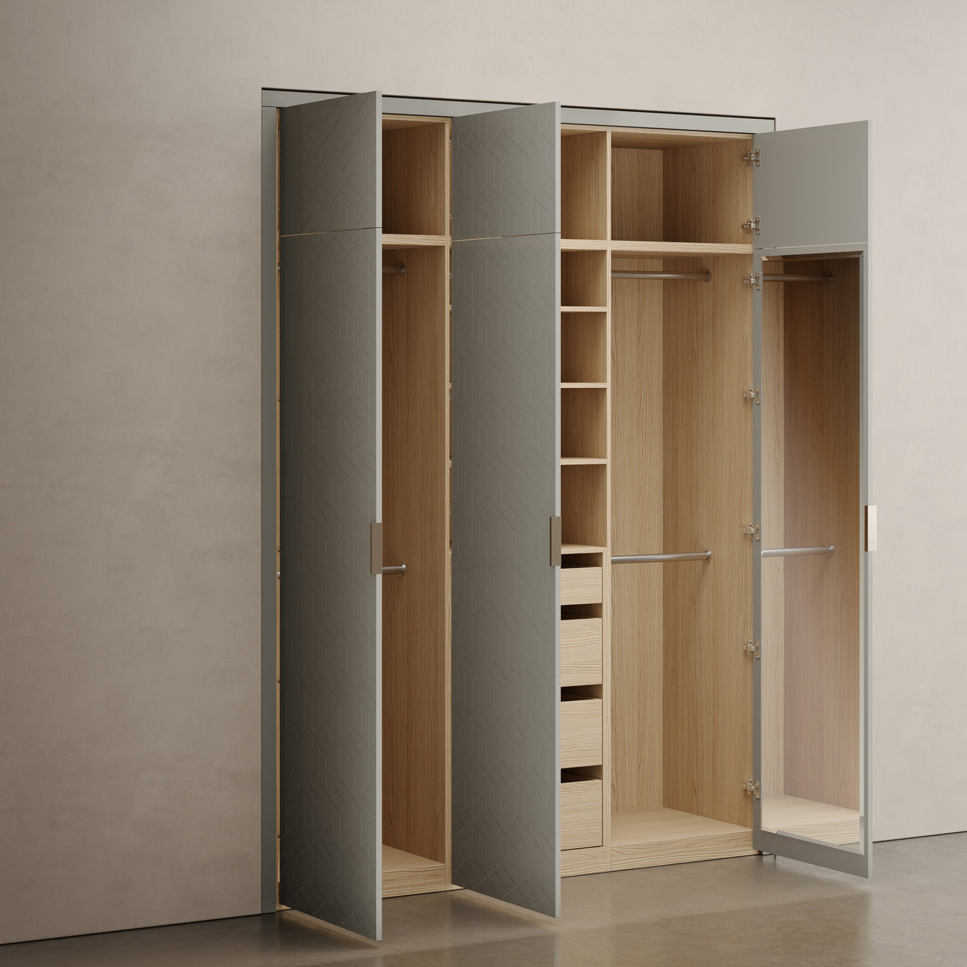 Модульная гардеробная система GARDA с декоративными доборами— стильное и функциональное решение для ниши. Продуманная конструкция изделия позволит систематизировать гардероб и навести порядок в доме. Шкаф состоит из отдельных модулей, которые легко комбинировать между собой — выбирайте нужное наполнение, размеры и меняйте их расположение в зависимости от потребностей. Лаконичный дизайн, обширная цветовая палитра и фасады, декорированные гравировкой, помогут изделию достойно вписаться в современный интерьер, не привлекая к себе лишнего внимания. Высокое качество и удобство пользования сделают шкаф незаменимым элементом вашего дома. Особенности коллекции: – Большой размерный ряд модулей, разнообразное внутреннее наполнение секций (полки, штанги, внутренние и внешние выдвижные ящики); – Необходимая высота гардеробной системы достигается с помощью модулей- антресолей, оснащенных функцией Push-to-Open (открывание с помощью нажатия); – По запросу возможно изменение стандартных модульных размеров (для получения нужной величины гардеробной системы); – Корпус модулей и внутреннее наполнение выполнены из ЛДСП EGGER c текстурой дерева (3 цвета) или без текстуры (2 цвета); – Фасады выполнены из МДФ и доступны в отделке эмалью (30 цветов) с гравировкой или без нее, а так же в отделке натуральным шпоном дуба в тонировке; – Декоративные доборы выполнены из МДФ в той же отделке, что и фасады. Такие декоративные детали применяются при установке изделия в нише или ограниченном пространстве (всех сторон либо частично, в зависимости от задачи); – Все фасады регулируются в трех плоскостях для выравнивания узора гравировки; – Удлиненные ручки-профили выполнены из алюминия и доступны в семи отделках; – Немецкие петли и бесшумные направляющие скрытого монтажа с доводчиками от Hettich; – Предусмотрено крепление к стене.