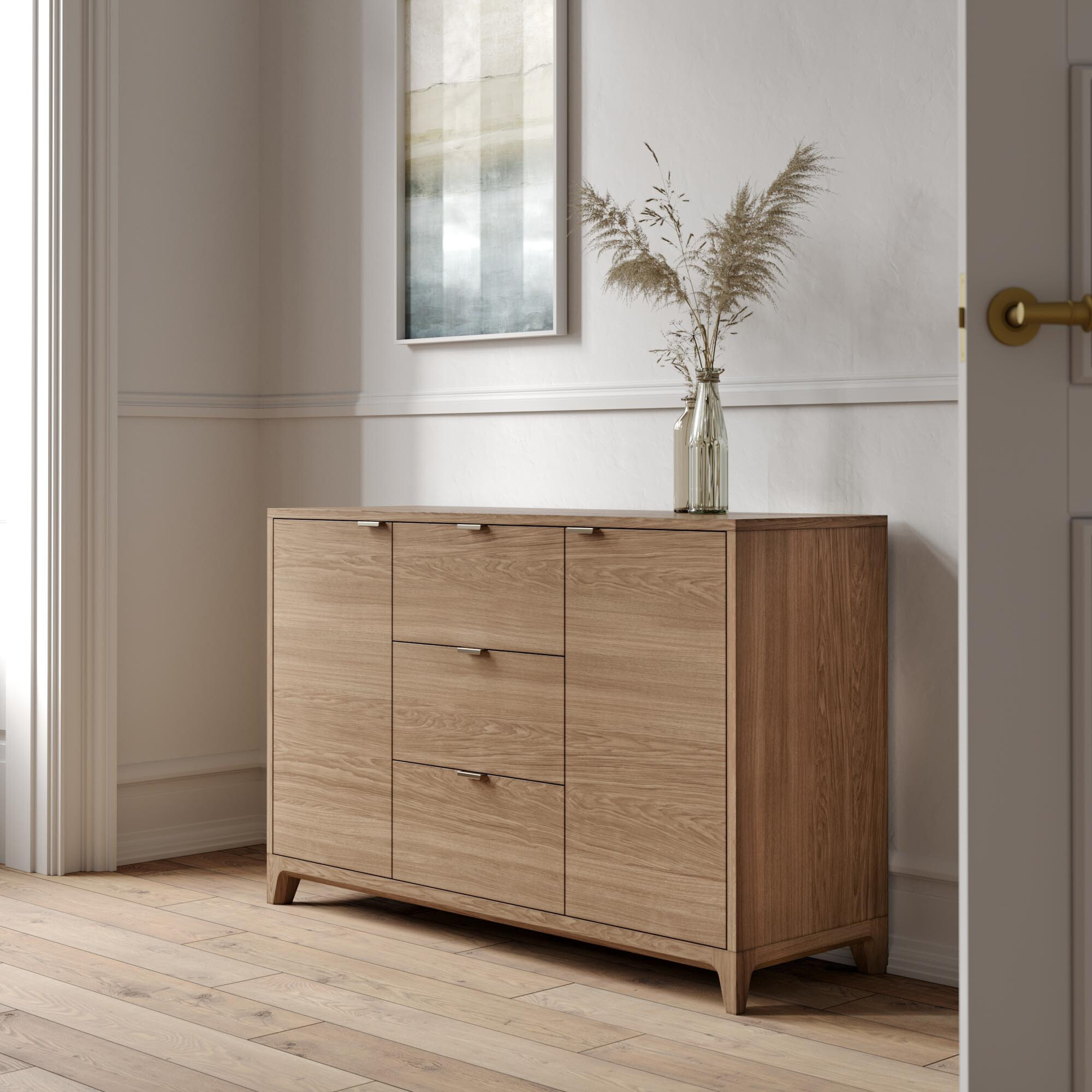 В этом комоде гармонично сочетаются лаконичный дизайн и продуманные габариты. Данная модель оснащена двумя просторными секциями с полками по бокам и тремя выдвижными ящиками по центру. Комод станет удачной находкой для любителей утонченного стиля и функциональной мебели.