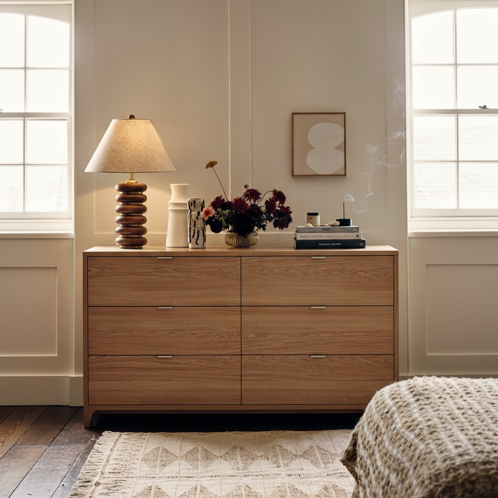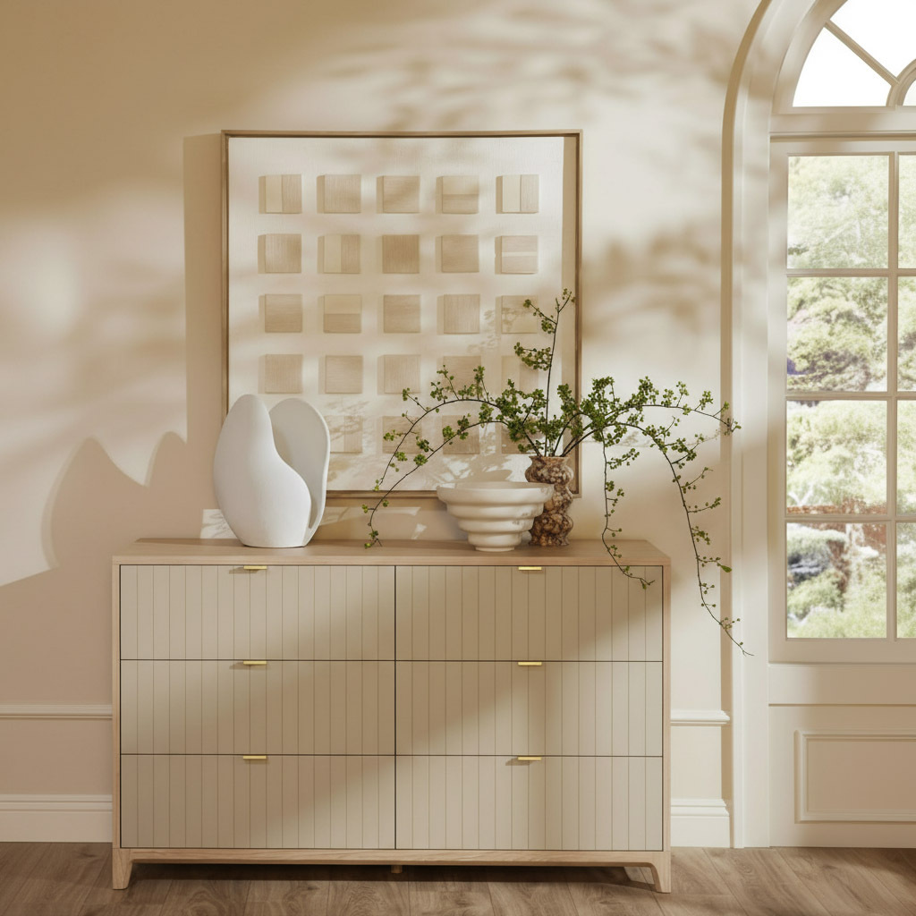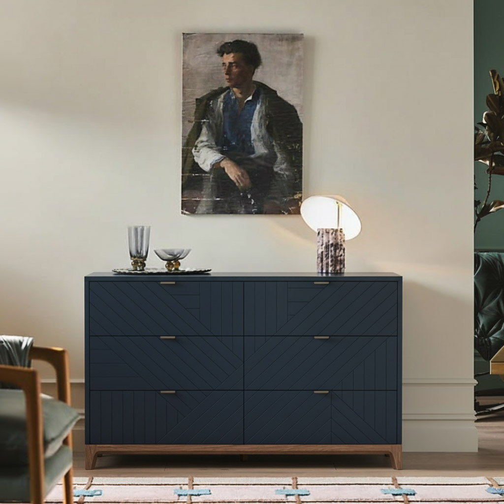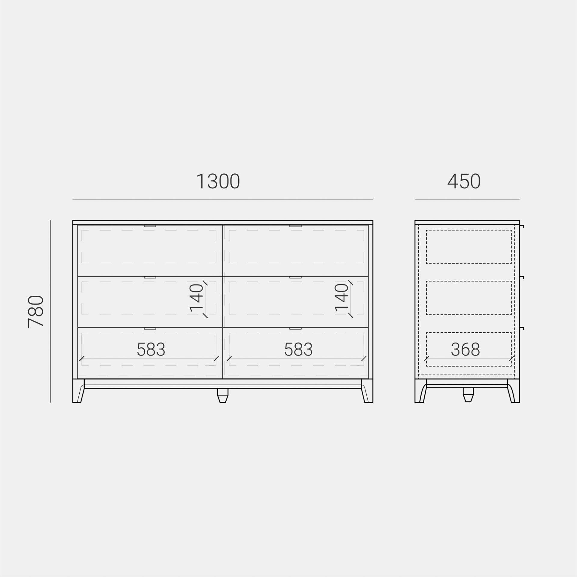 Комод с шестью выдвижными ящиками будет незаменим для хранения вещей в спальне и других помещениях. Прочные и вместительные ящики из ЛДСП, которые выдерживают вес до 25 кг помогут использовать пространство максимально эффективно, а фасады с объемной гравировкой и изящные ножки из массива дуба непременно украсят ваш интерьер. Выбирайте оттенок эмали, материал корпуса, тонировку основания и ножек, а также узор гравировки. Кроме того, вы можете заказать комод, который будет полностью покрыт натуральным шпоном дуба.