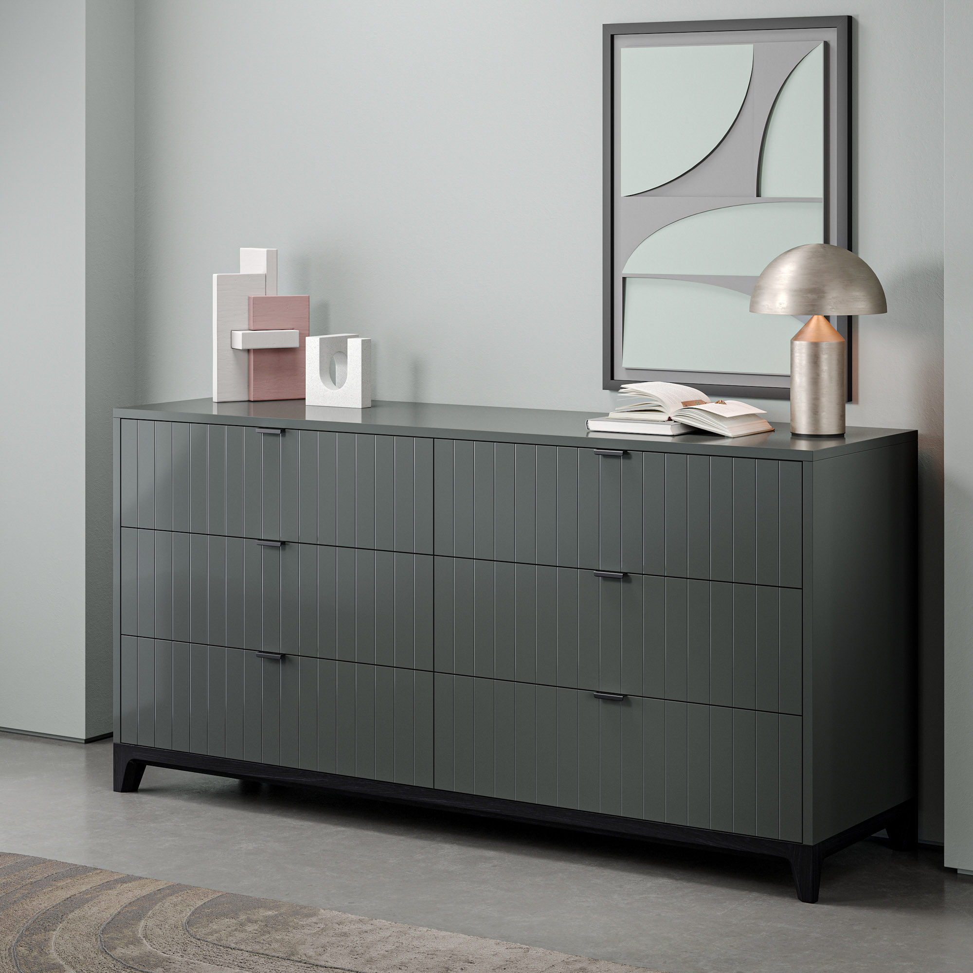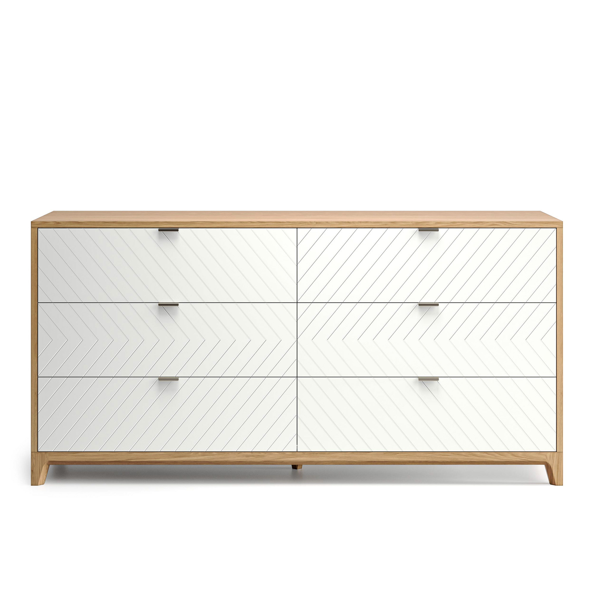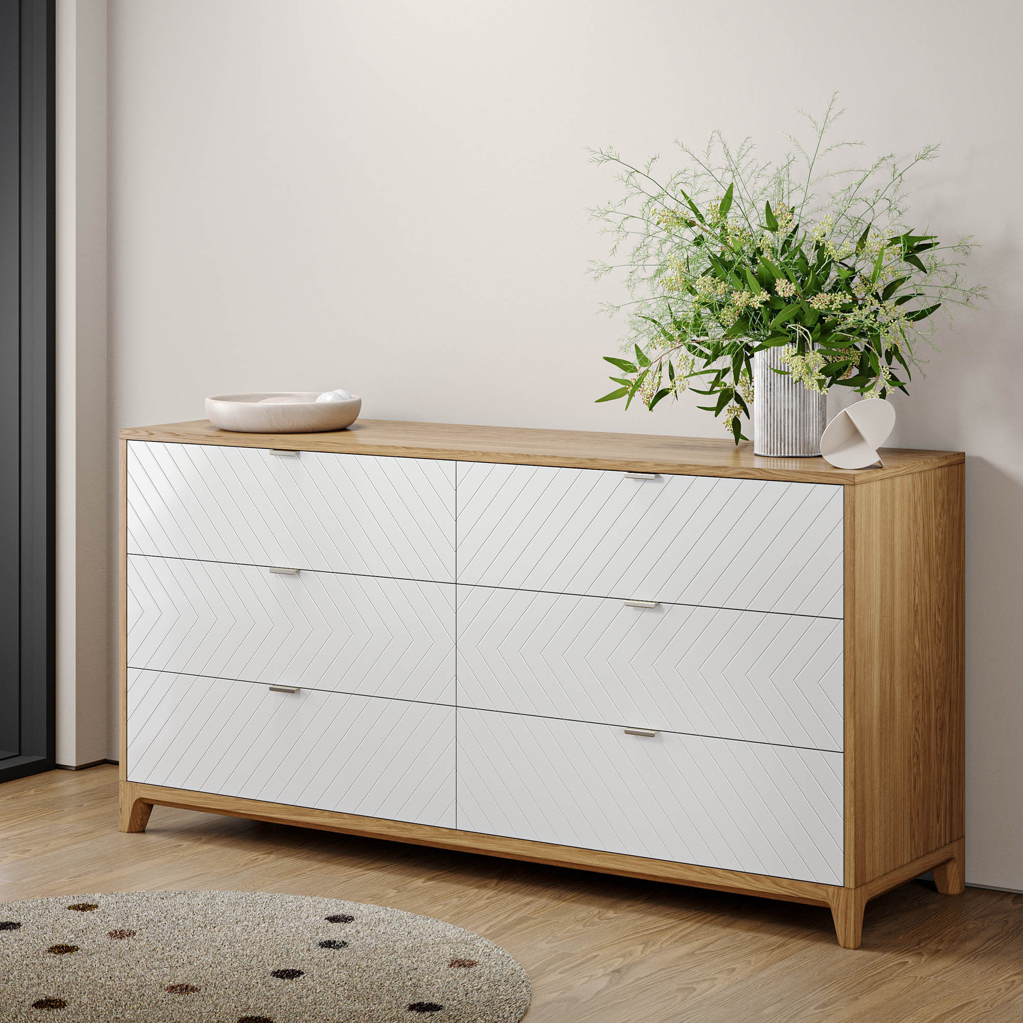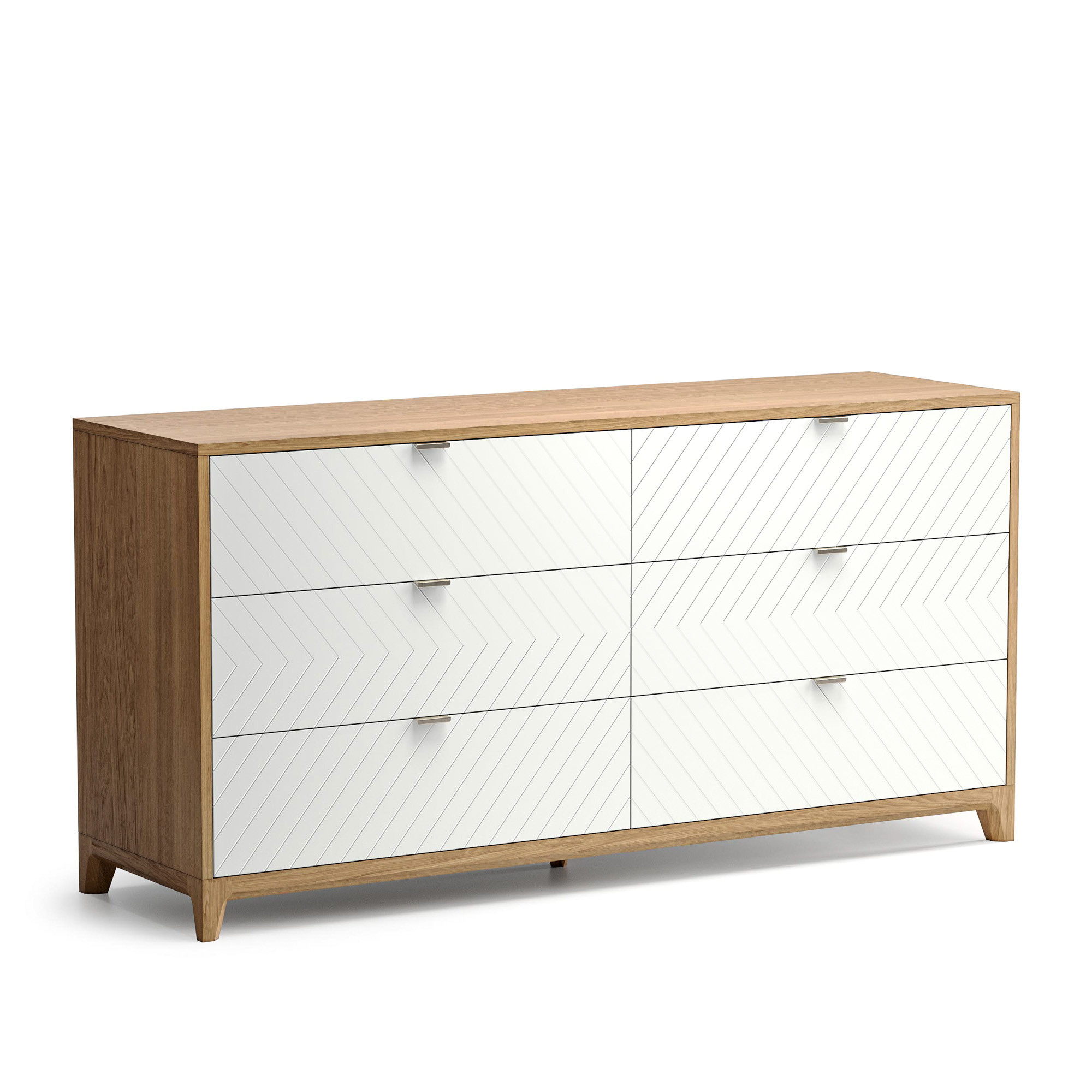 Комод CS059 с шестью выдвижными ящиками будет незаменим для хранения вещей в спальне и других помещениях. Прочные и вместительные ящики из ЛДСП, которые выдерживают вес до 25 кг помогут использовать пространство максимально эффективно, а фасады с объемной гравировкой и изящные ножки из массива дуба непременно украсят ваш интерьер. Выбирайте оттенок эмали, материал корпуса, тонировку основания и ножек, а также узор гравировки. Кроме того, вы можете заказать комод, который будет полностью покрыт натуральным шпоном дуба.