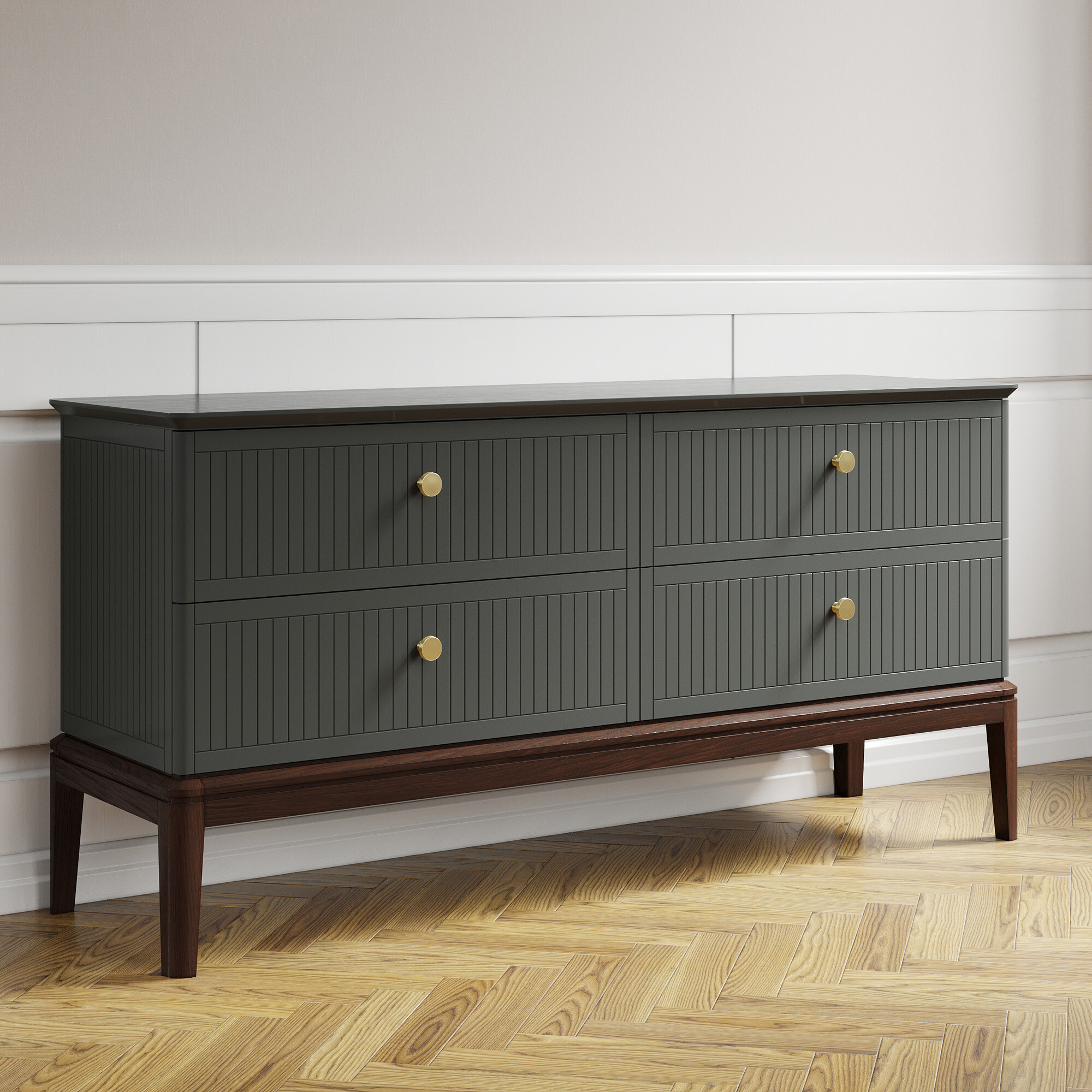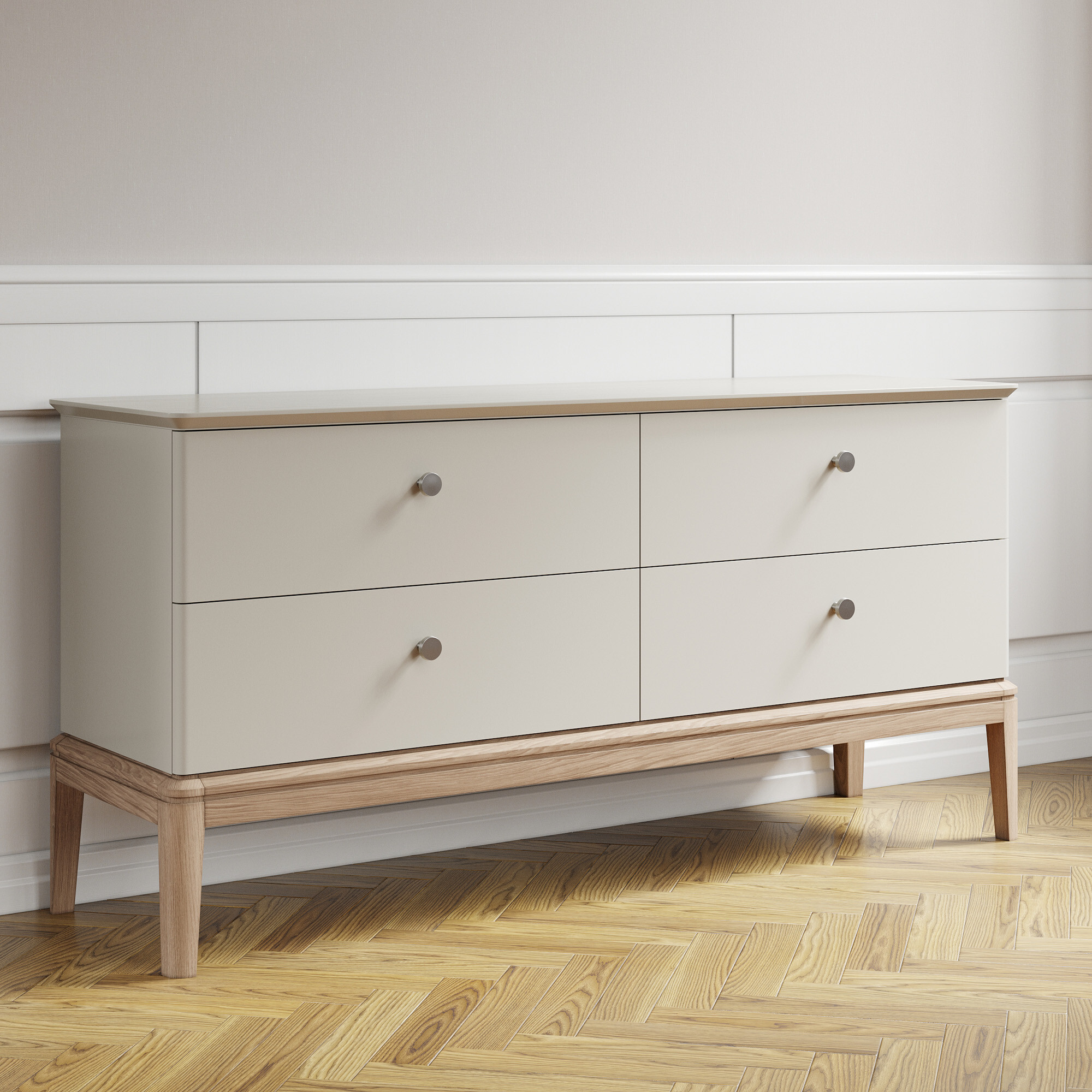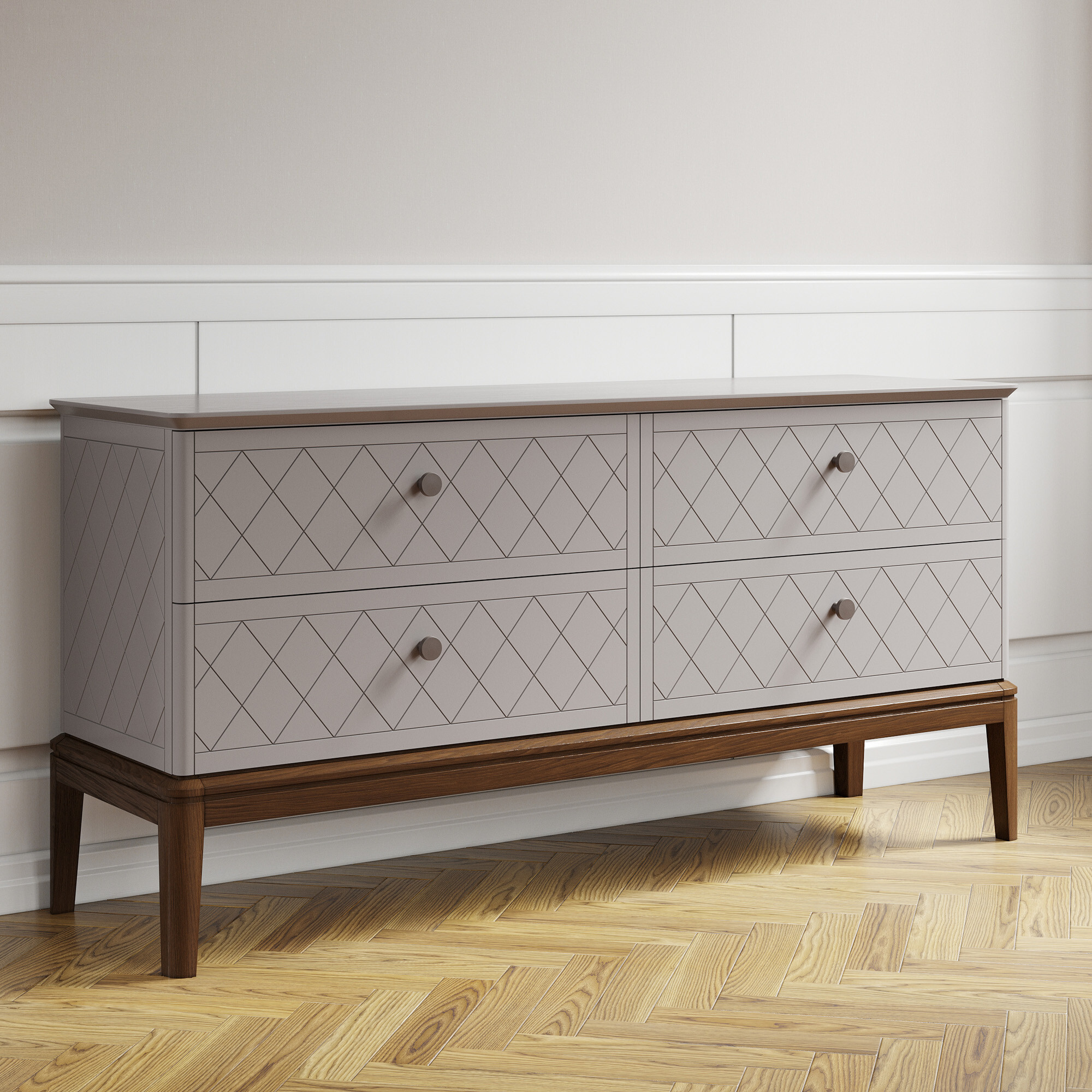 Вдохновленный ар-деко и северным модерном, этот комод воплощает лучшие черты современной классики. Плавные очертания, геометрические орнаменты и сложный декор создают выразительный образ без намека на китч. Модель оснащена четырьмя вместительными ящиками — для организованного хранения всех ваших вещей. Утонченную изысканность подчеркивают ступенчатая фрезеровка столешницы и тонированное основание из массива дуба.