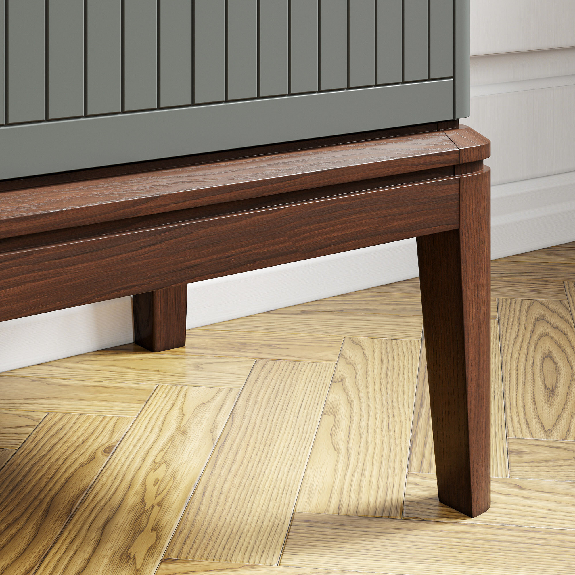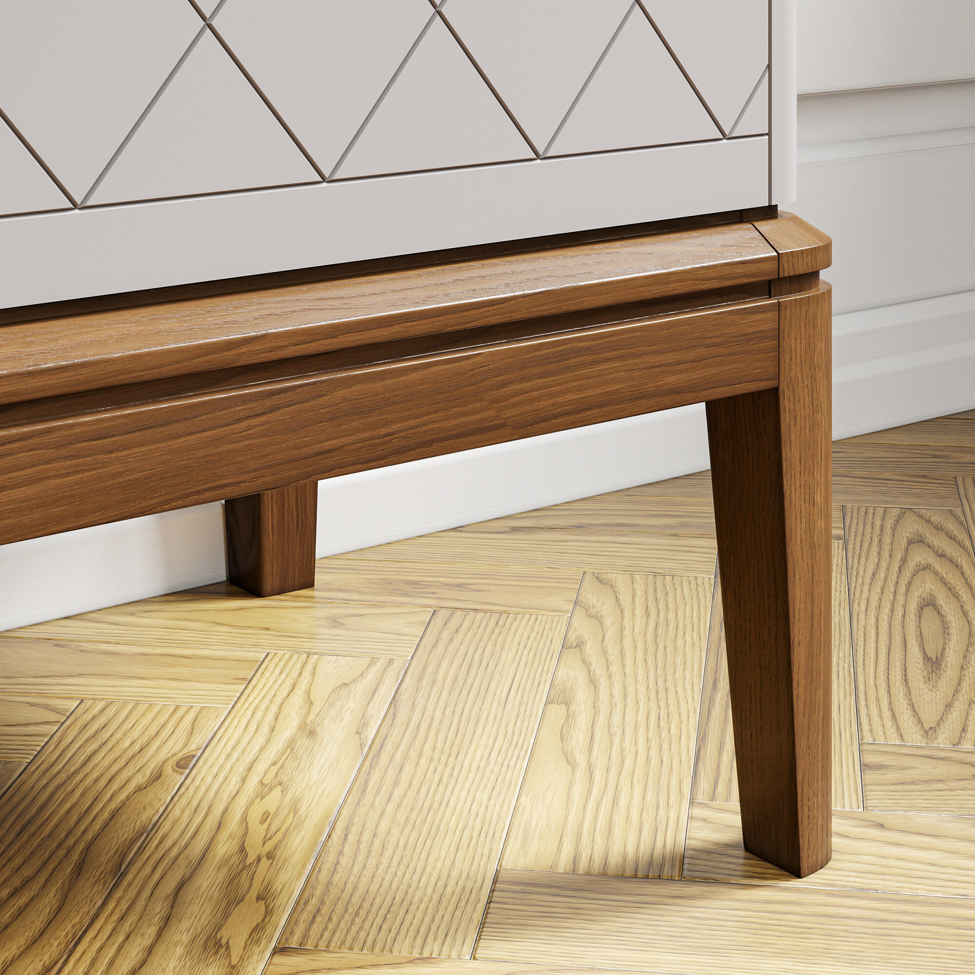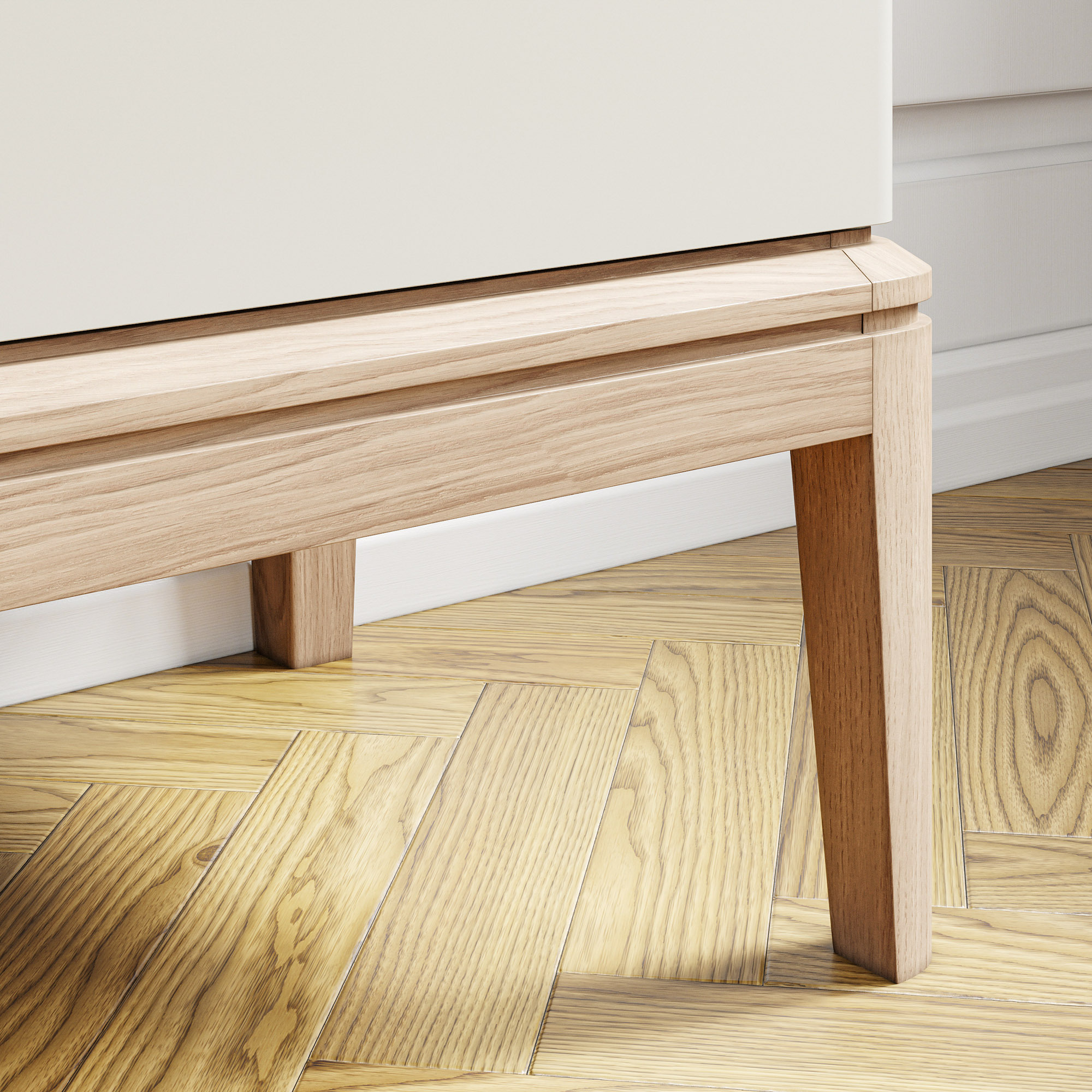 Эксклюзивные детали: массивные ручки-кнопки в четырех исполнениях и многогранные ножки и цоколь из массива дуба, обработанные вручную.