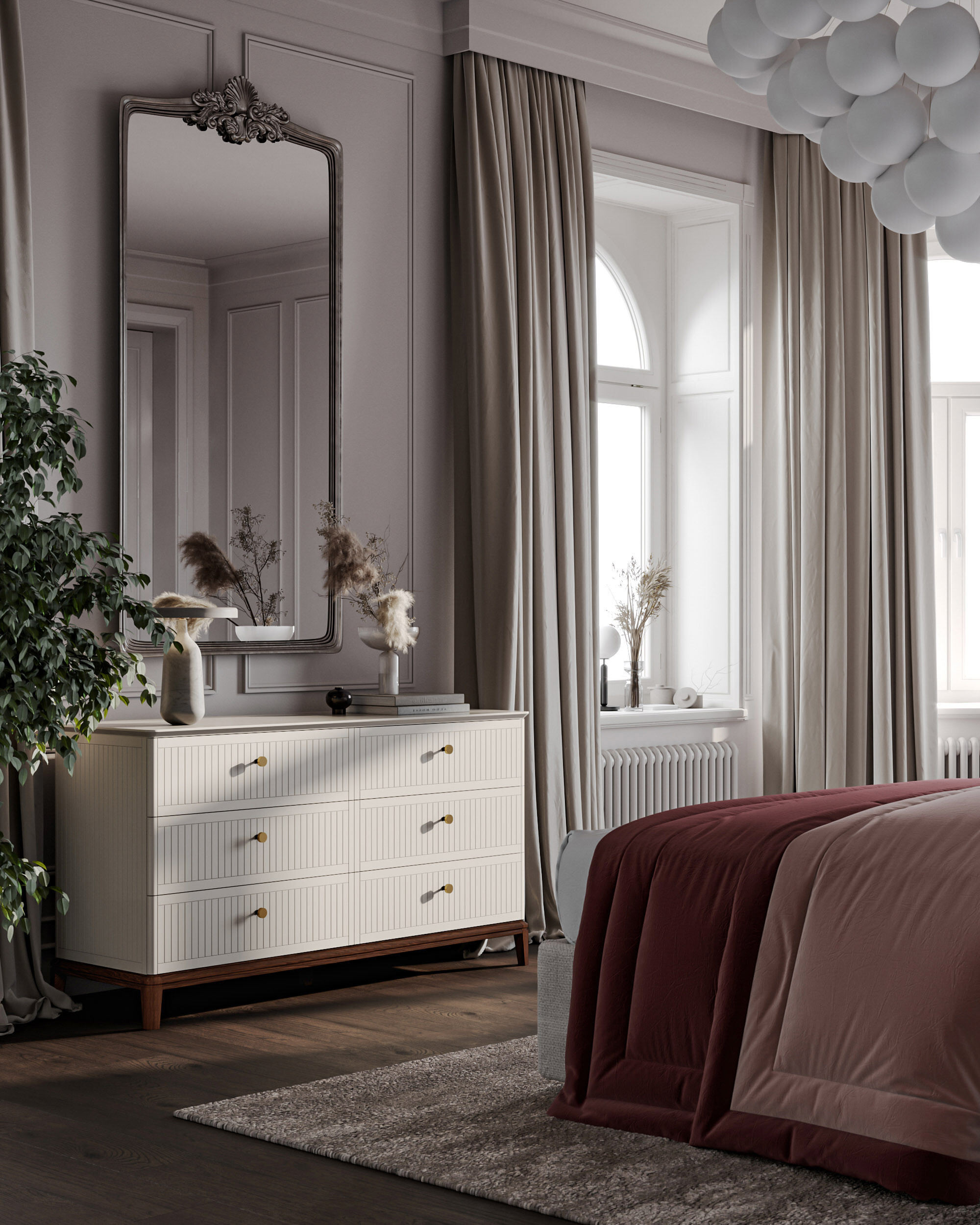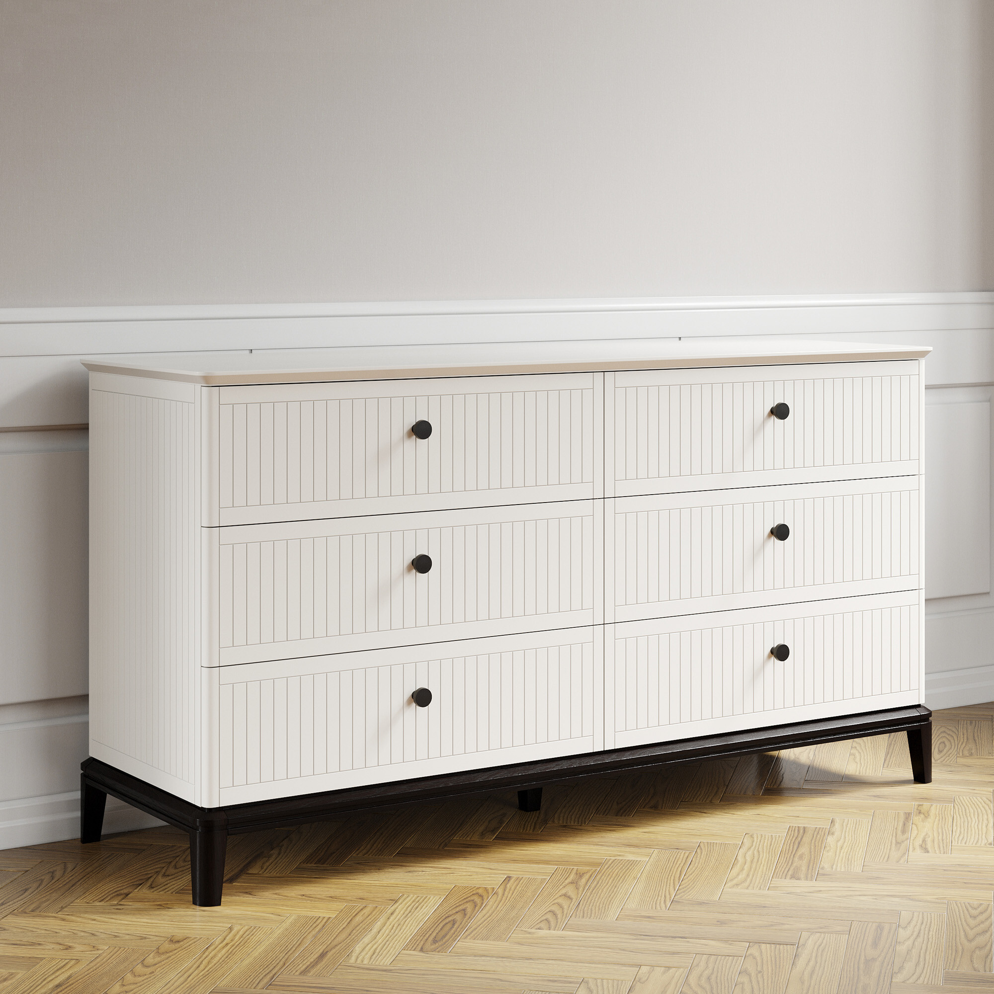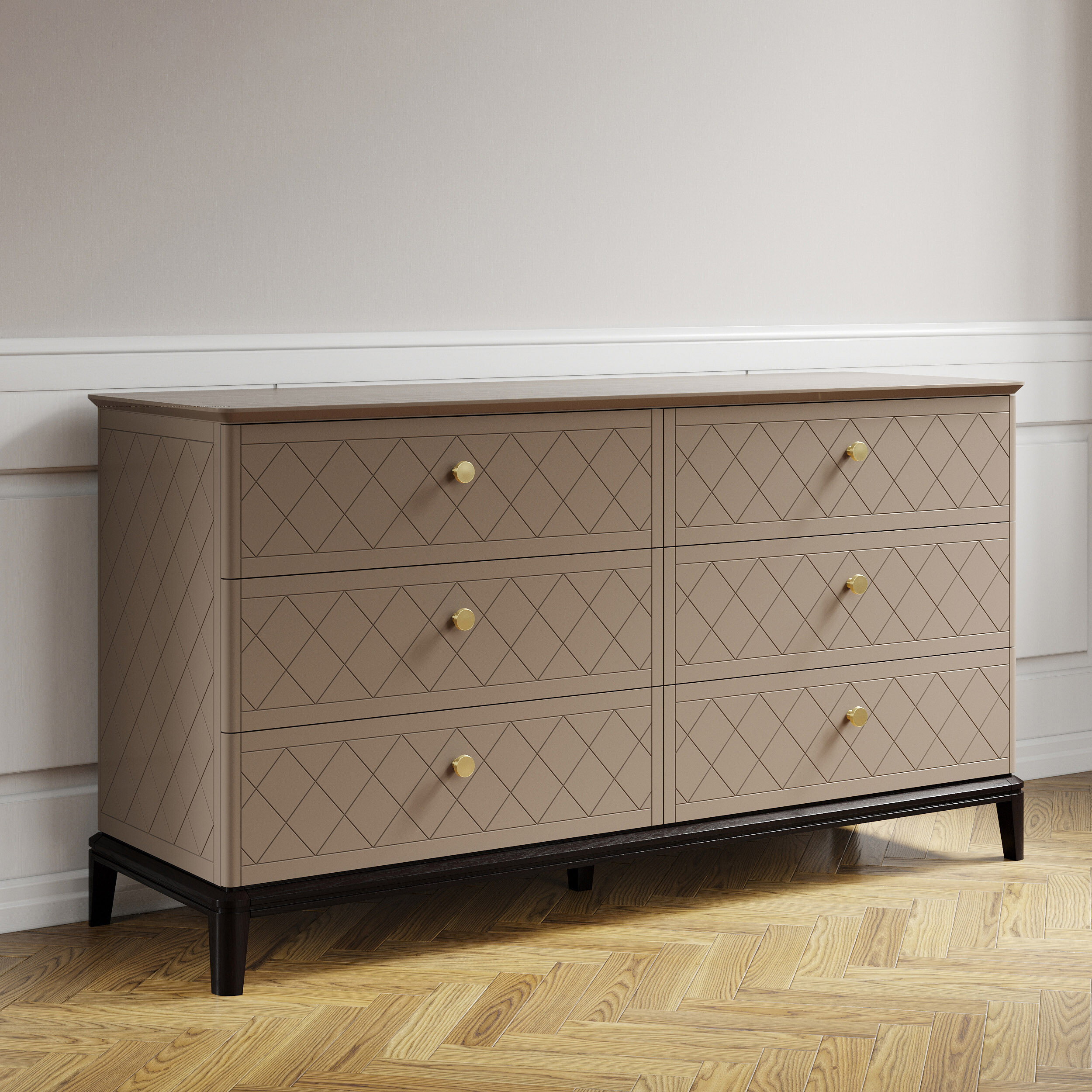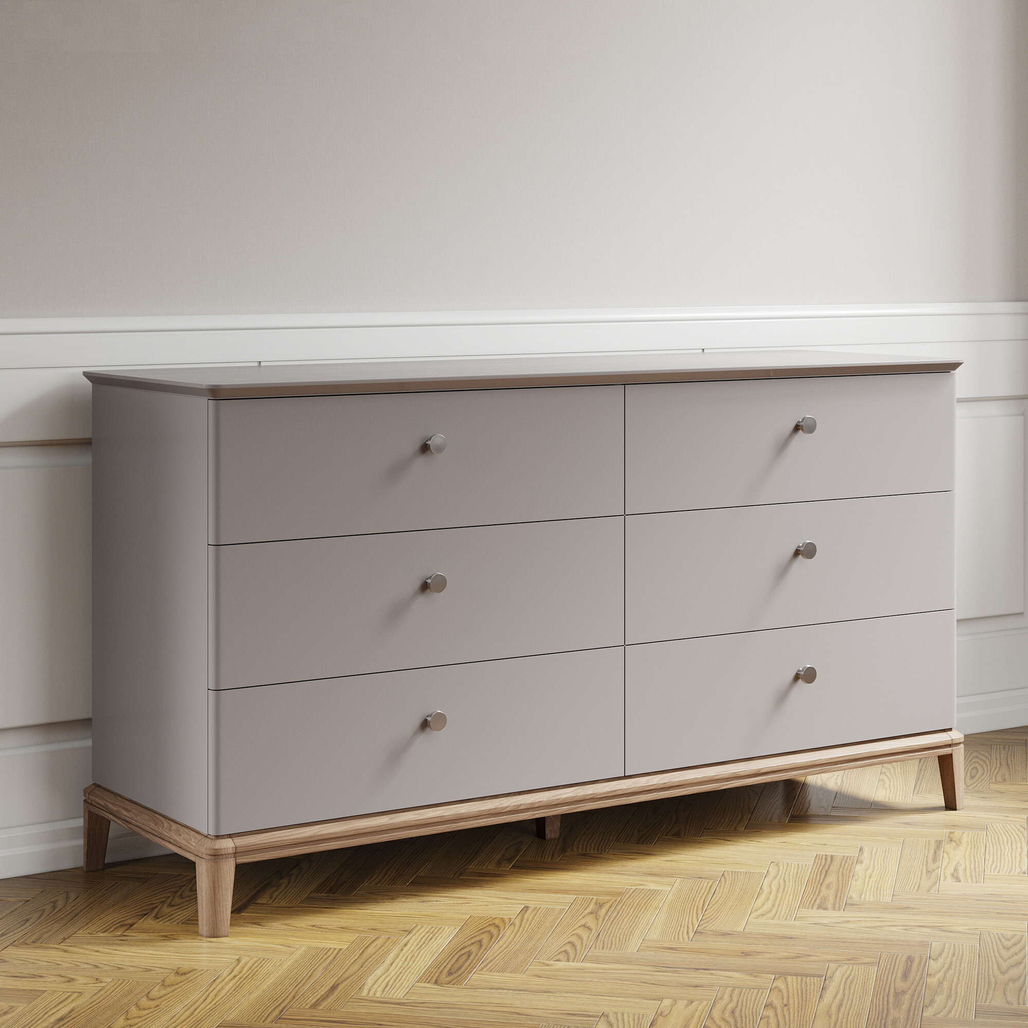 Вдохновленный ар-деко и северным модерном, этот комод воплощает лучшие черты современной классики. Плавные очертания, геометрические орнаменты и сложный декор создают выразительный образ без намека на китч. Модель оснащена шестью вместительными ящиками — для организованного хранения всех ваших вещей. Утонченную изысканность подчеркивают ступенчатая фрезеровка столешницы и тонированное основание из массива дуба.