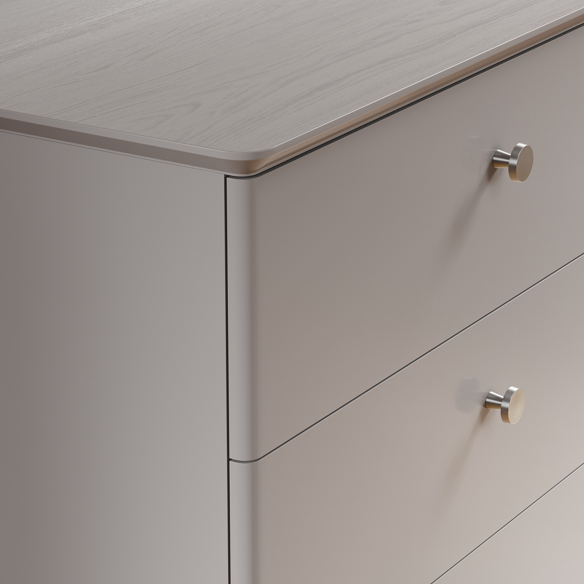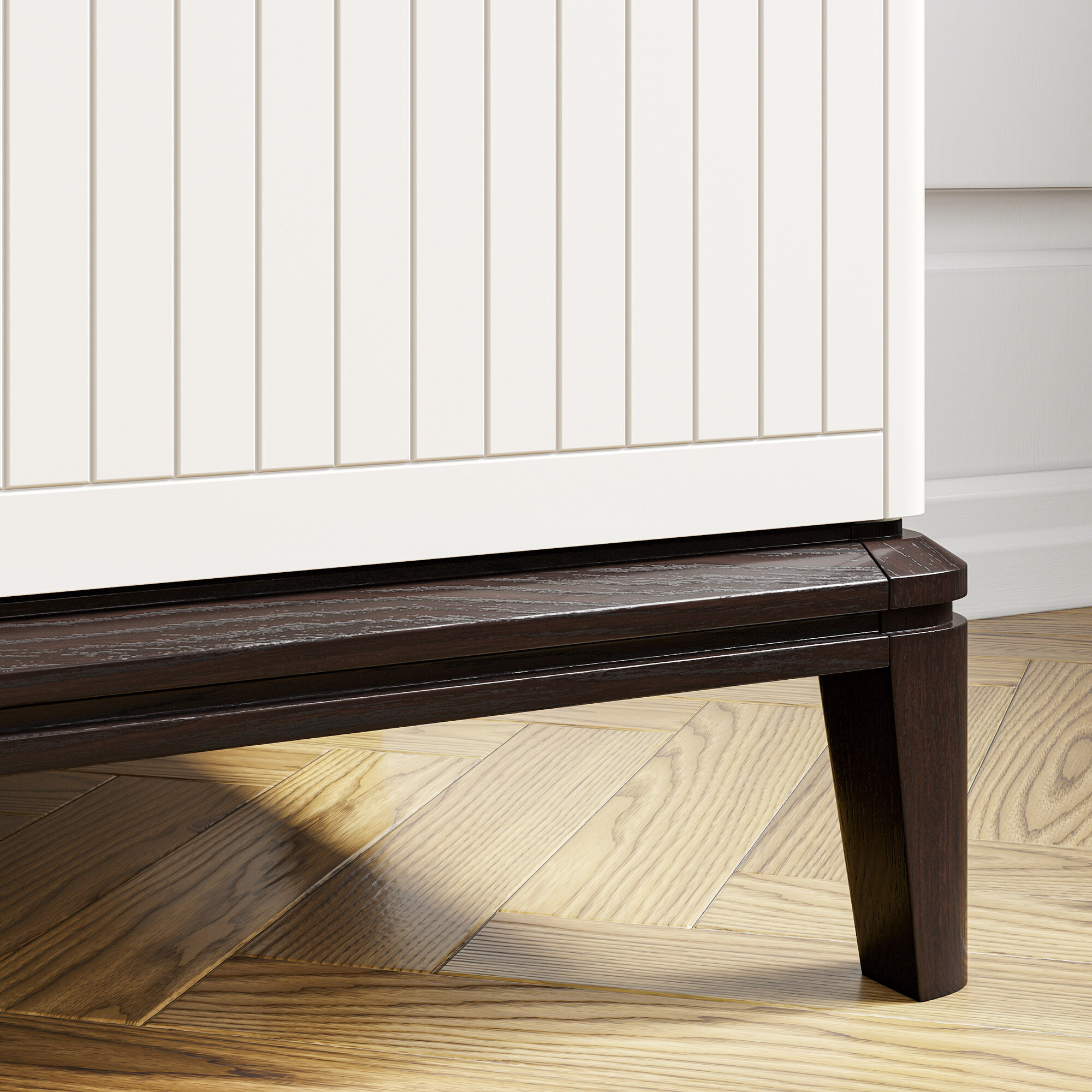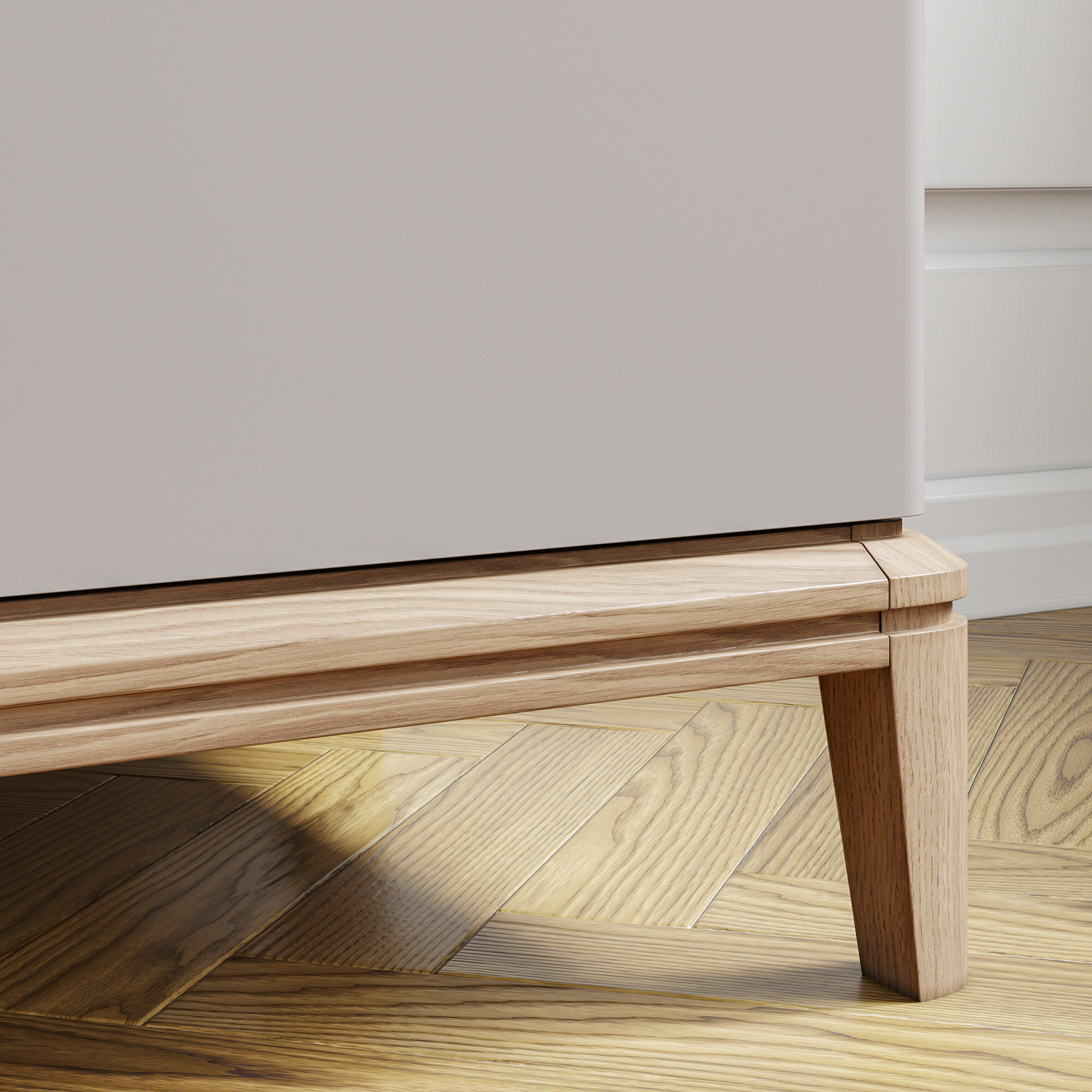 Эксклюзивные детали: массивные ручки-кнопки в четырех исполнениях и многогранные ножки и цоколь из массива дуба, обработанные вручную.