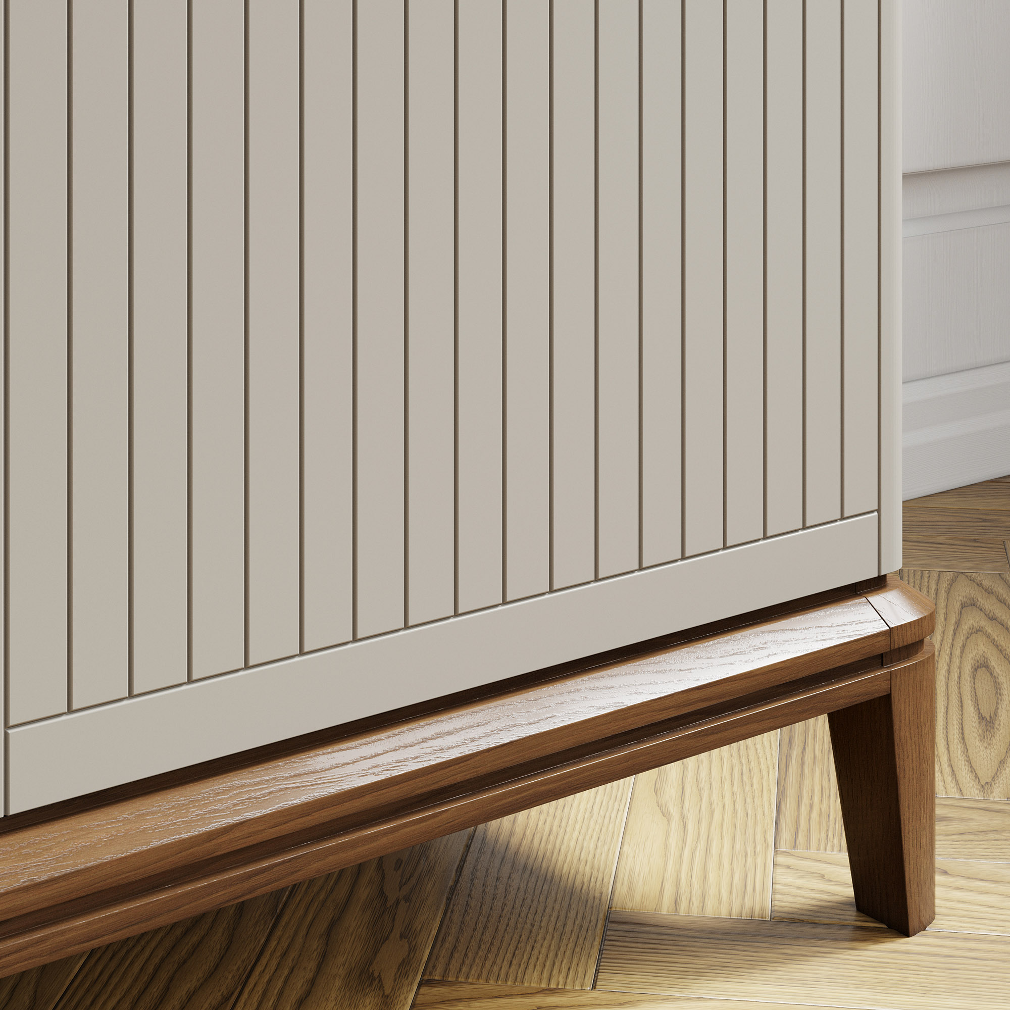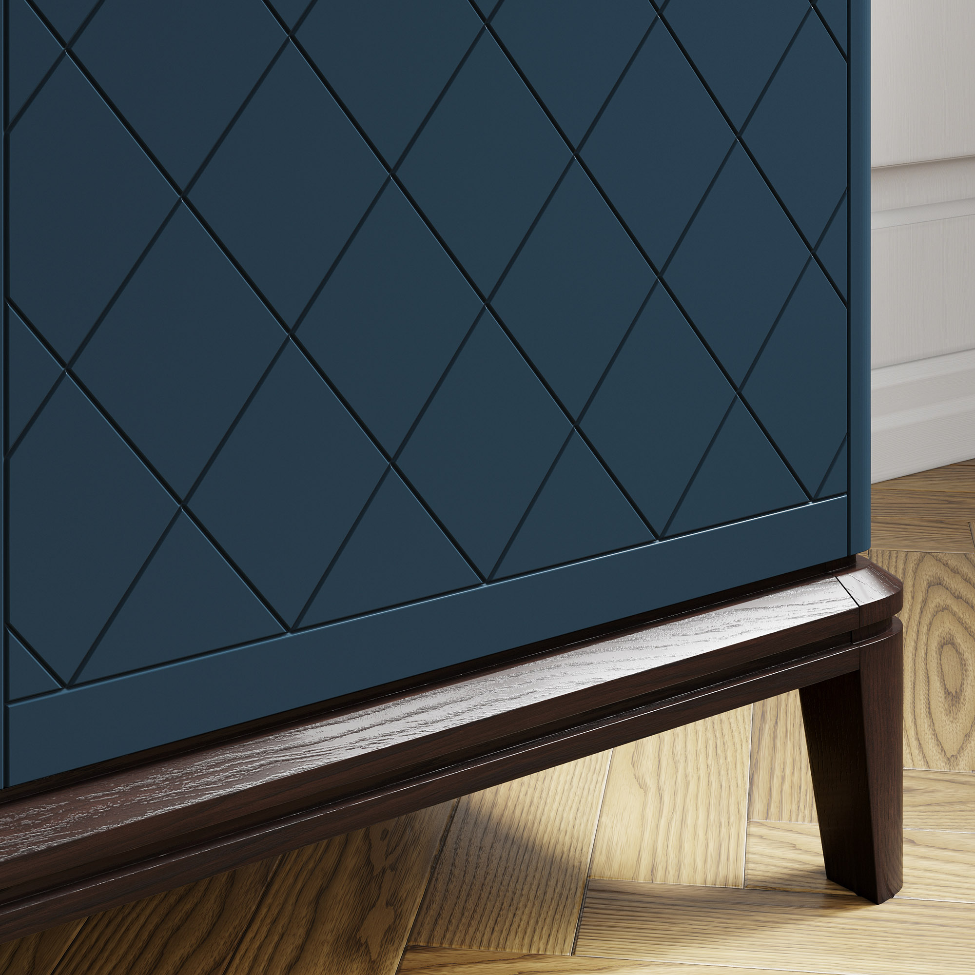 Эксклюзивные детали: массивные ручки-кнопки в четырех исполнениях и многогранные ножки и цоколь из массива дуба, обработанные вручную.