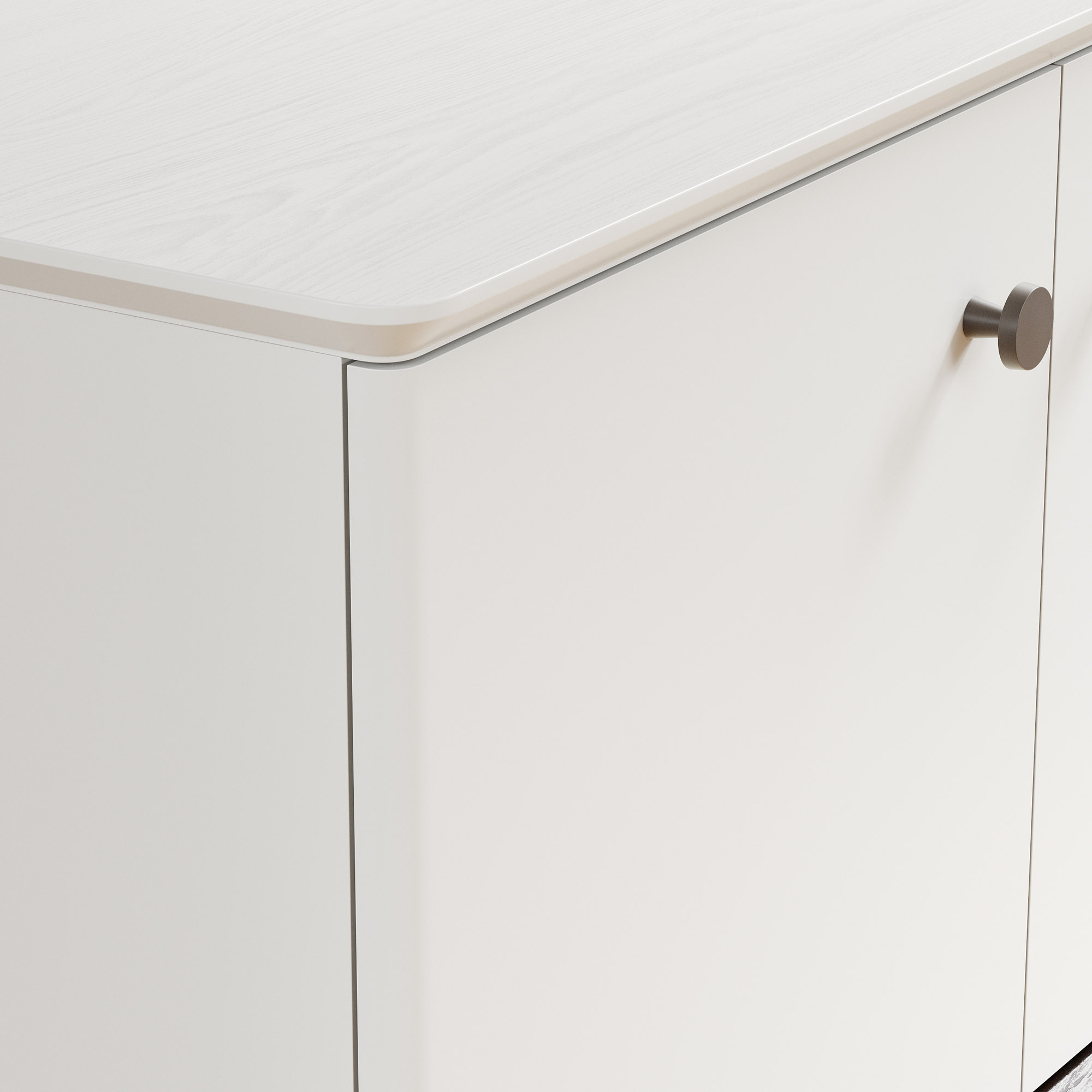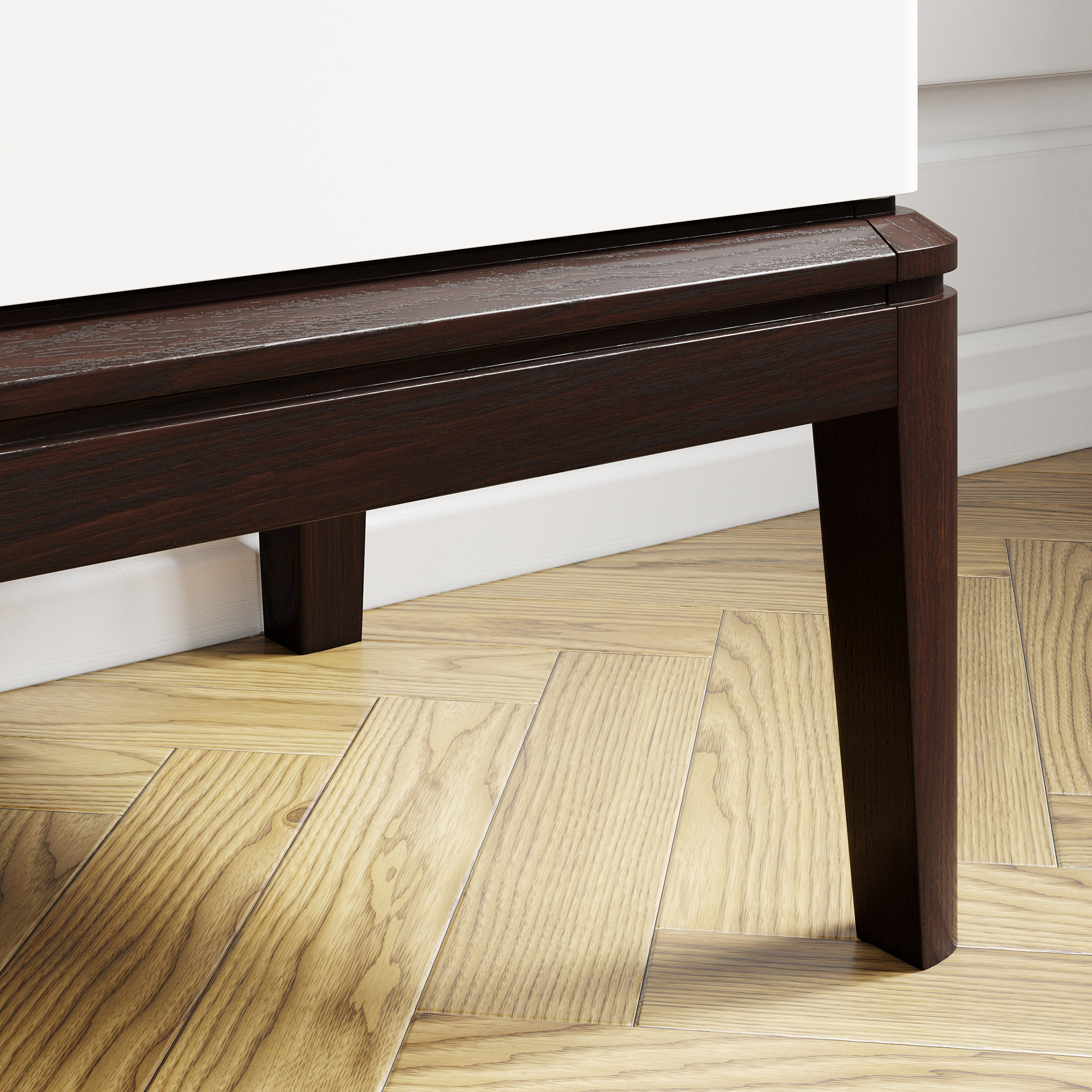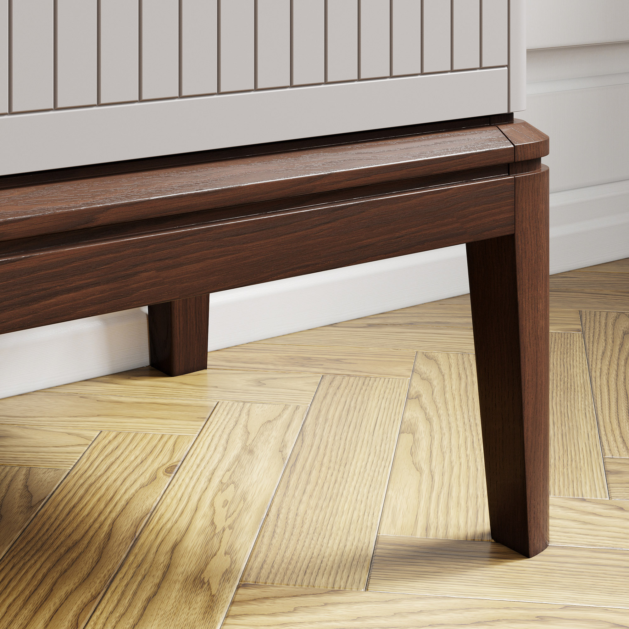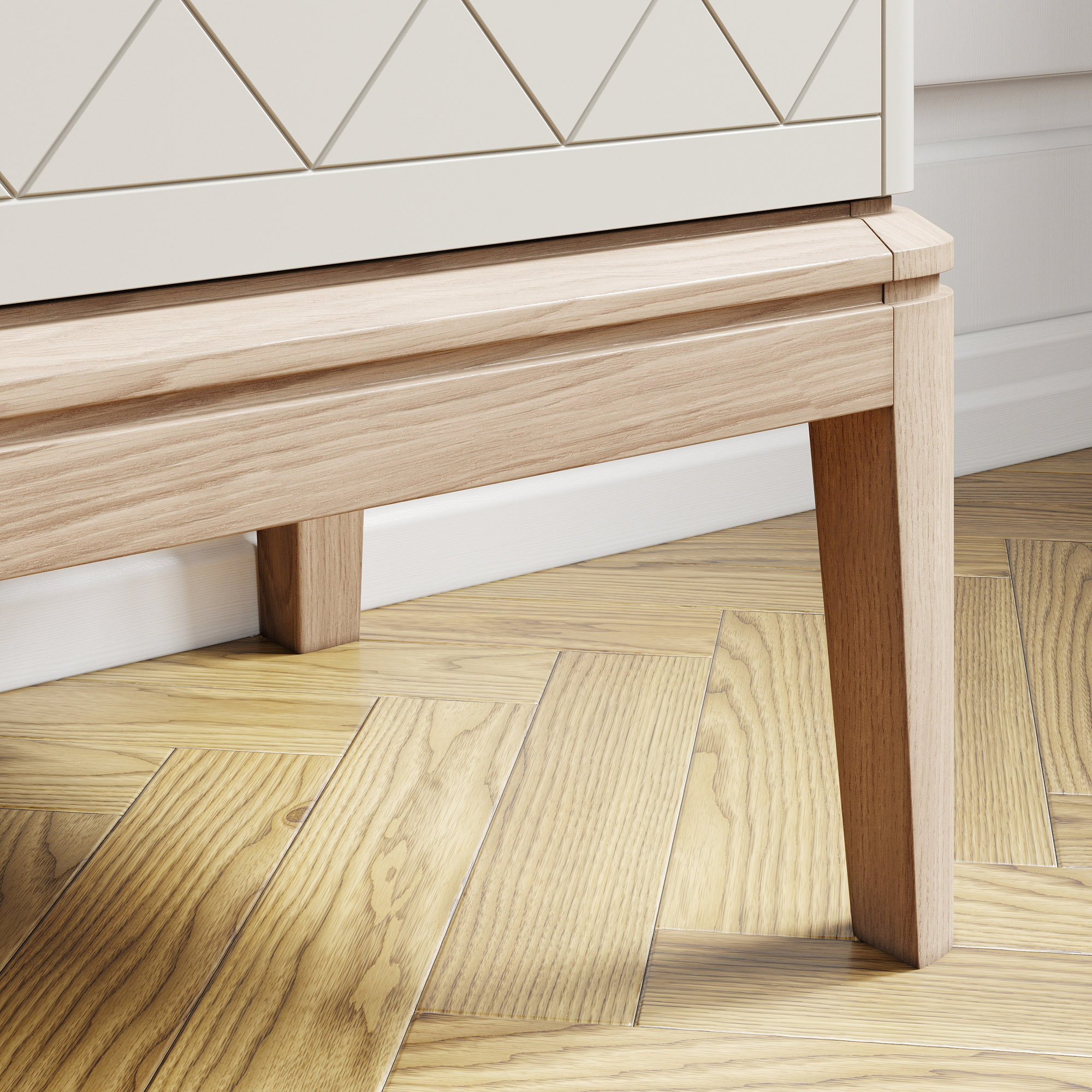 Эксклюзивные детали: массивные ручки-кнопки в четырех исполнениях и многогранные ножки и цоколь из массива дуба, обработанные вручную.
