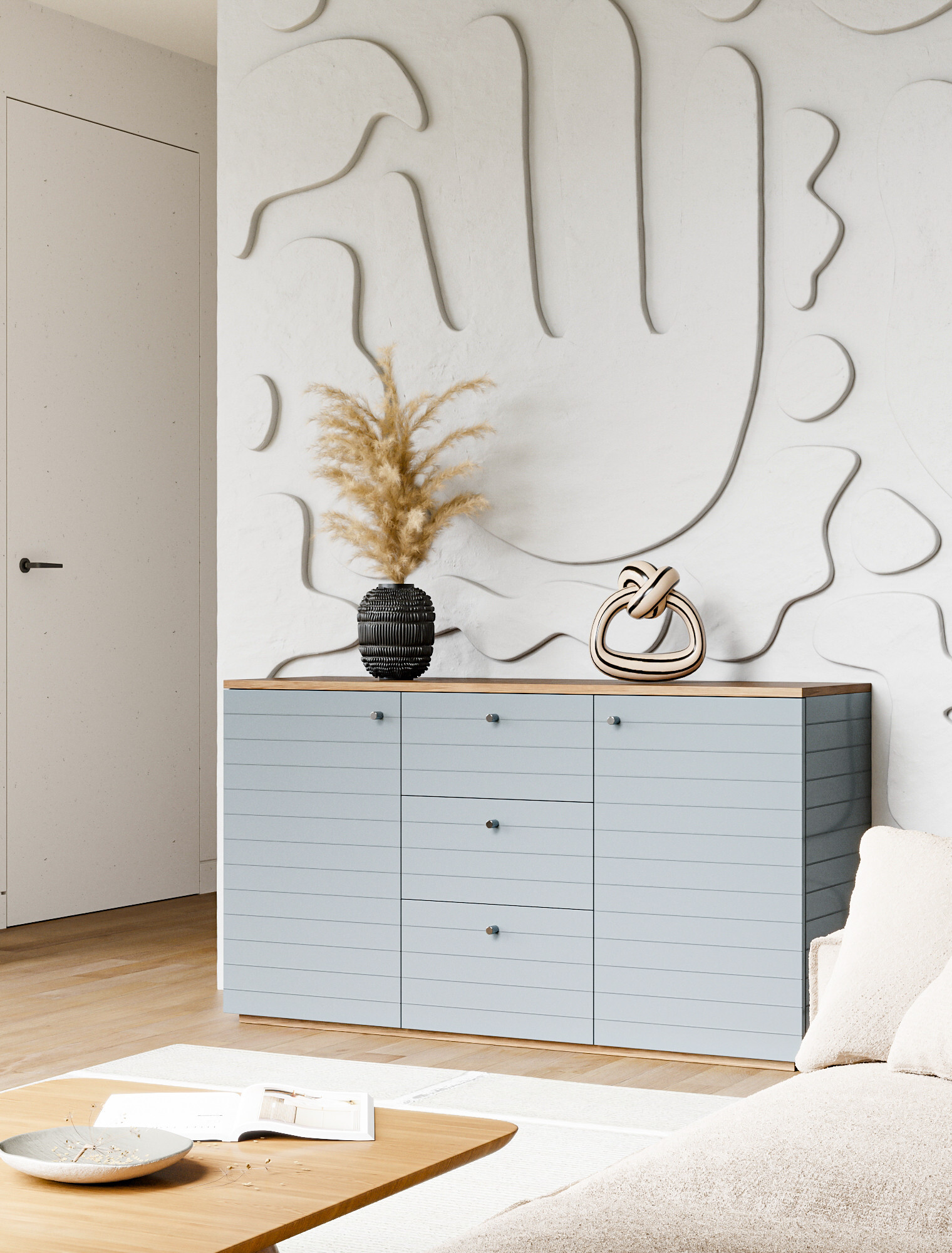 Лаконичный комод ML043 с двумя просторными секциями и тремя выдвижными ящиками поможет расположить огромное количество личных вещей, которые необходимо держать под рукой. Декоративный узор размещен на фасадах и боковых поверхностях комода, дополняя неизменную функциональность элегантными акцентами.