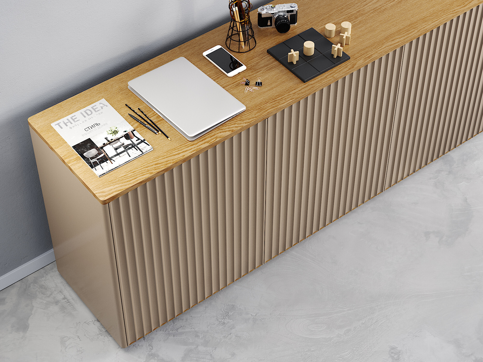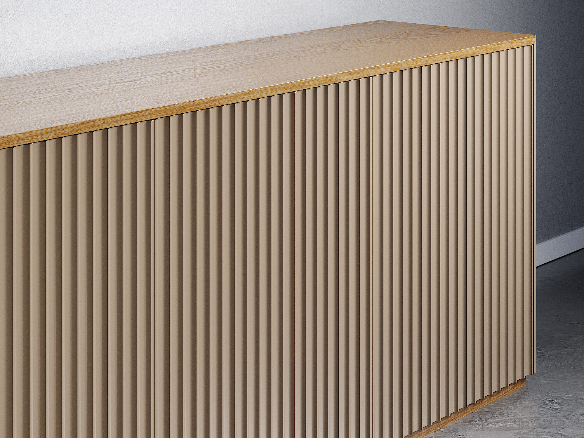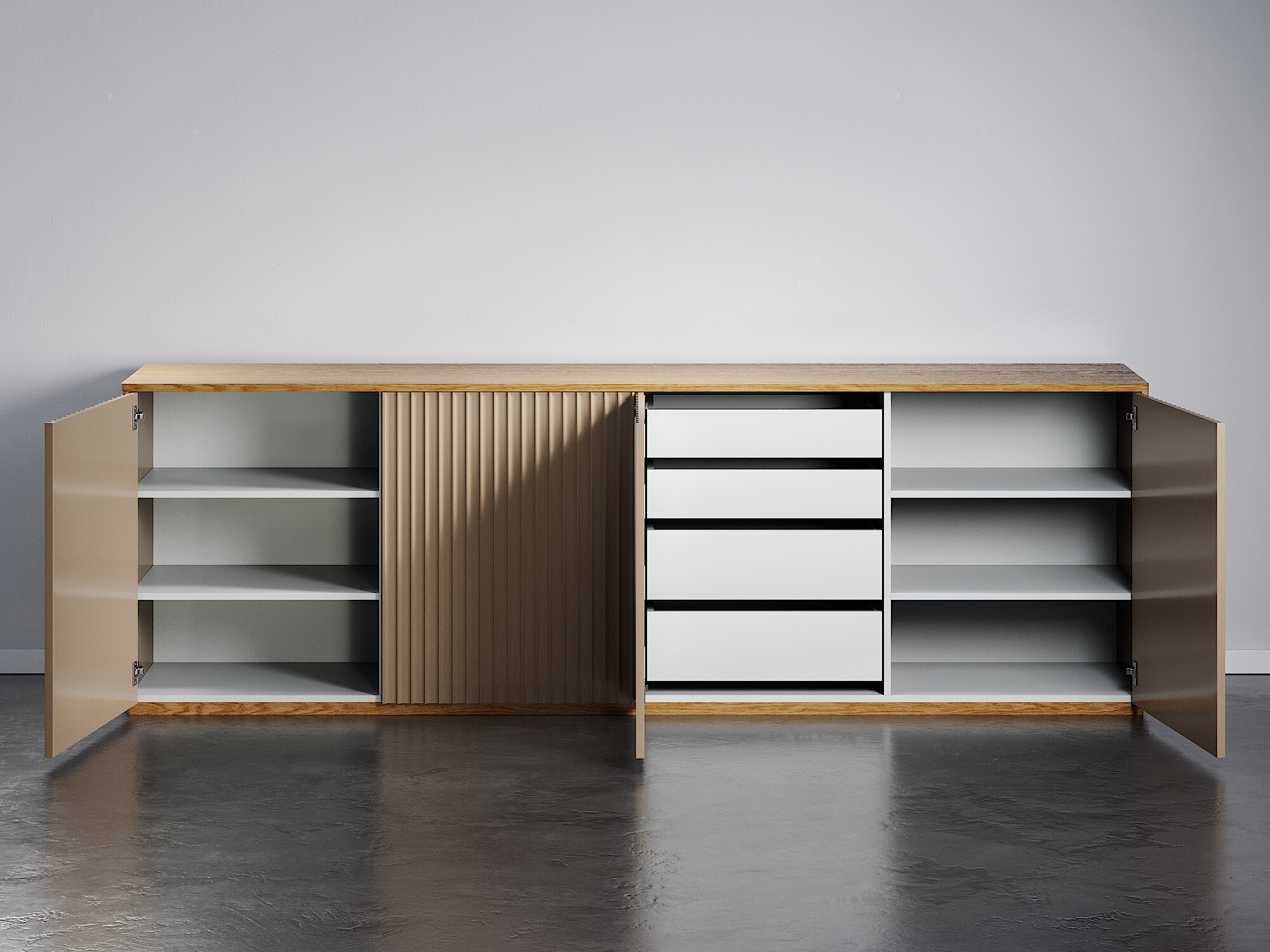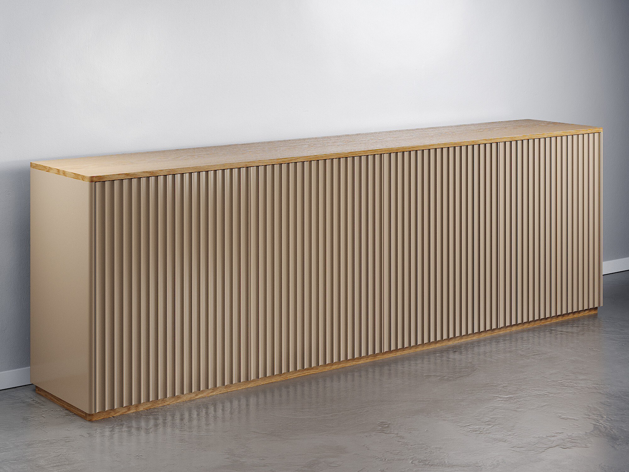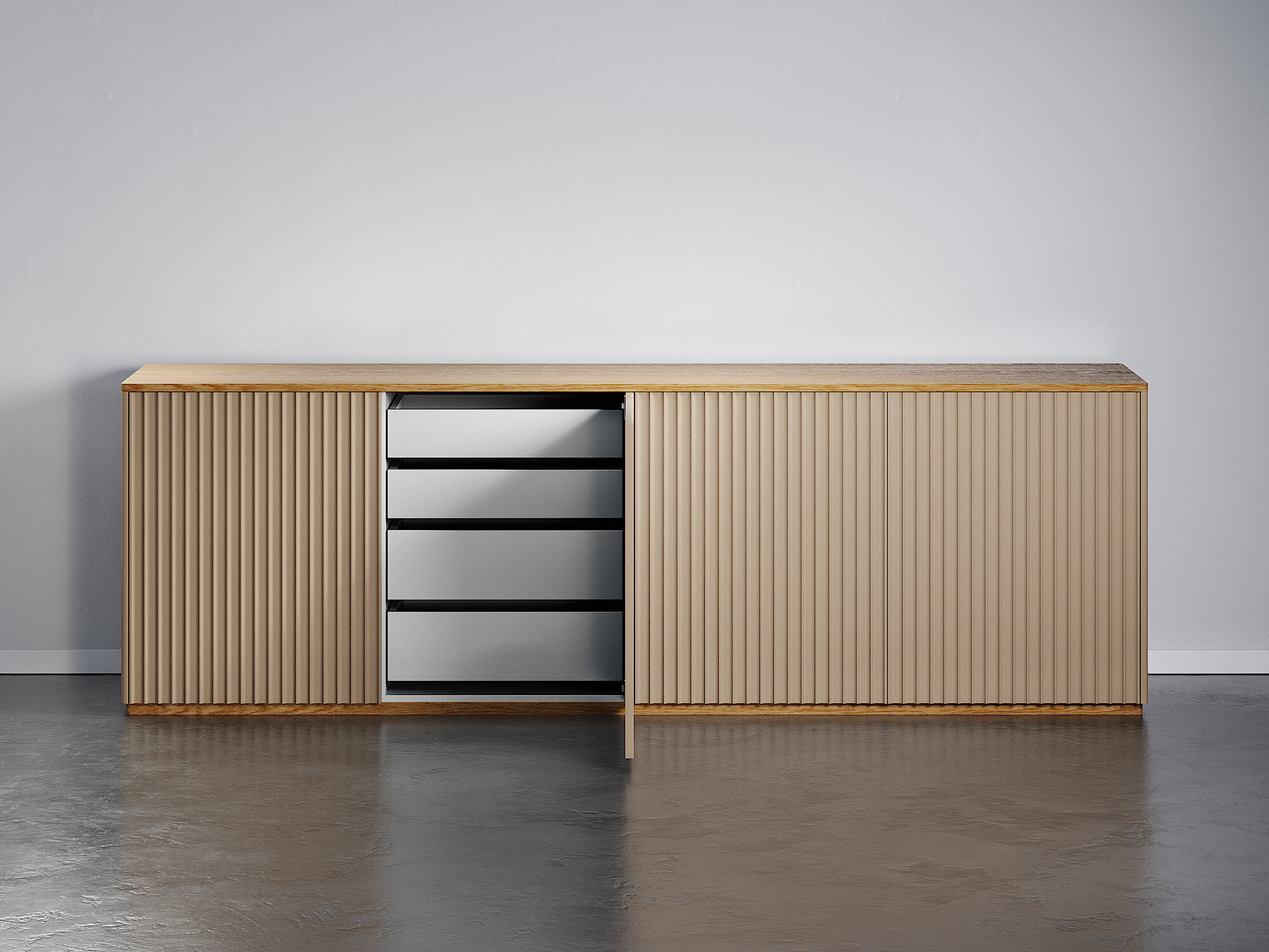 Модель для тех, кто ценит продуманную организацию и безупречную эстетику. Глубокая вертикальная фрезеровка на фасадах создает динамичную игру света и тени, а система push-to-open позволяет открывать дверцы и ящики легким нажатием. Универсальная конструкция сочетает разные форматы хранения, идеально подходя для спальни, прихожей или гостиной. Комод на цоколе из массива дуба,