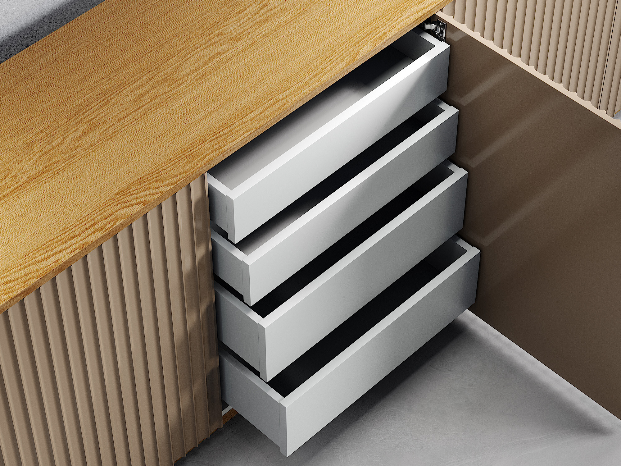 • Премиальная фурнитура: скрытые направляющие Hettich с системой «push-to-open».