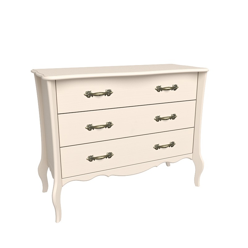 Комод с тремя ящиками из массива сосны. Покрытие - укрывистый бежевый воск, структура древесины почти не просматривается. Выдвижные ящики на направляющих Blum с доводчиками.