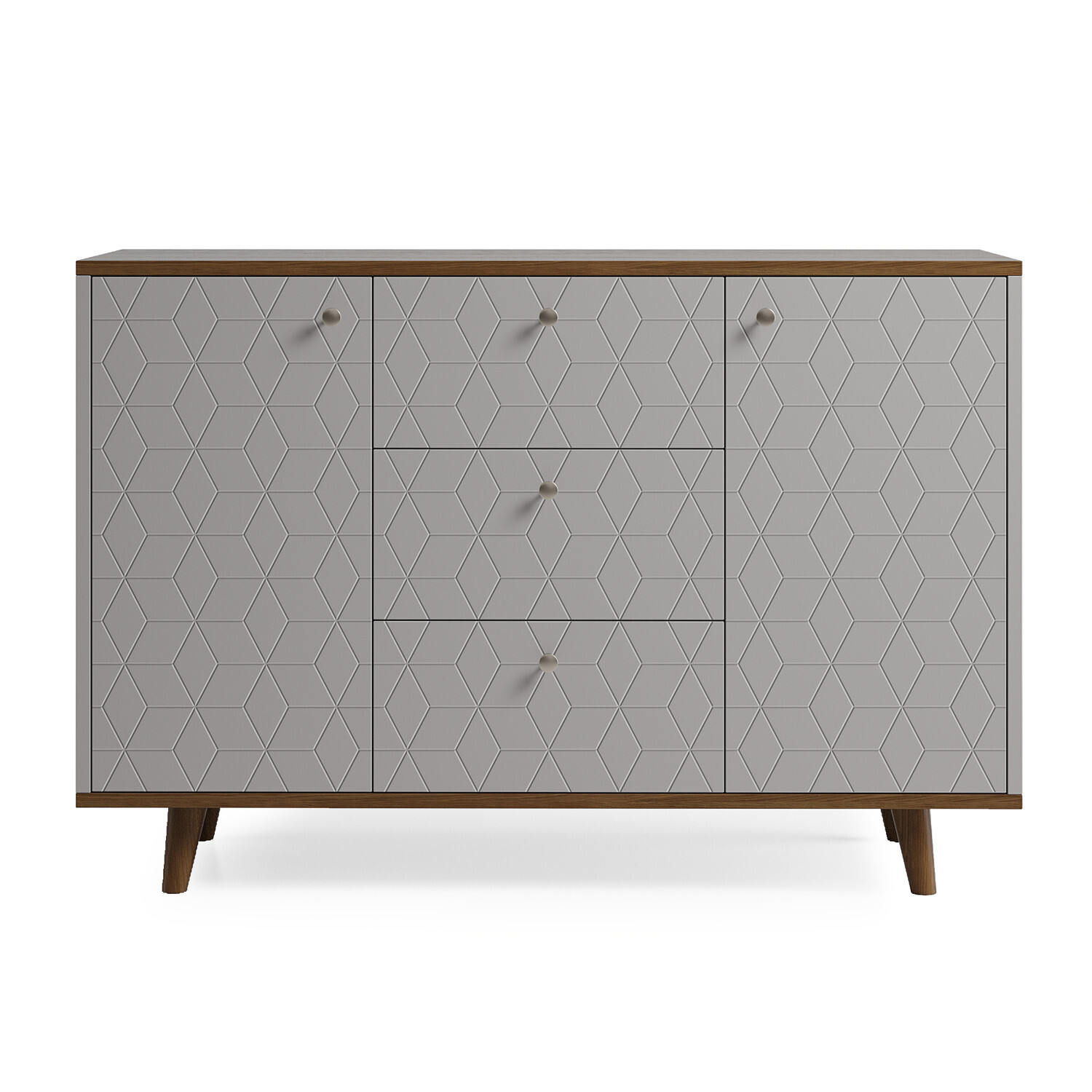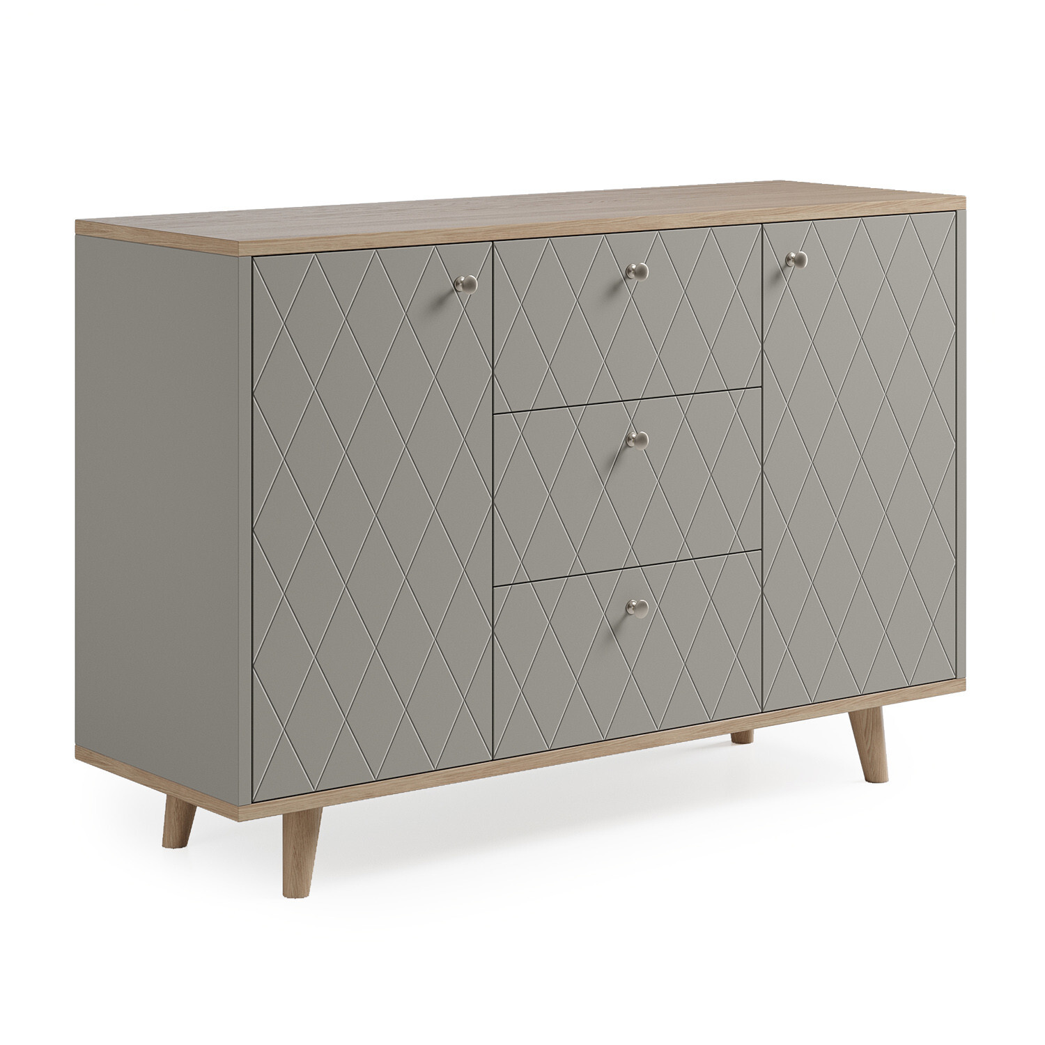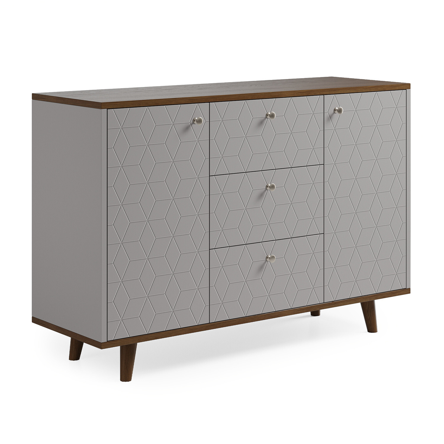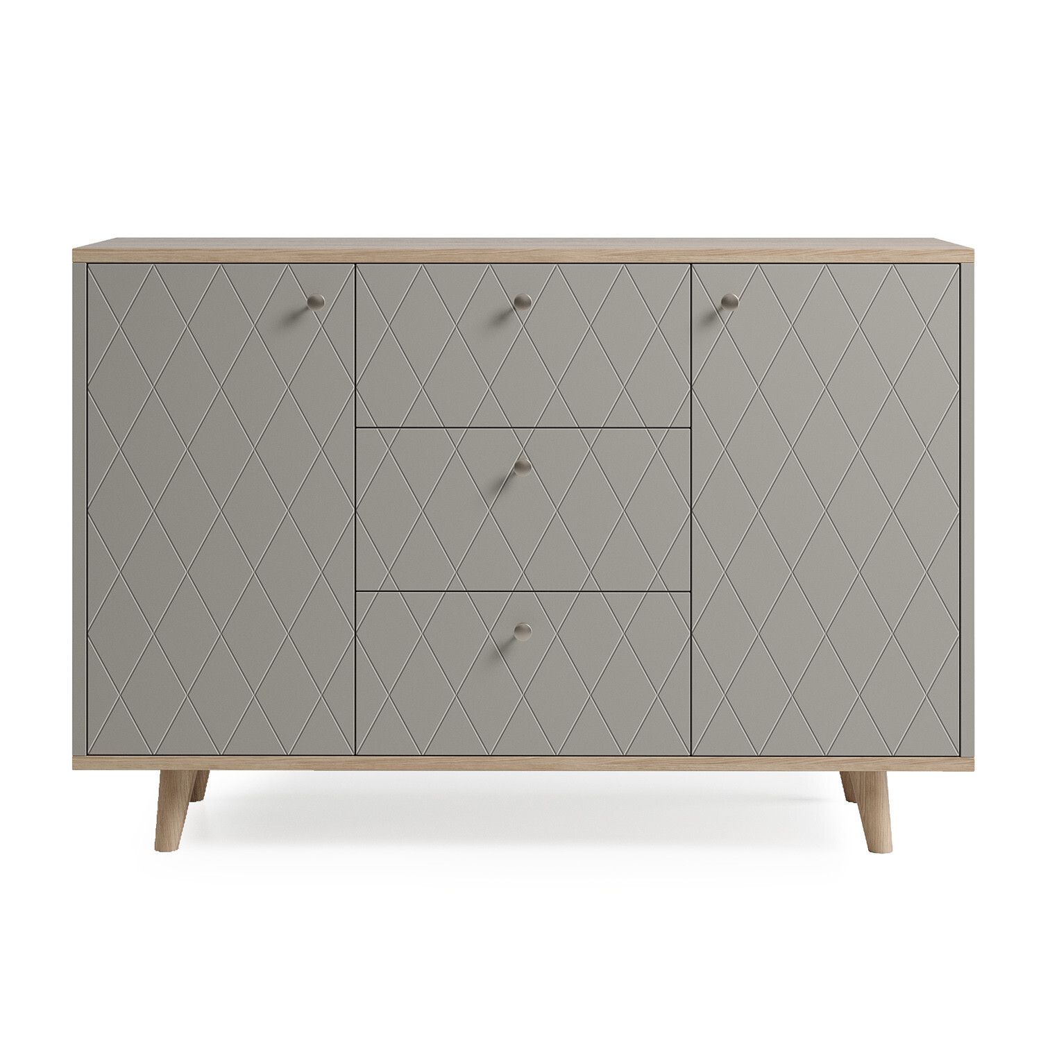 Практичное и элегантное решение для хранения: две просторные боковые секции с полками и три вместительных выдвижных ящика по центру. Европейская фурнитура обеспечивает плавное и бесшумное закрывание без усилий. Лаконичный дизайн с декоративной гравировкой фасадов, натуральный шпон дуба на основании и ножки из массива дуба создают универсальный предмет интерьера в стиле mid-century. Выберите идеальное исполнение из более чем 2500 вариантов отделки для гармоничного дополнения вашего пространства.