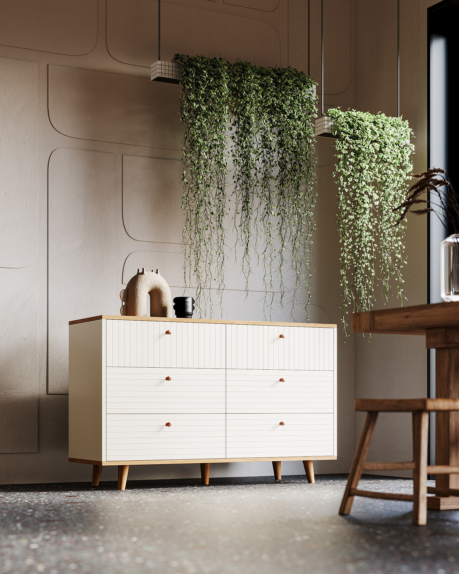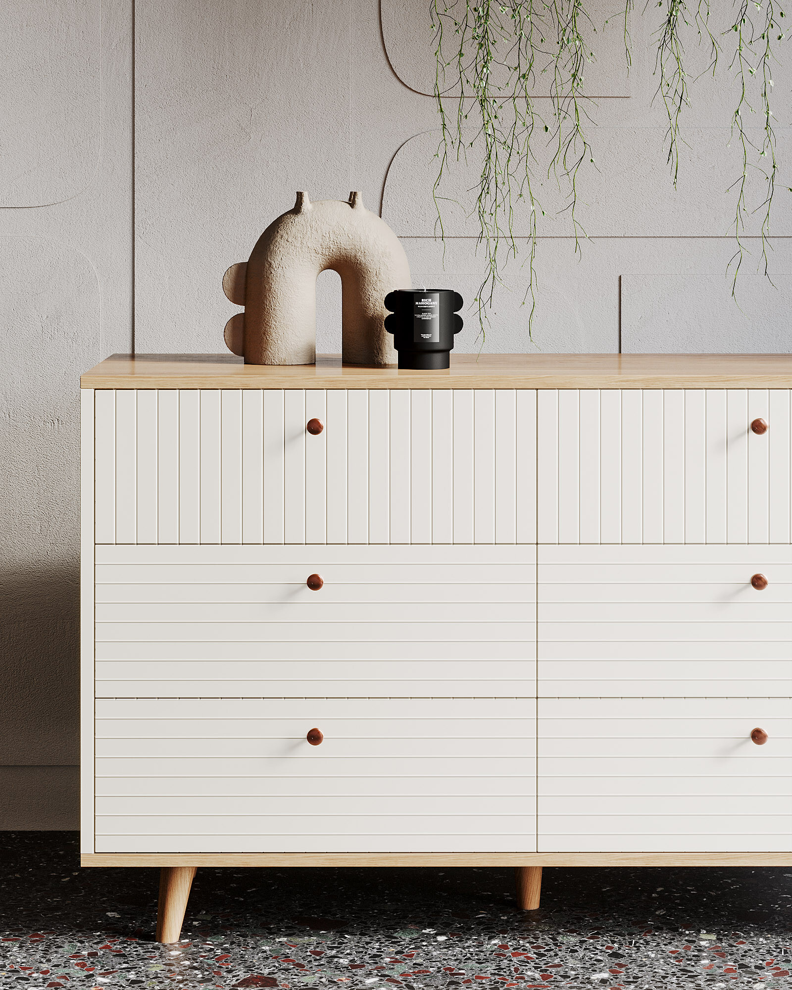 Идеальная организация пространства и элегантный акцент в интерьере. Шесть вместительных ящиков из прочного ЛДСП выдерживают нагрузку до 25 кг каждый, позволяя разместить даже объемные вещи. Продуманные габариты и регулируемая система хранения помогают использовать каждый сантиметр эффективно. Лаконичный дизайн с объемной гравировкой фасадов, натуральный шпон дуба на основании и ножки из массива дуба подчеркивают стиль mid-century. Европейская фурнитура обеспечивает плавное и бесшумное закрывание. Выберите исполнение из более чем 2500 вариантов отделки для гармоничного дополнения вашего пространства.