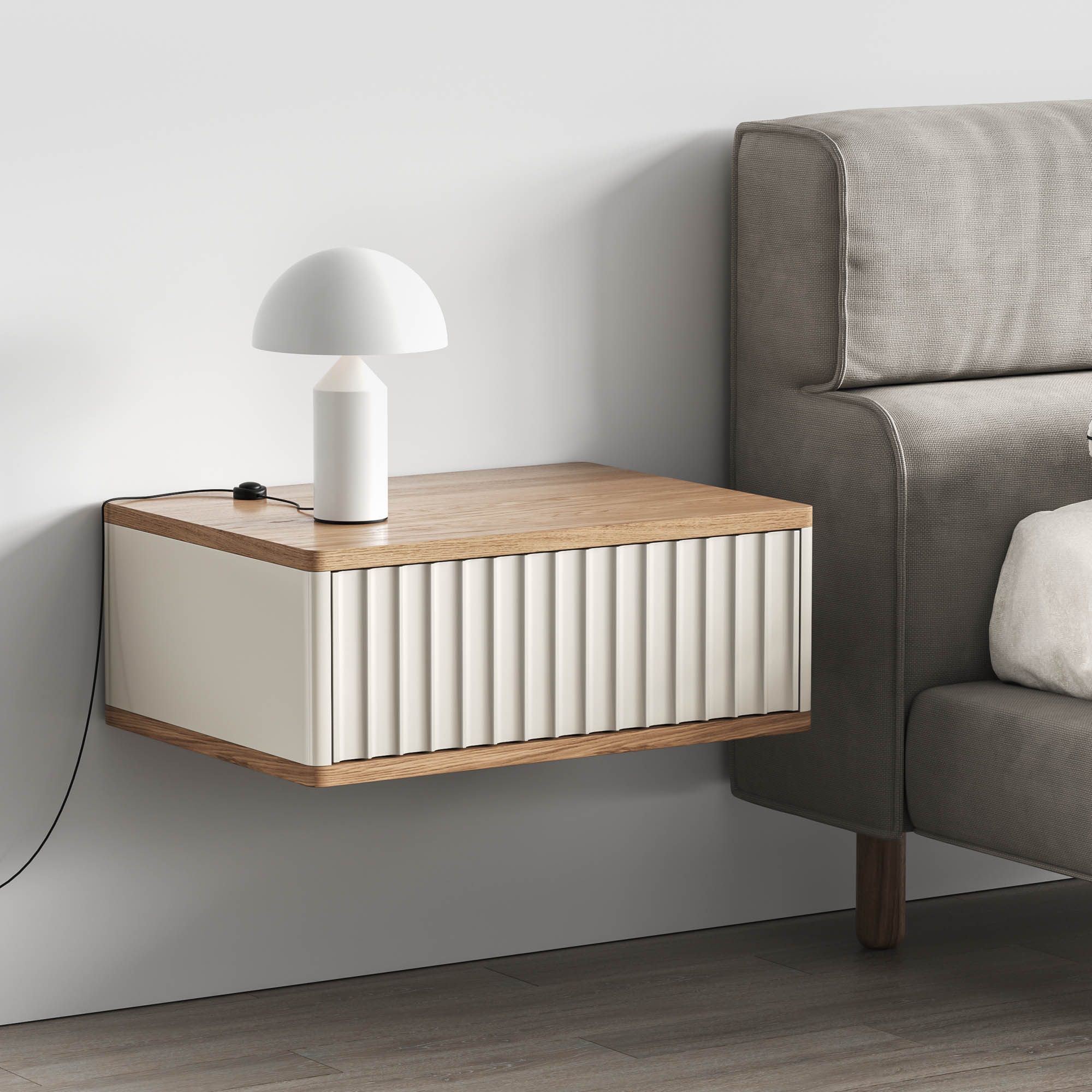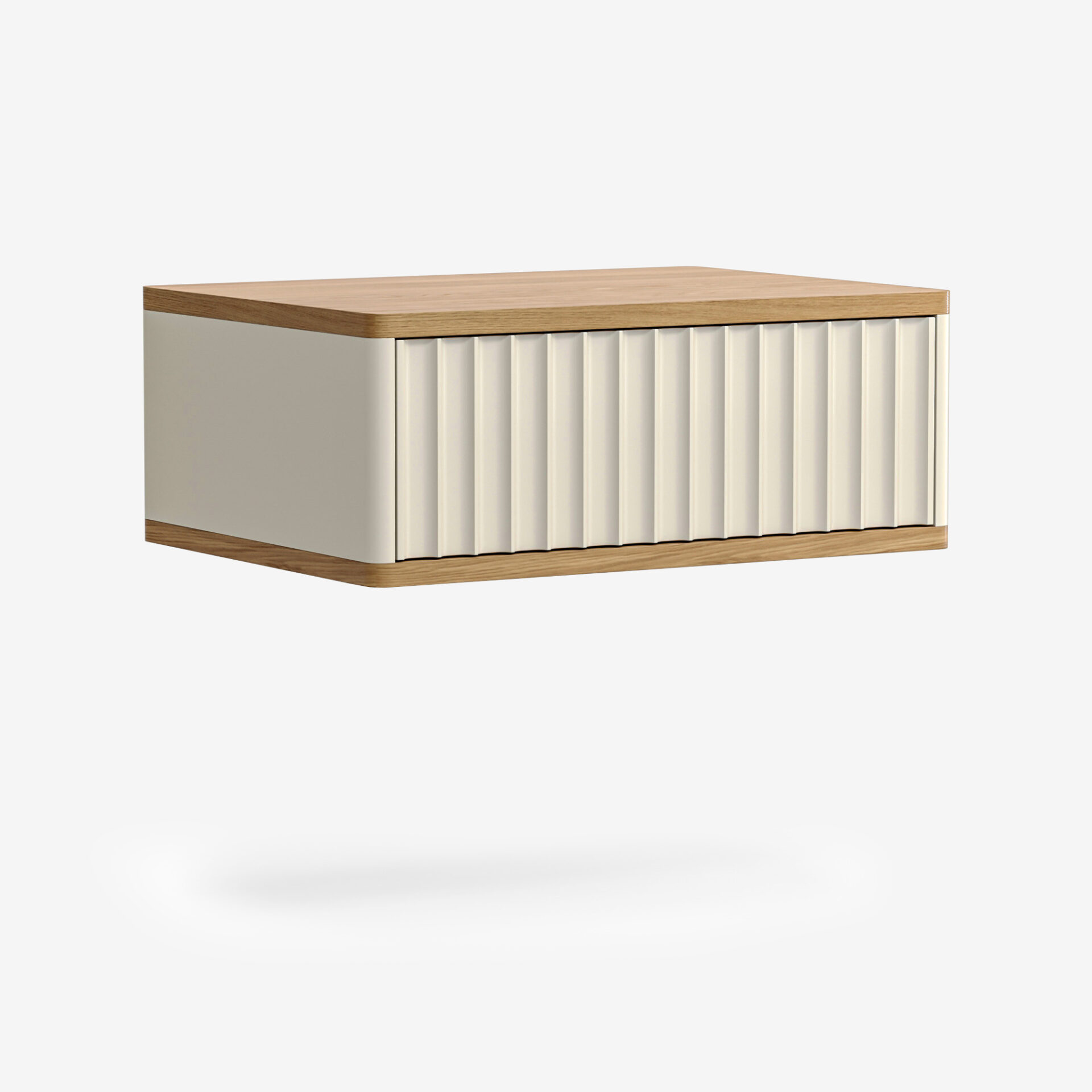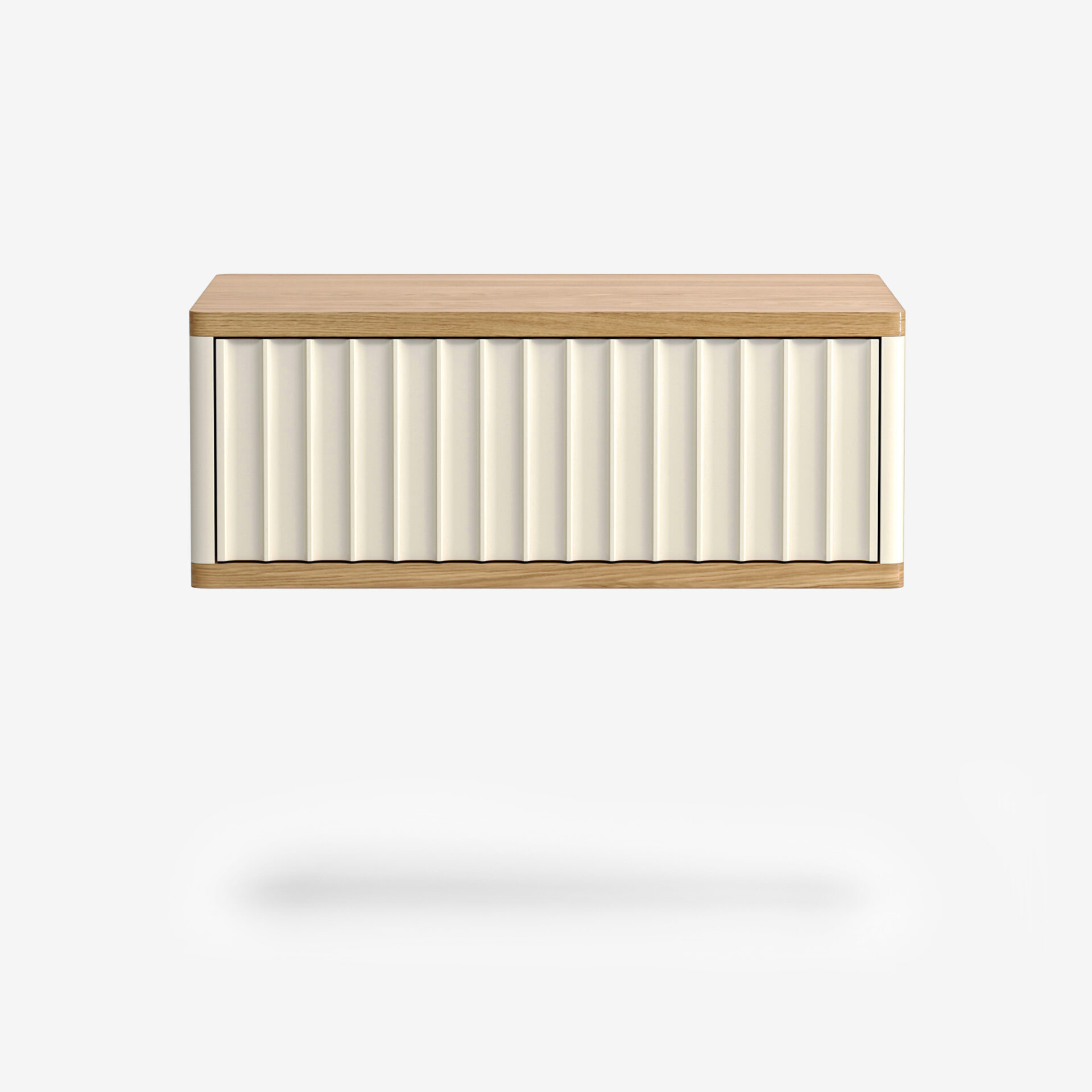 Компактная модель для тех, кто ценит строгую современную эстетику и визуальную легкость. Глубокая вертикальная фрезеровка на фасадах создает динамичную игру света и тени, а система push-to-open позволяет открывать ящики легким нажатием. Подвесная конструкция парит над полом, создавая ощущение невесомости и порядка, идеально подходя для прихожей, гостиной или в качестве туалетного столика.