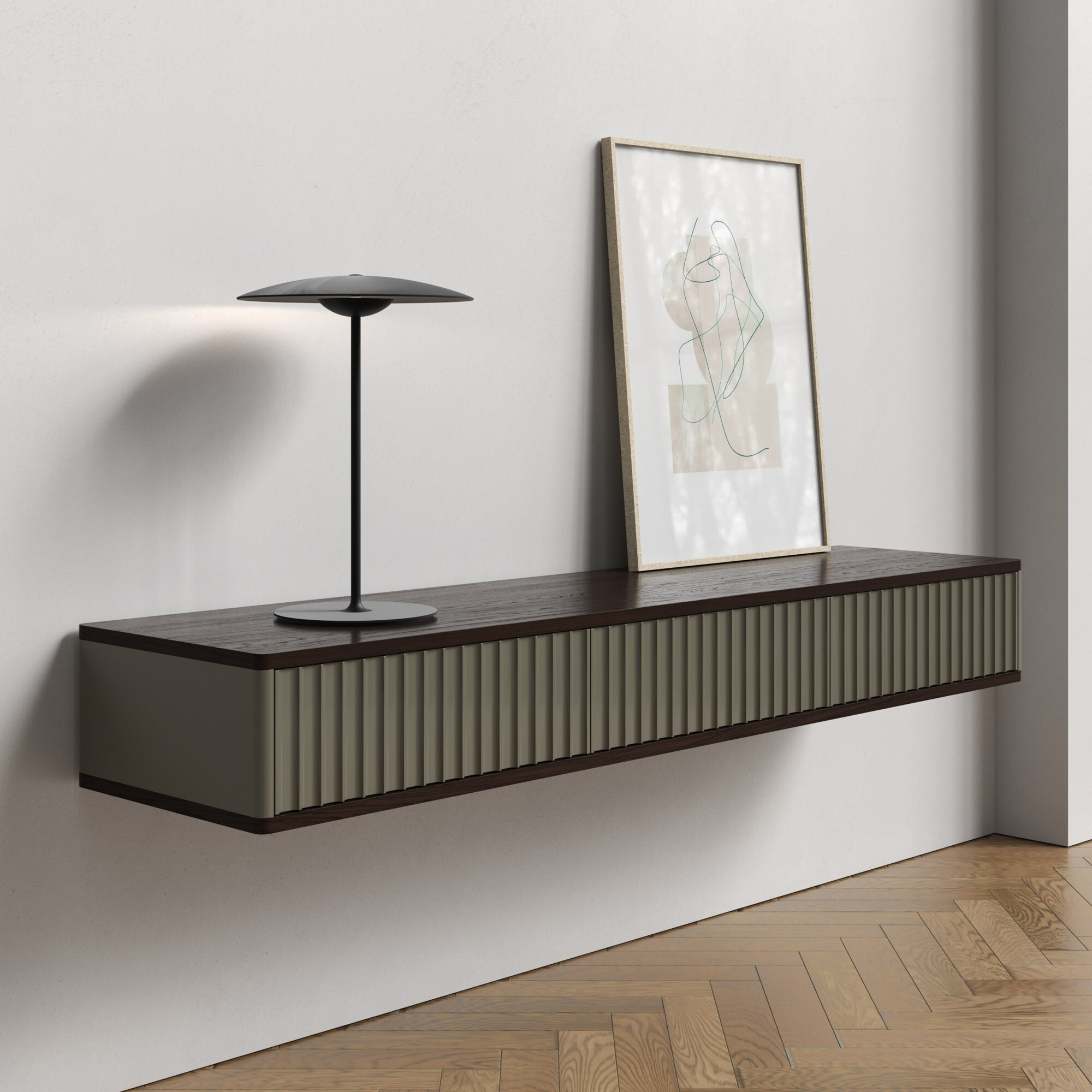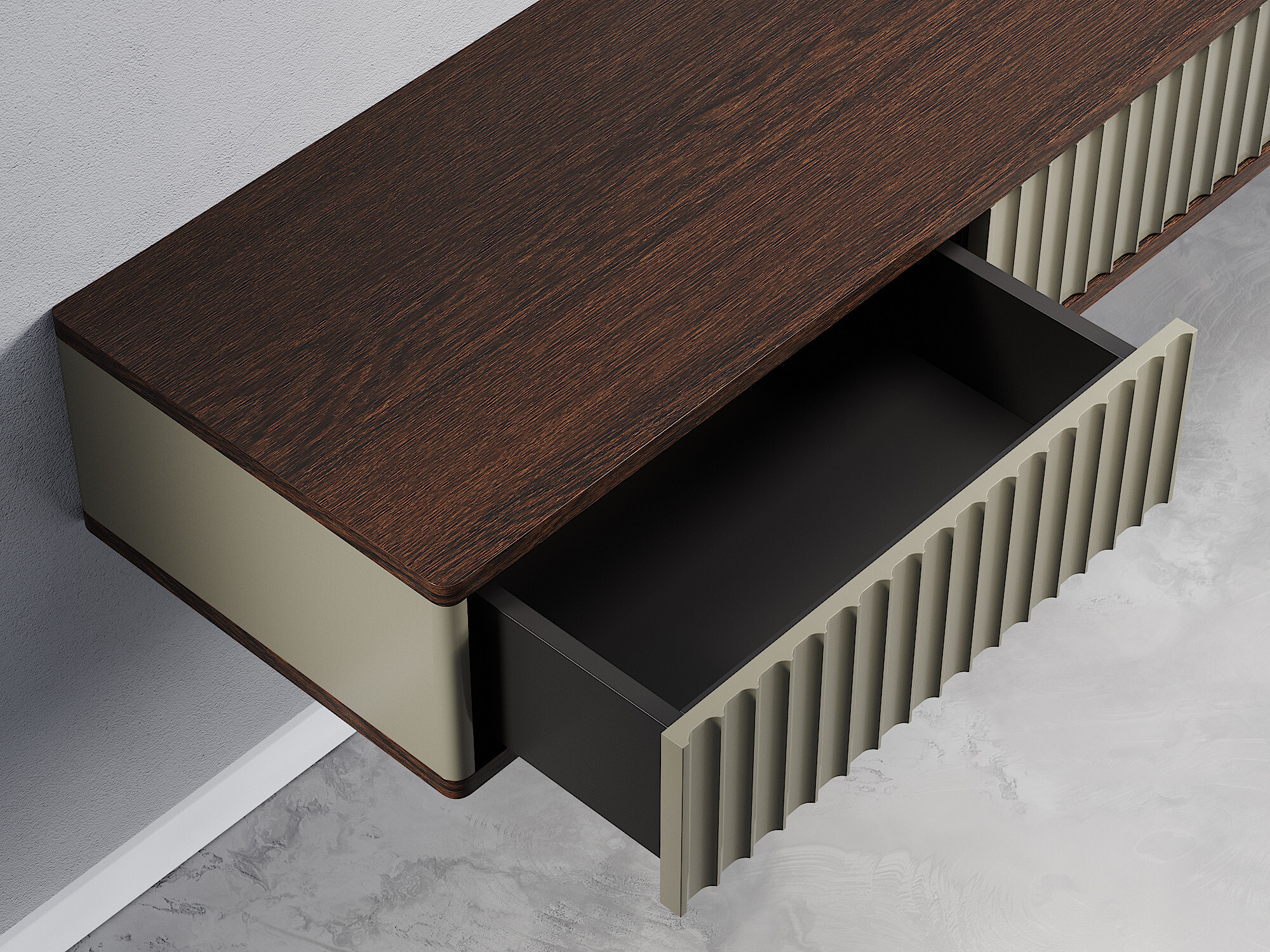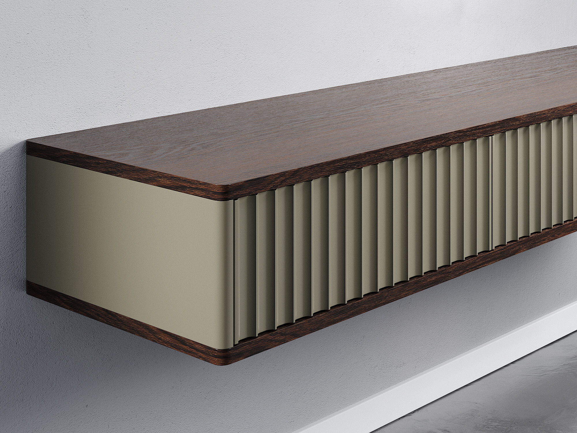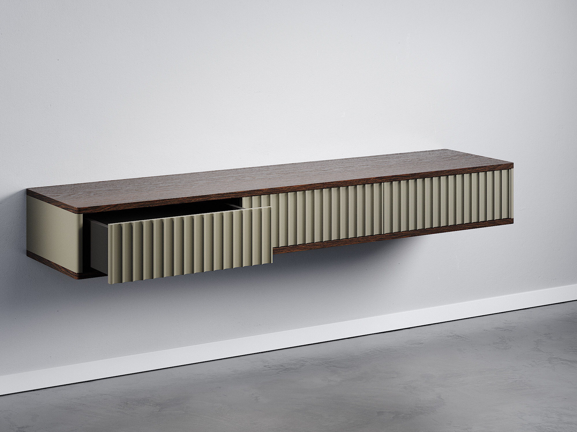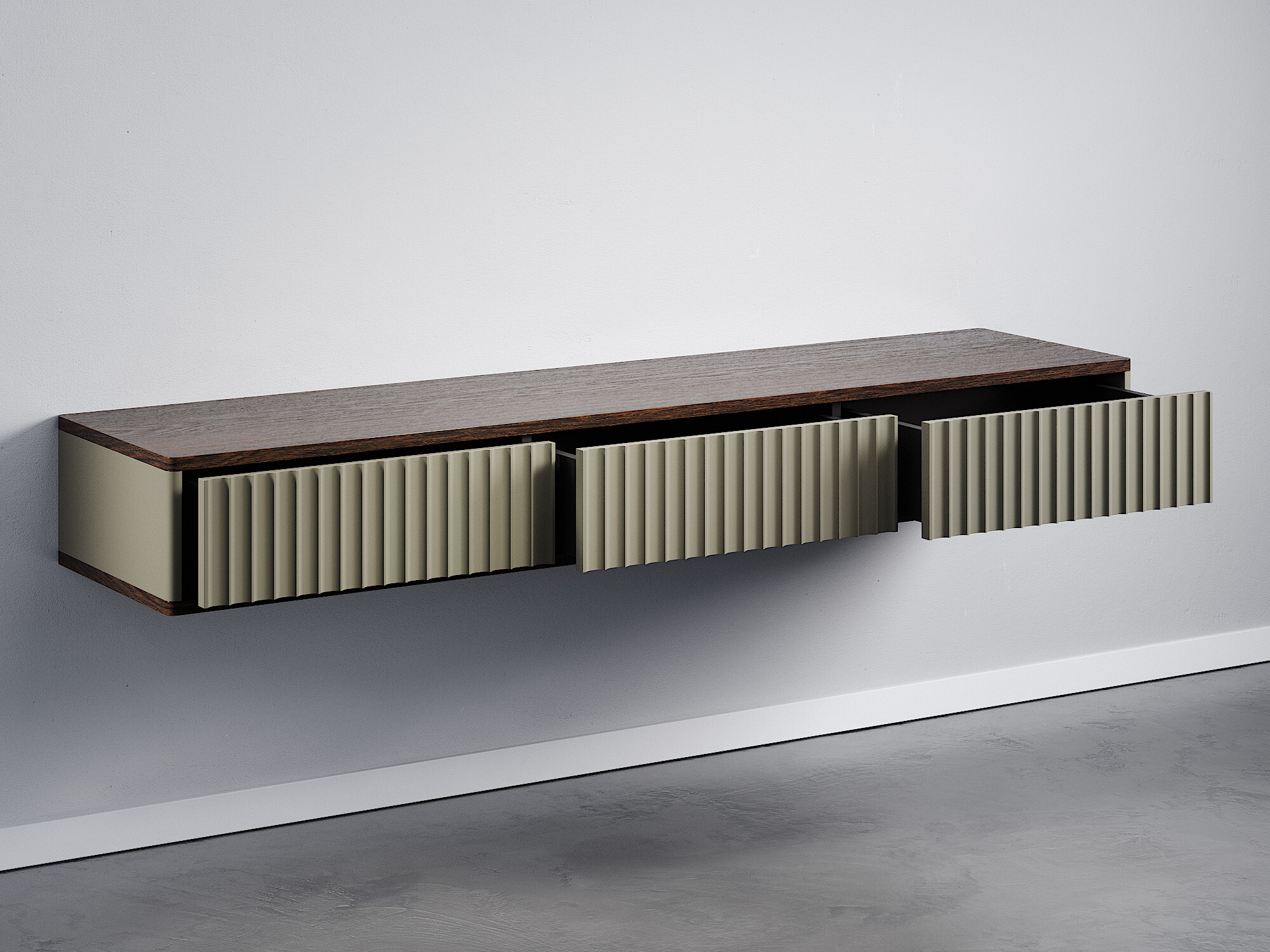 Модель для тех, кто ценит строгую современную эстетику и визуальную легкость. Глубокая вертикальная фрезеровка на фасадах создает динамичную игру света и тени, а система push-to-open позволяет открывать ящики легким нажатием. Подвесная конструкция парит над полом, создавая ощущение невесомости и порядка, идеально подходя для прихожей, гостиной или любого другого помещения.
