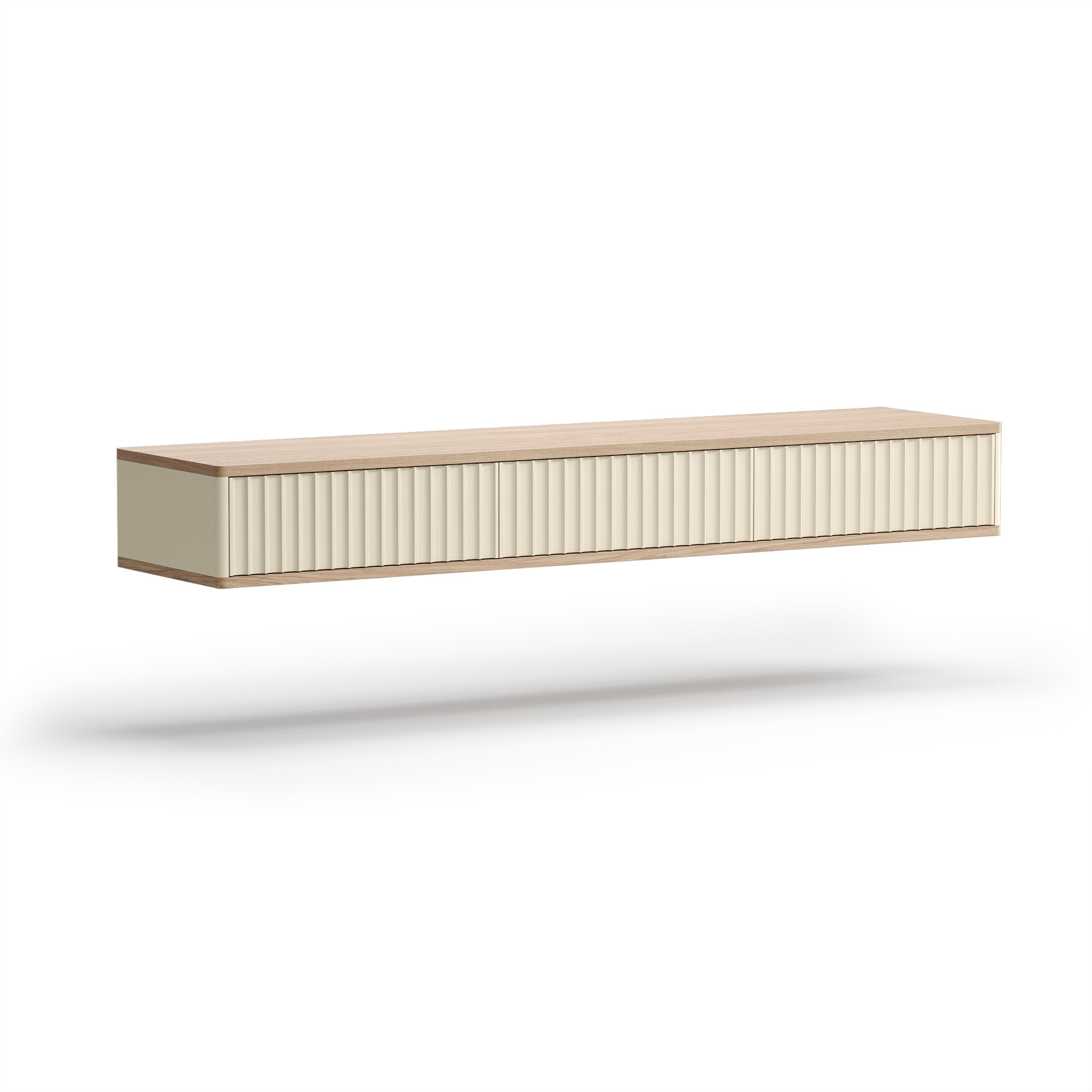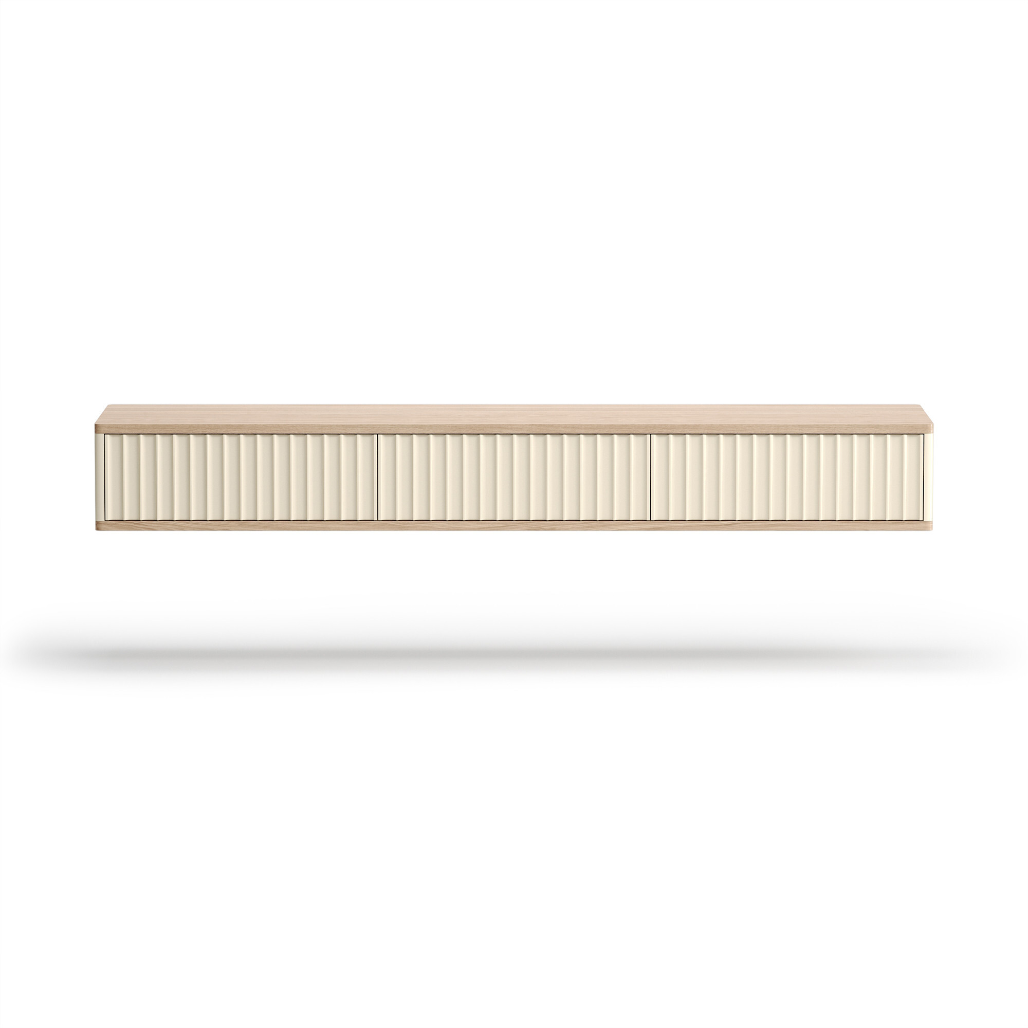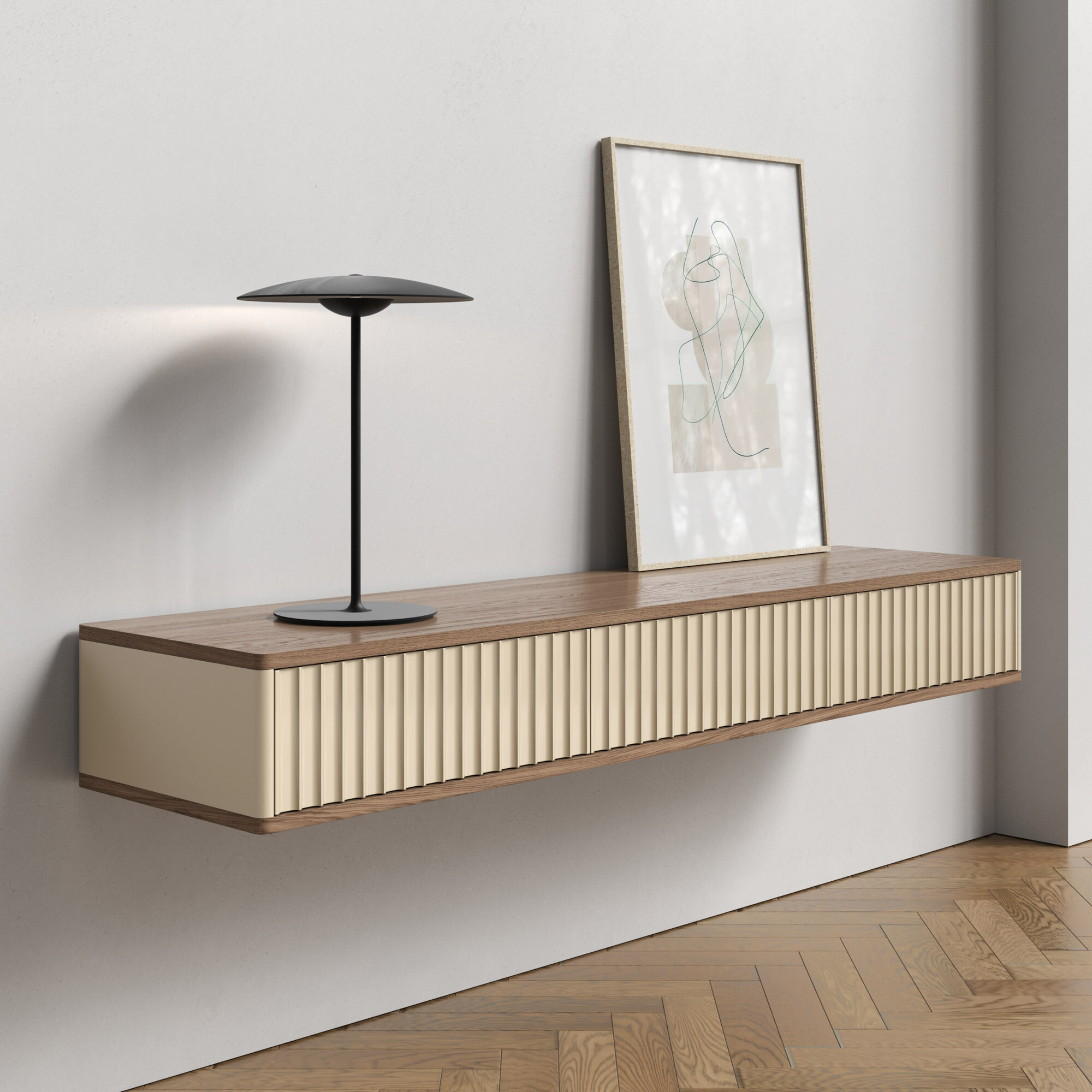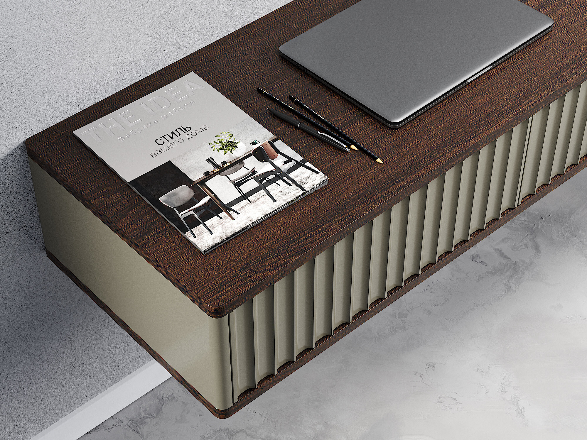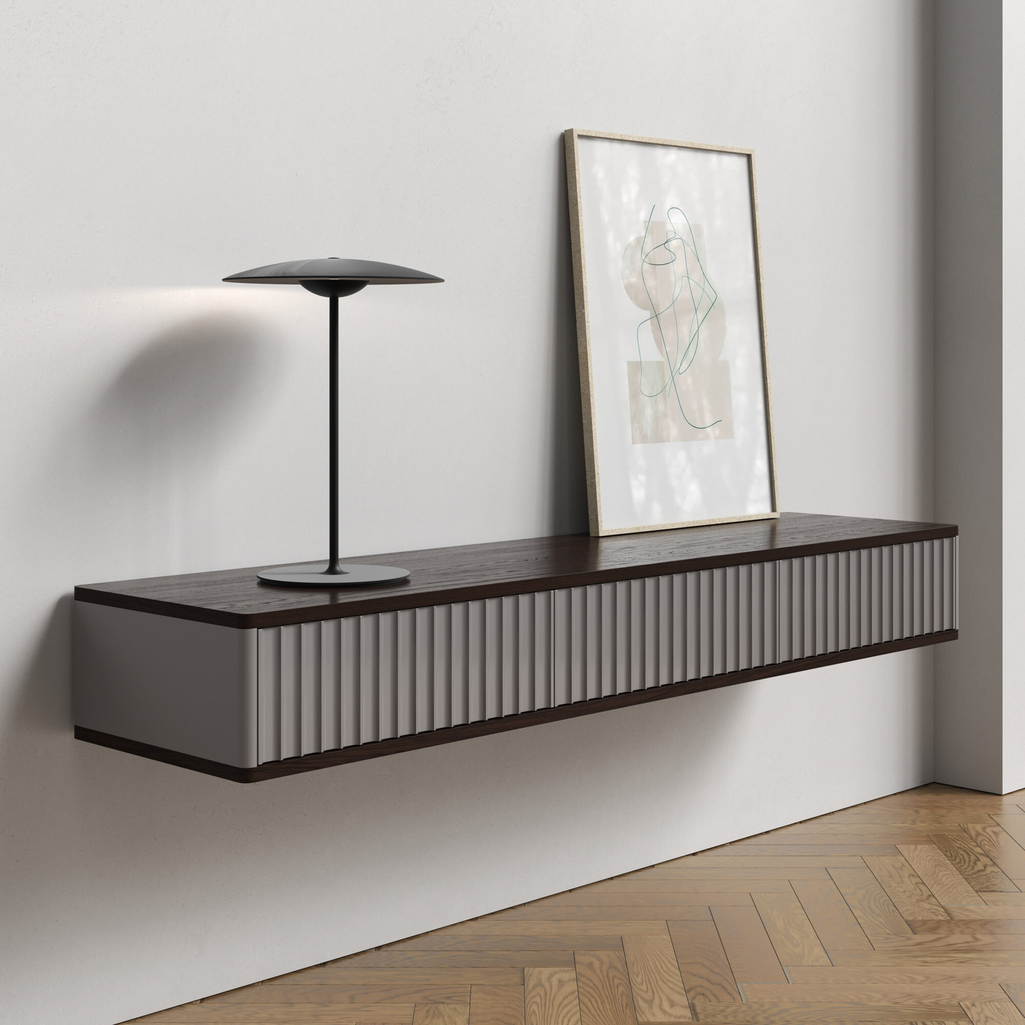 Модель для тех, кто ценит строгую современную эстетику и визуальную легкость. Глубокая вертикальная фрезеровка на фасадах создает динамичную игру света и тени, а система push-to-open позволяет открывать ящики легким нажатием. Подвесная конструкция парит над полом, создавая ощущение невесомости и порядка, идеально подходя для прихожей, гостиной или любого другого помещения.