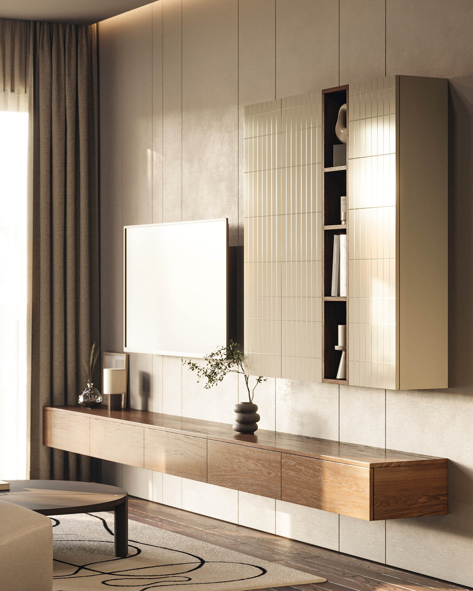 нескольких предметов: консоли, подвесные тумбы и пеналы разной высоты, комоды,