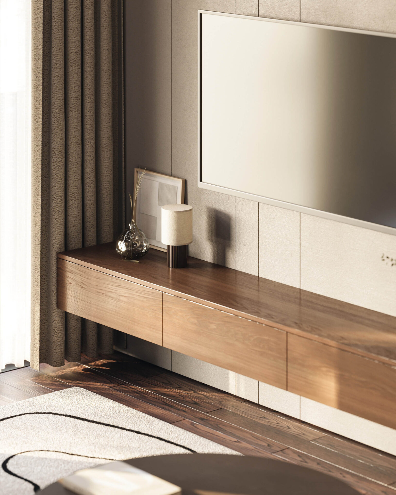 Подвесная консоль с выдвижными ящиками буквально парит в воздухе благодаря