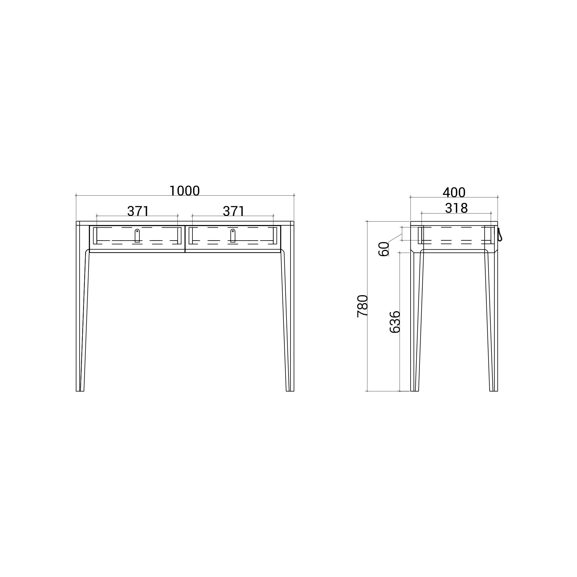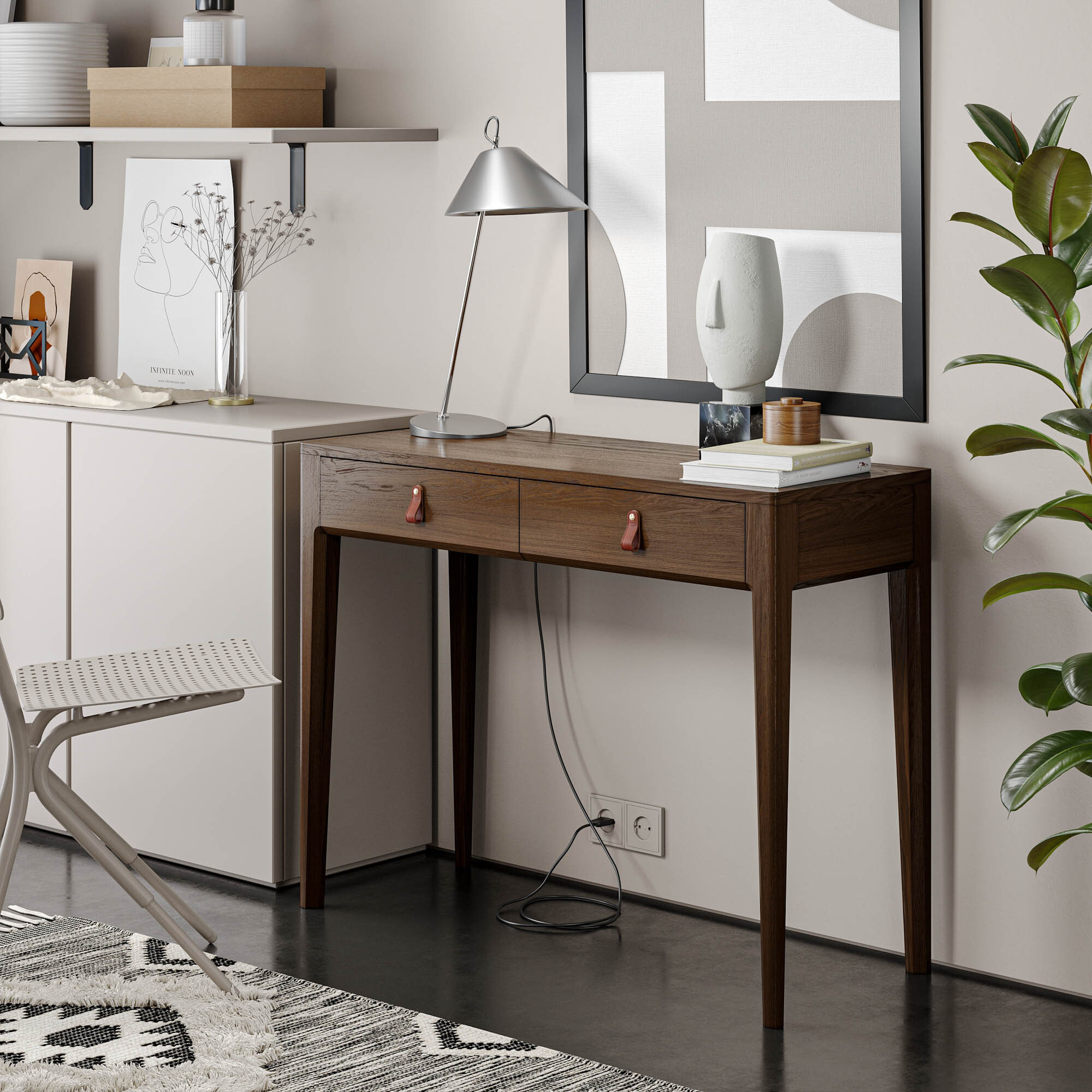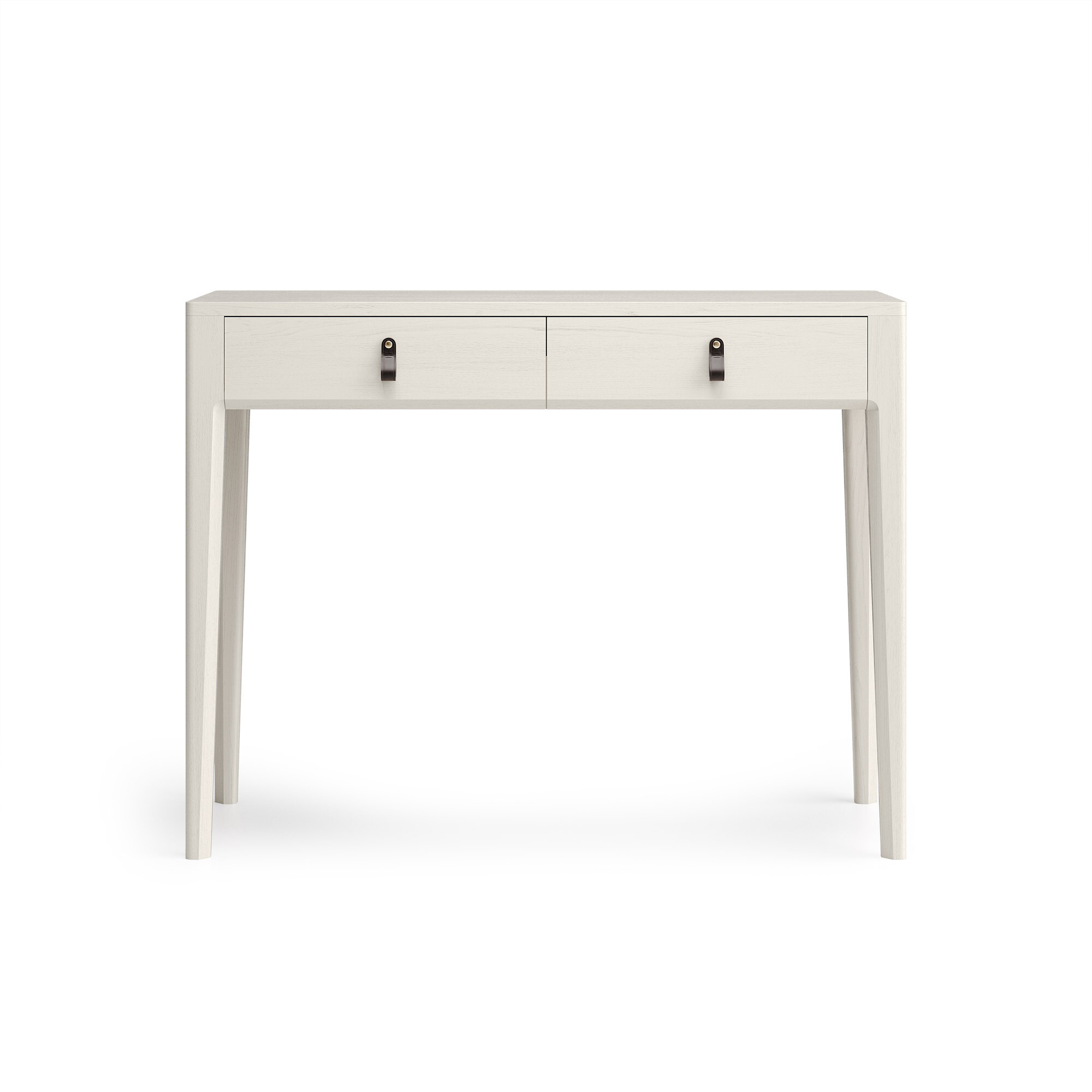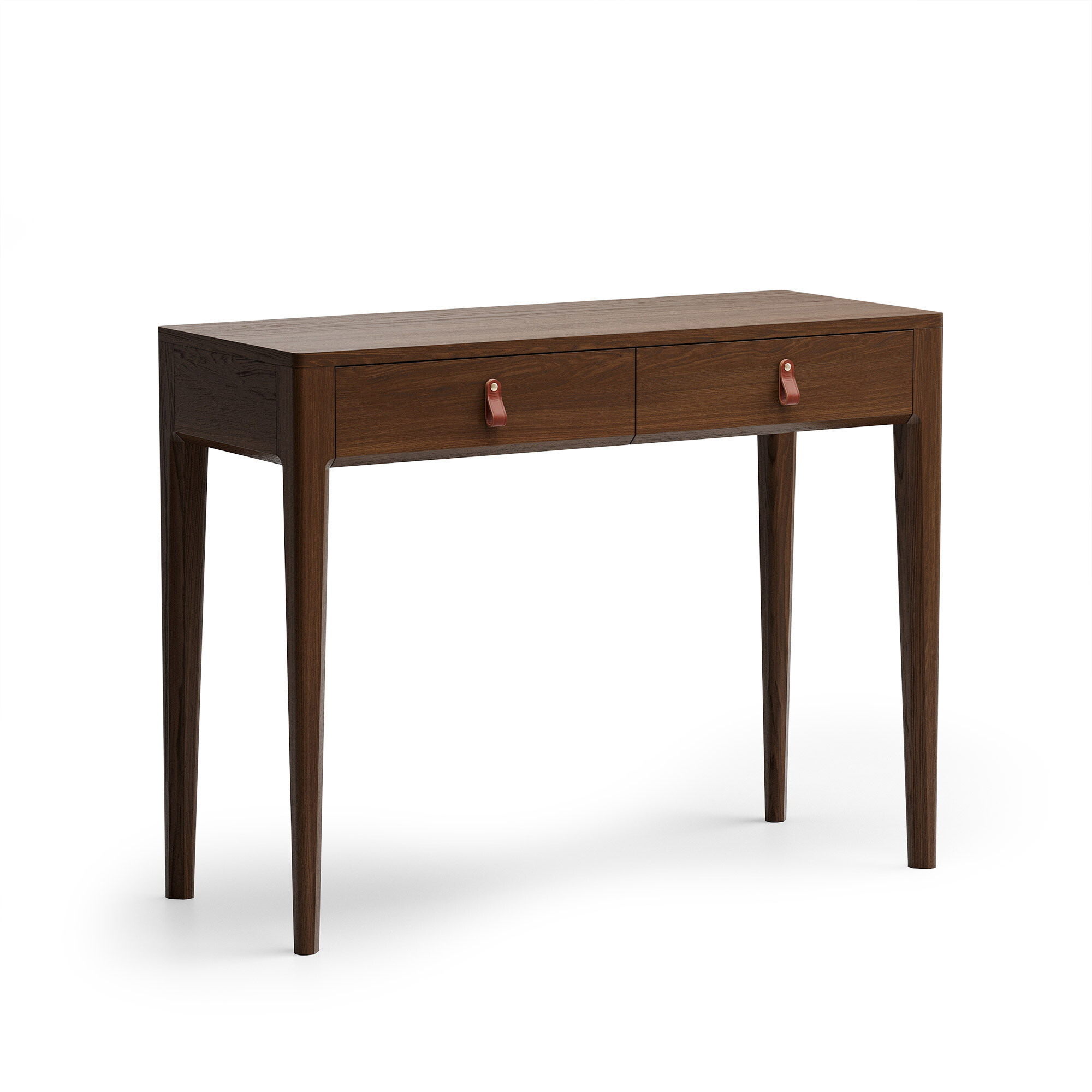 Идеален в качестве туалетного или учебного столика, а также для зонирования прихожей. Компактная глубина (40-50 см) позволяет разместить его даже в самом узком помещении, не загромождая пространство. Утонченный дизайн с фрезеровкой ножек и ручками из натуральной кожи делает его изысканной деталью интерьера.