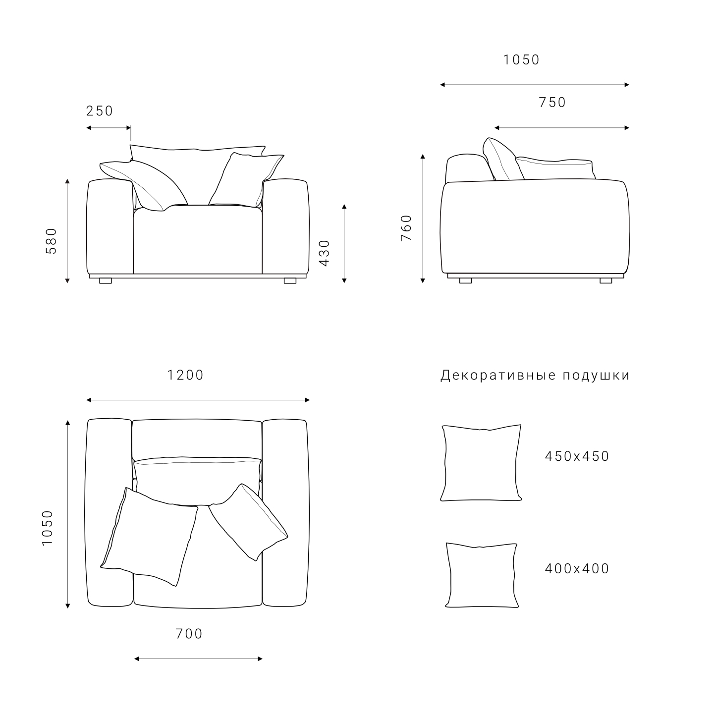 В комплекте с каждым креслом поставляется декоративная подушка в цвет основной ткани дивана.