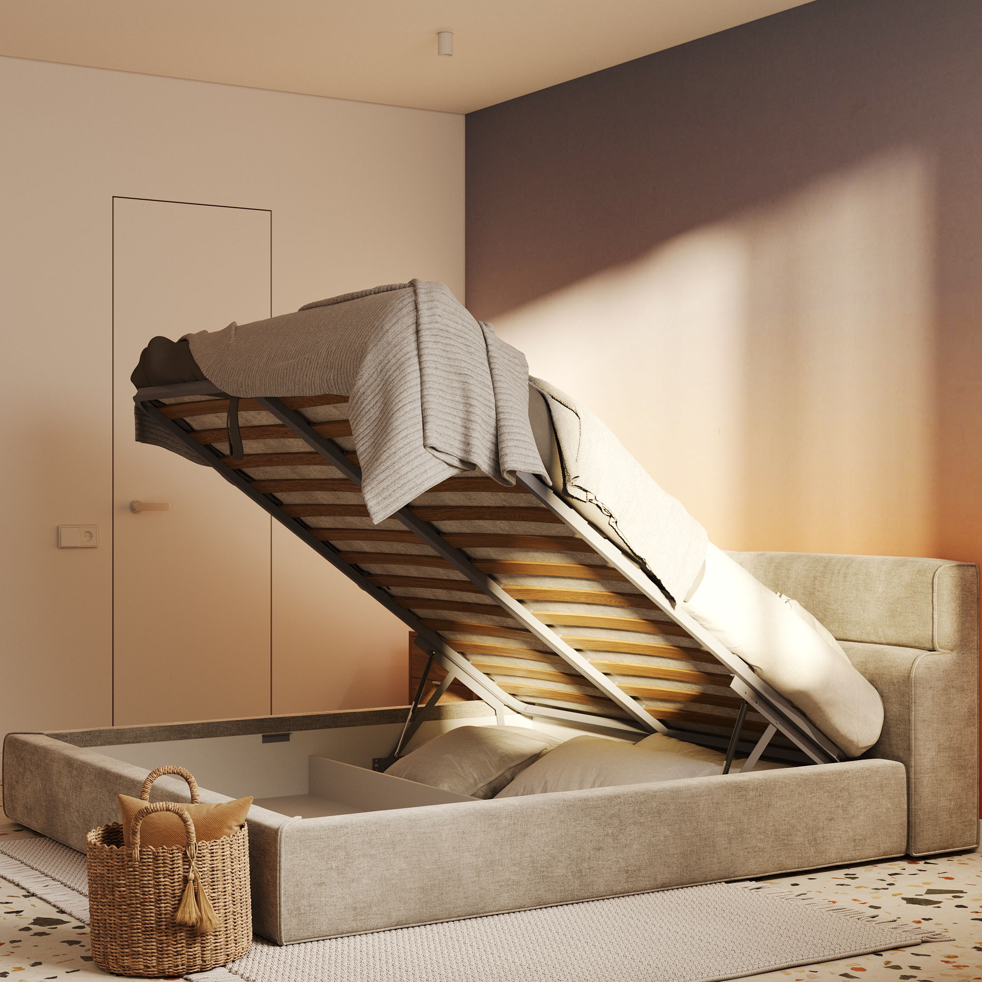 Кровать сочетает в себе не только изящный образ, но и функциональность. Теперь в ней можно хранить постельные принадлежности благодаря удобному подъемному механизму. Чтобы поместить все необходимое в секцию для хранения, просто поднимите основание-решетку. Благодаря встроенным газ-лифтам — специальным механизмам, облегчающим подъем, основание поднимается и опускается без усилий, не хлопает при закрытии.