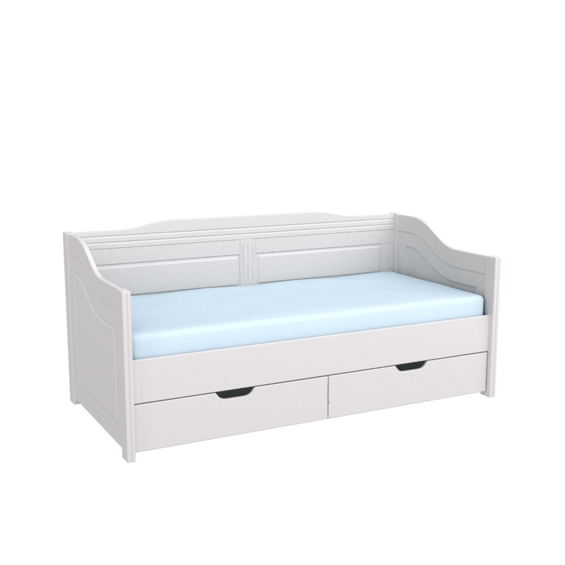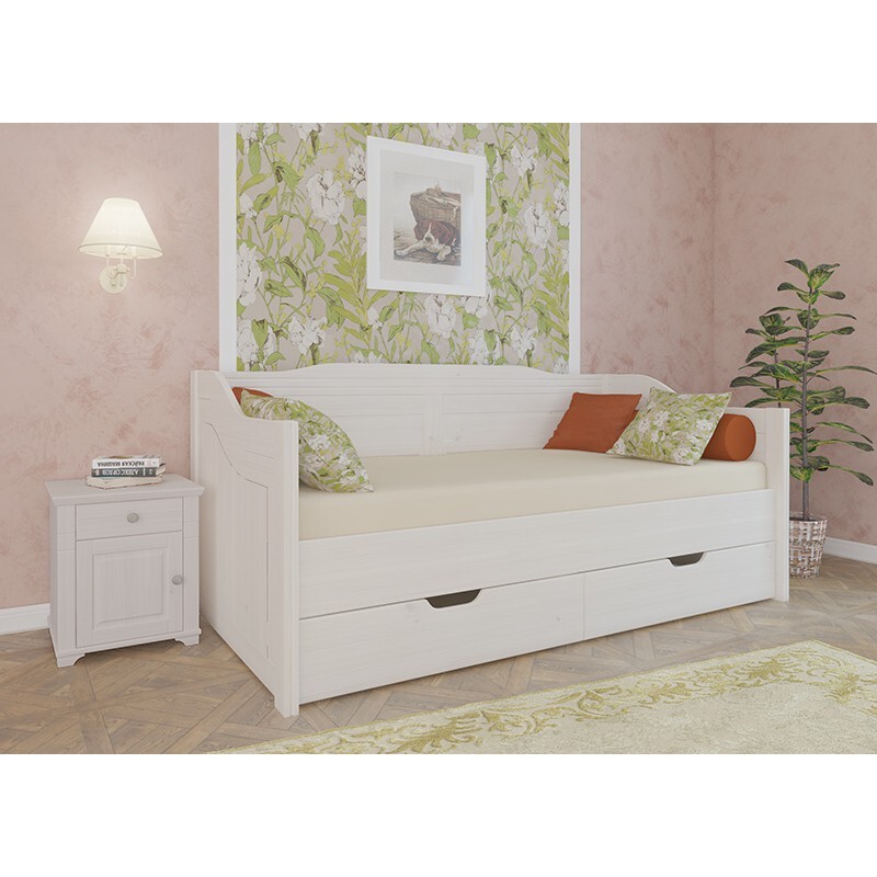 Пристенная кровать-диван, спальное место 90х200 см, боковые и пристенная спинки филенчатые, решетка из ламелей сосны в комплекте, два выдвижных ящика на шариковых направляющих полного выката.