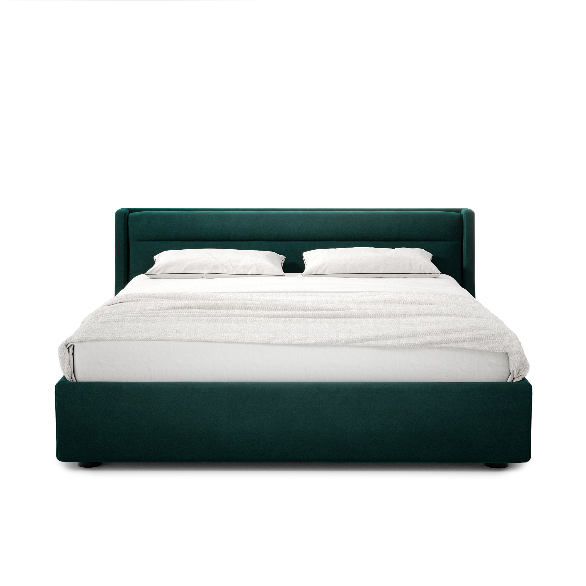 Изголовье обтянуто тканью со всех сторон — кровать можно поставить прямо в центре спальни. А универсальный дизайн и возможность подобрать цвет ткани и тонировку ножек позволяют ей хорошо смотреться в разных интерьерах.