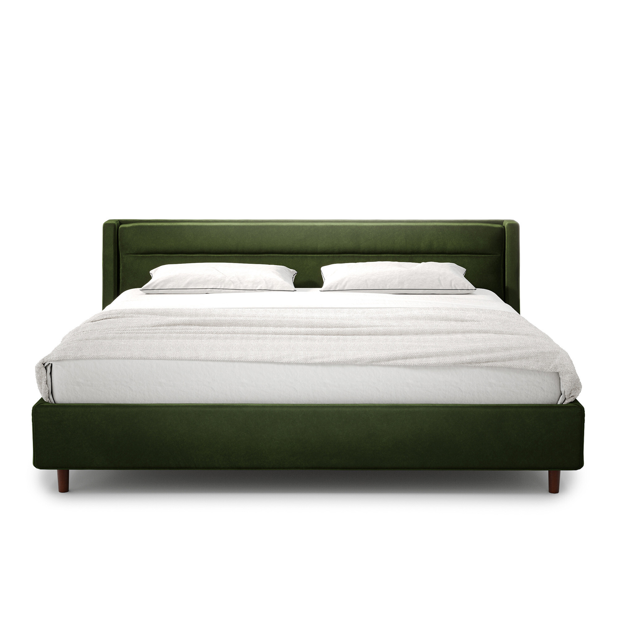 Изящные изгибы изголовья, плавно переходящие от боковой части в приспинную, создают притягательный и легкий дизайн этой кровати. Изголовье с ровными горизонтальными линиями глубокой стяжки обтянуто тканью со всех сторон, кровать можно разместить даже в центре спальни. А благодаря возможности выбора цвета ткани и тонировки ножек она будет отлично смотреться в разных интерьерах.