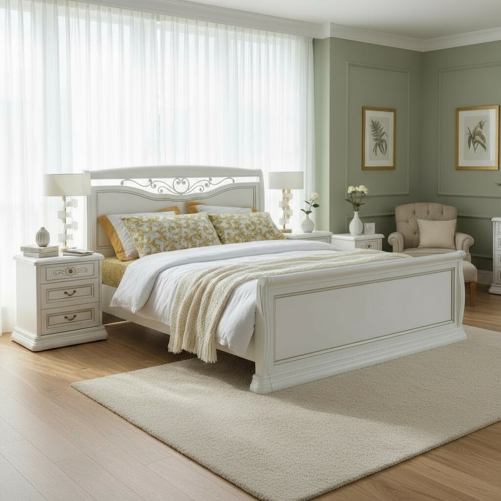 Кровать выполнена с использованием массива и шпона дуба в отделке декапе. Головная спинка кровати декорирована оригинальным кованным элементом с отделкой золотом.