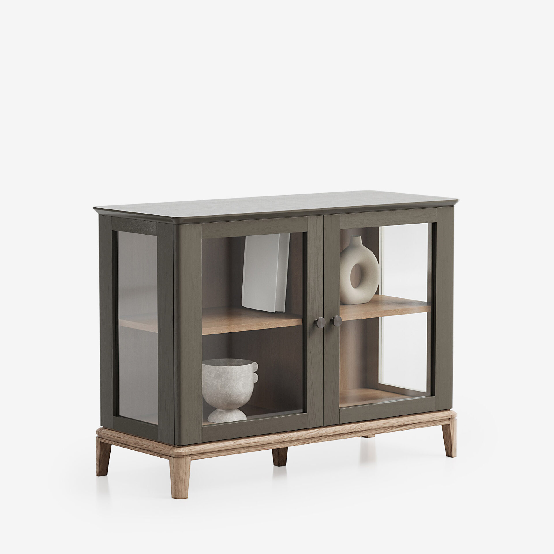 Элегантный дизайн низкой витрины Crystal CR160 обуславливает легкость ее применения в благородных интерьерах — от классических до ультрасовременных. Боковые элементы и распашные фасады со стеклом предоставляют трехсторонний обзор содержимого и демонстрируют яркую текстуру дерева.