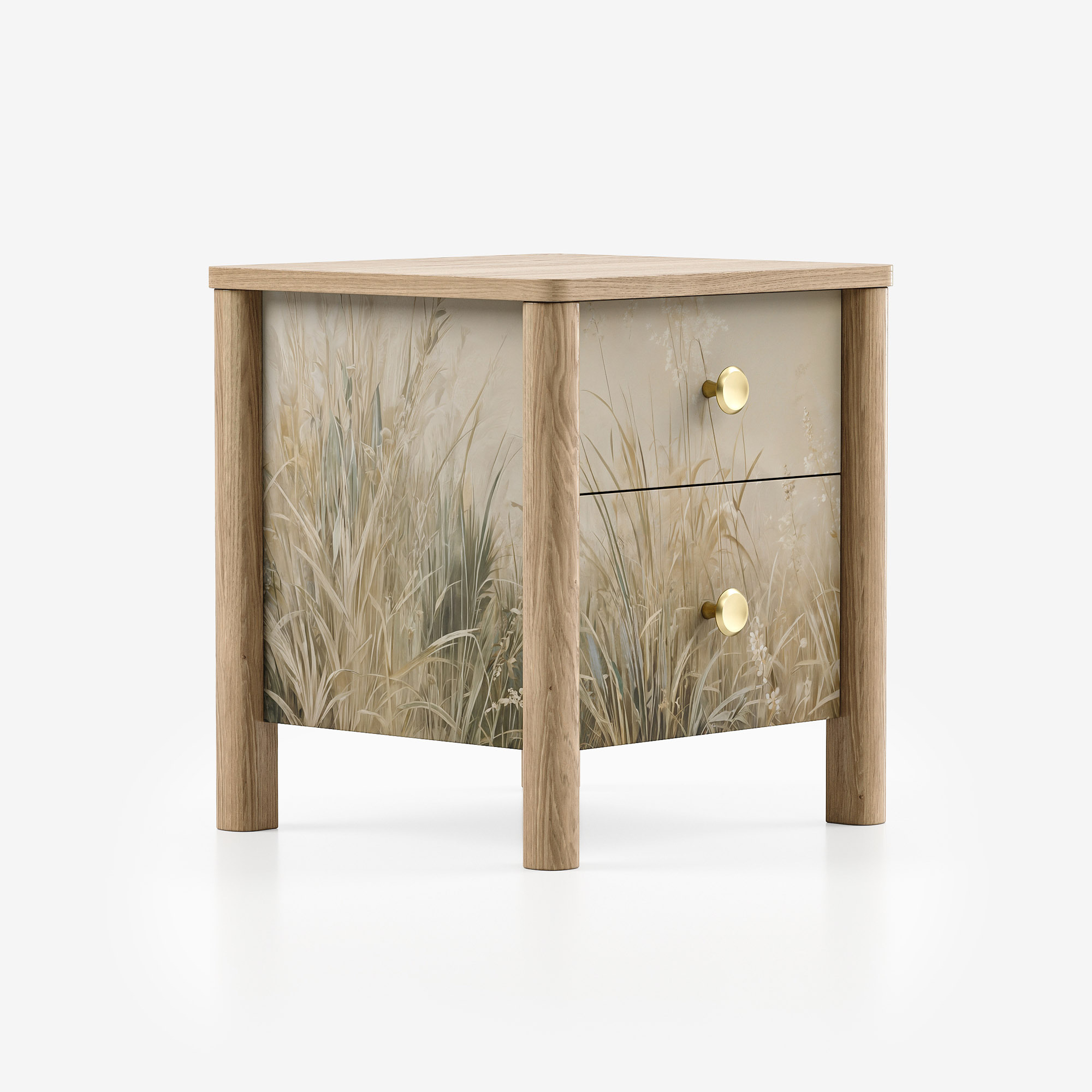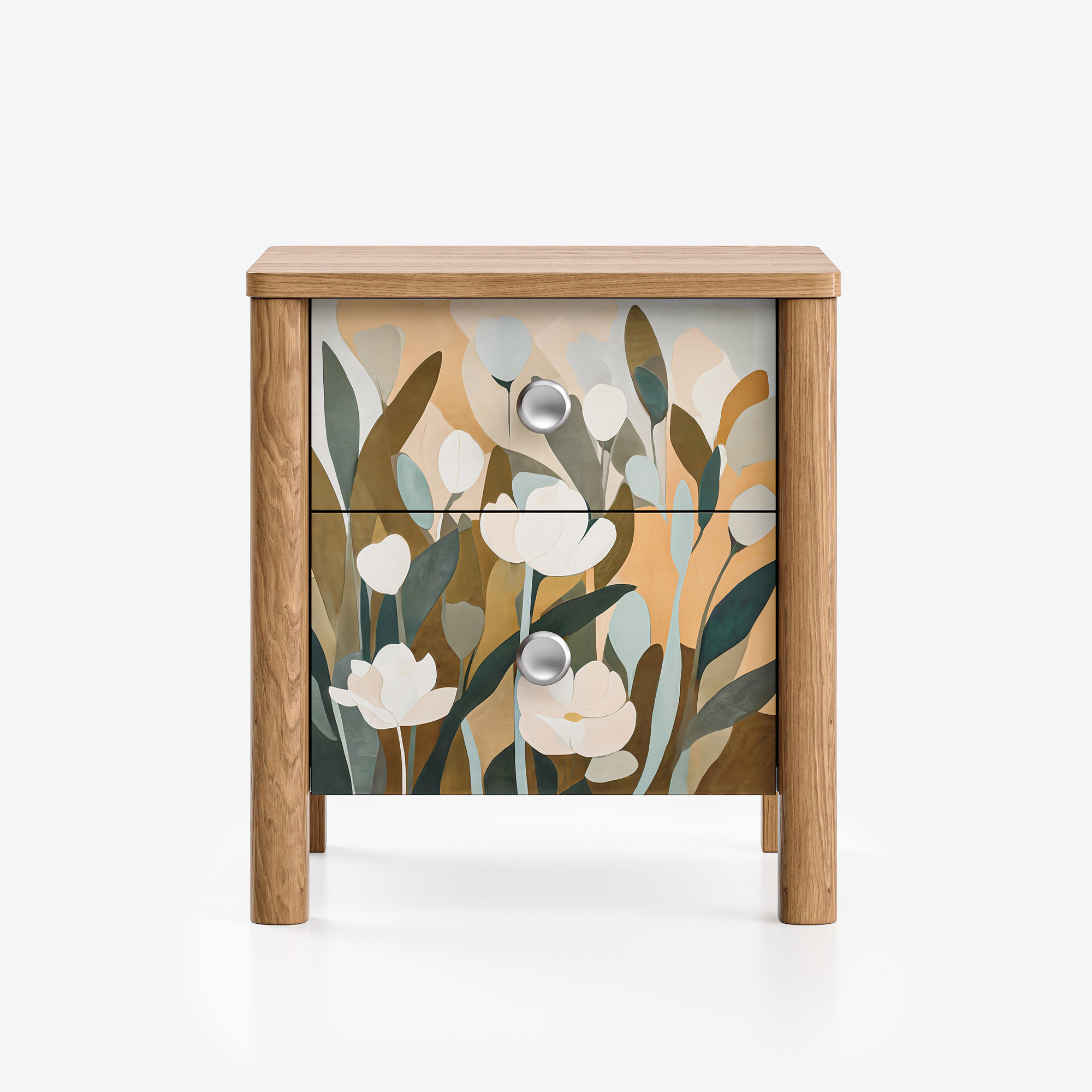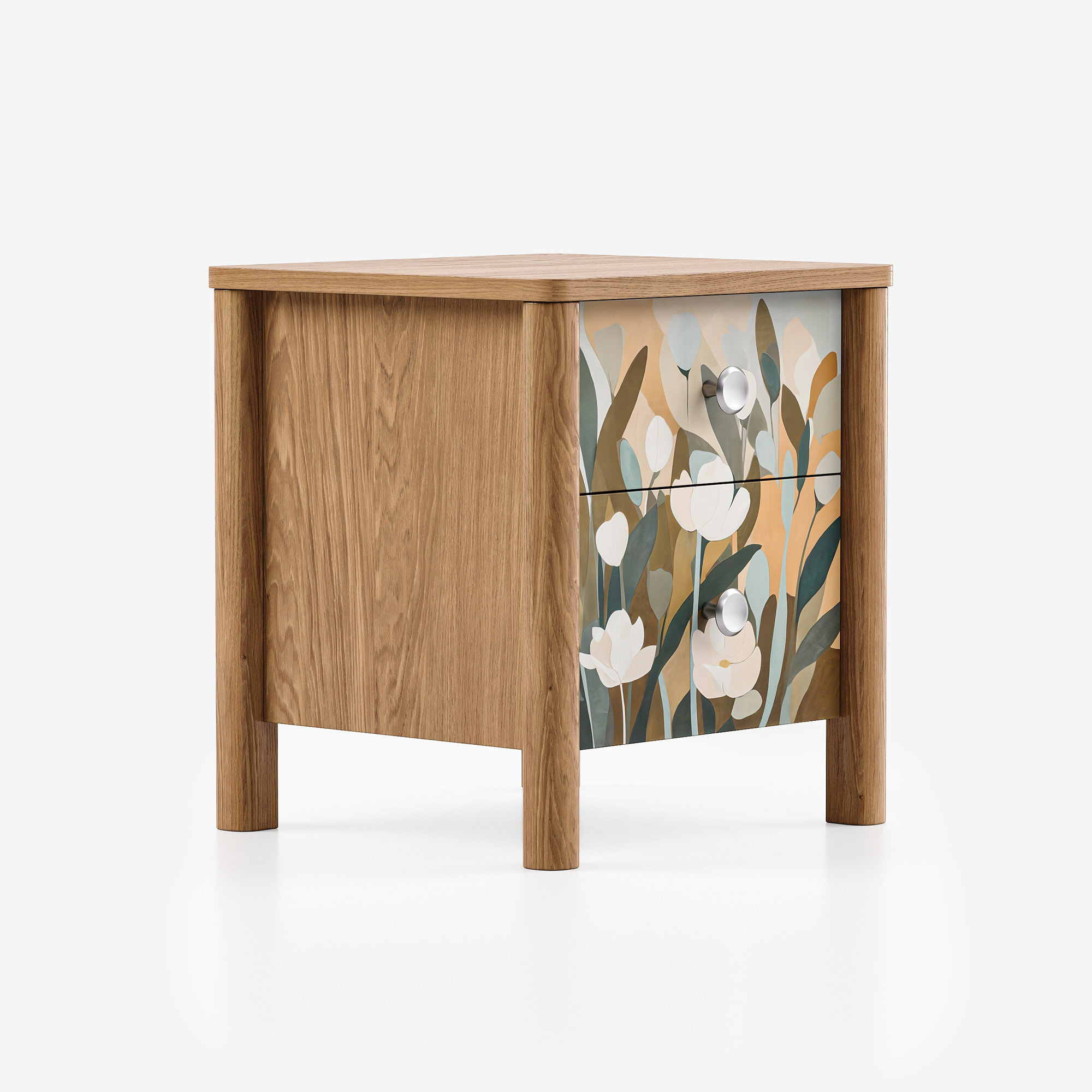 Уникальное сочетание скандинавской эстетики mid-century и цифрового искусства. Теплая текстура тонированного дуба, плавные каплевидные ножки и эксклюзивные принты из коллекции INSPIRE создают предмет мебели, который является самостоятельным арт-объектом. Это больше, чем тумба — это визуальное заявление, наполняющее пространство характером и глубиной.