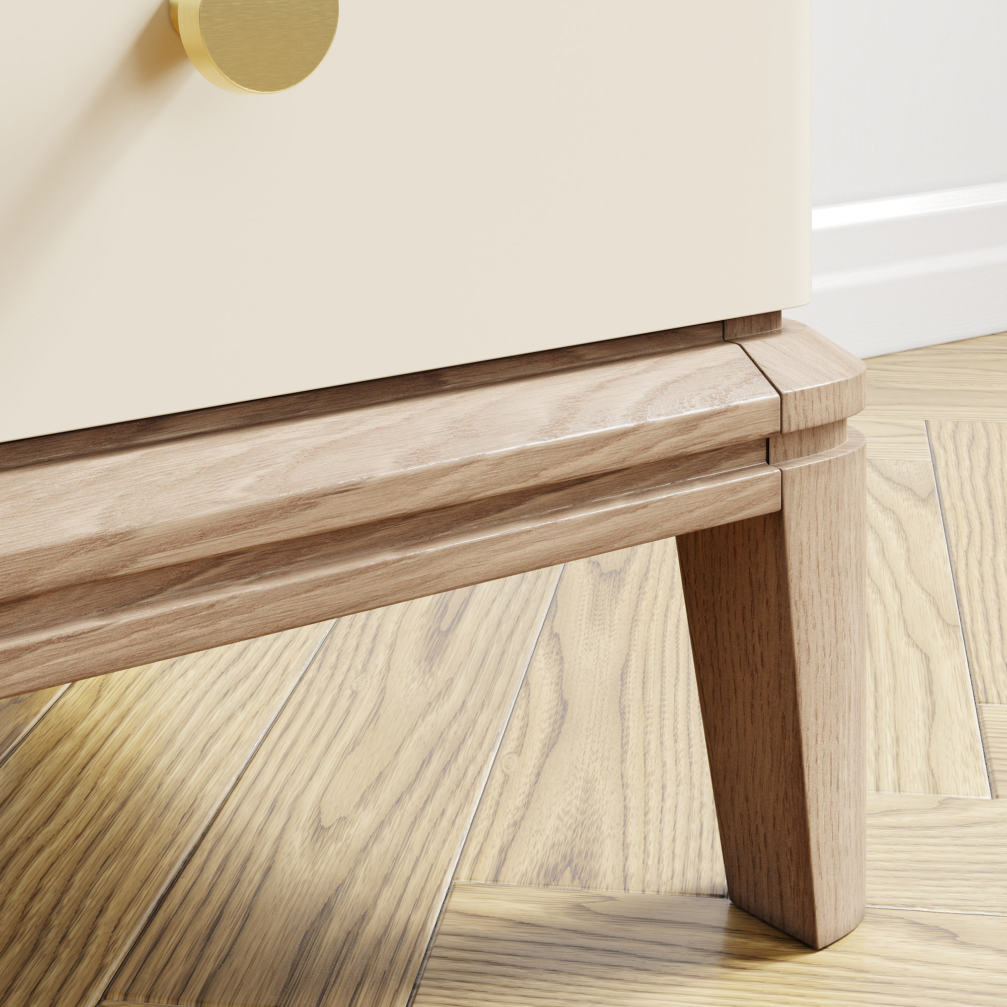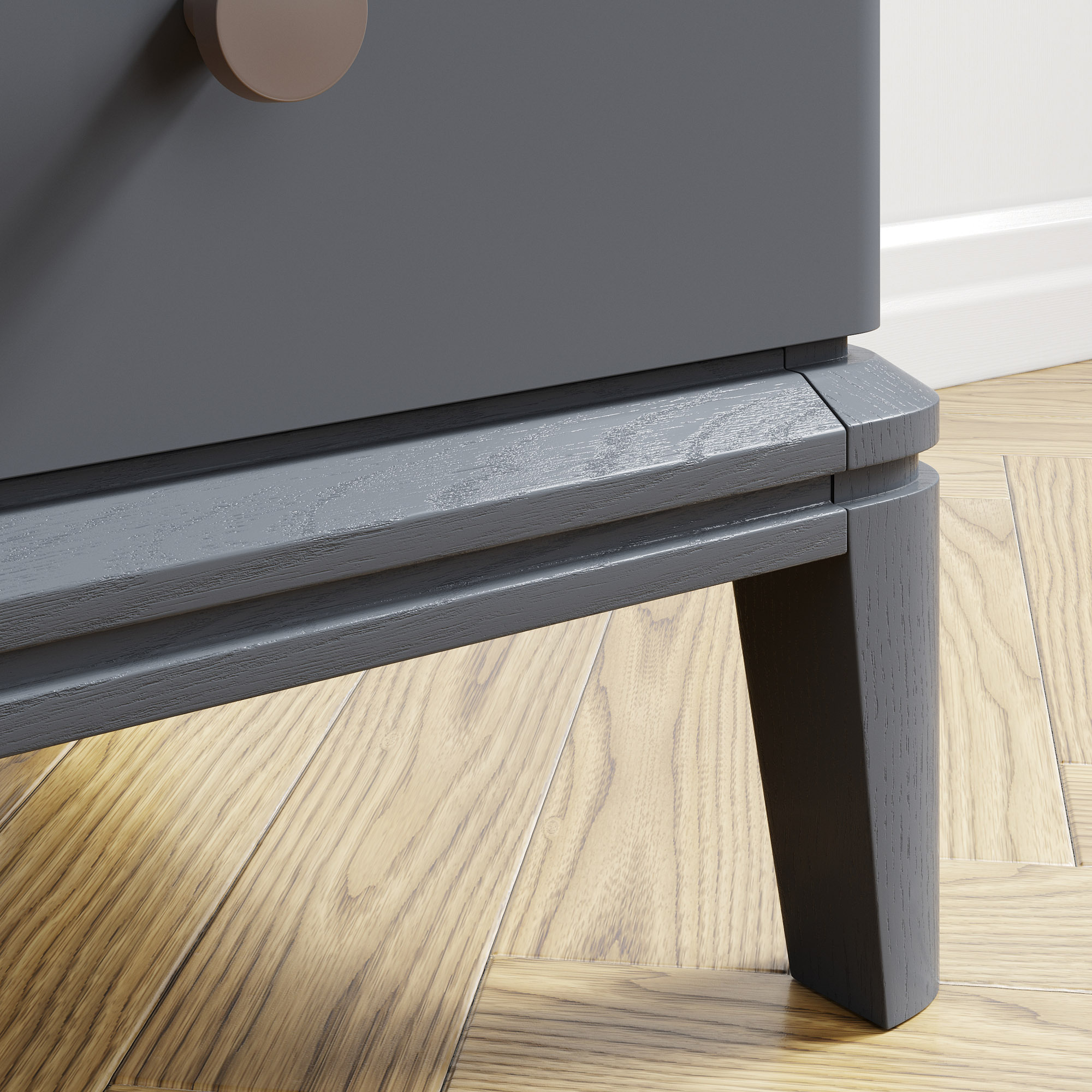 Эксклюзивные детали: массивные ручки-кнопки в четырех исполнениях и многогранные ножки и цоколь из массива дуба, обработанные вручную.
