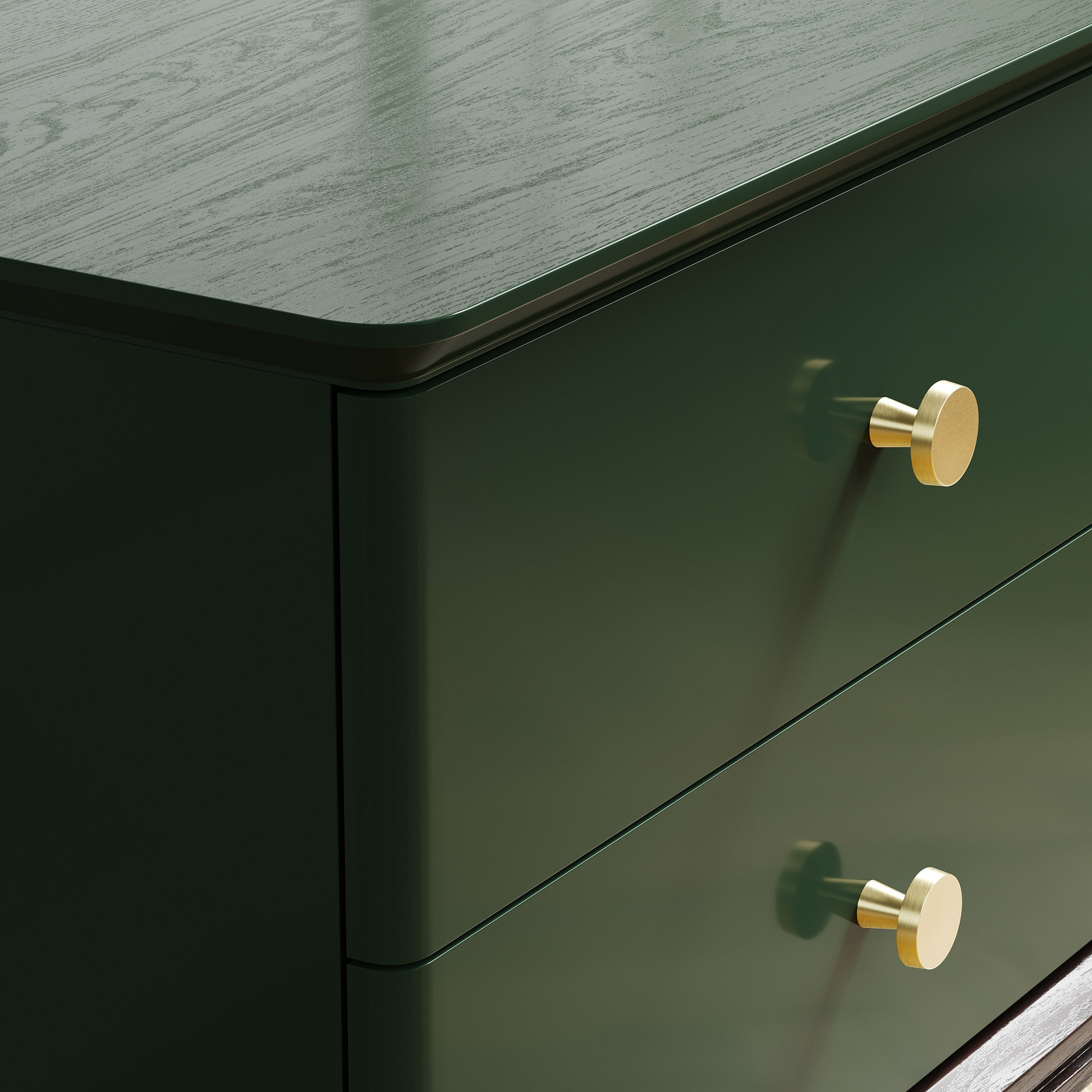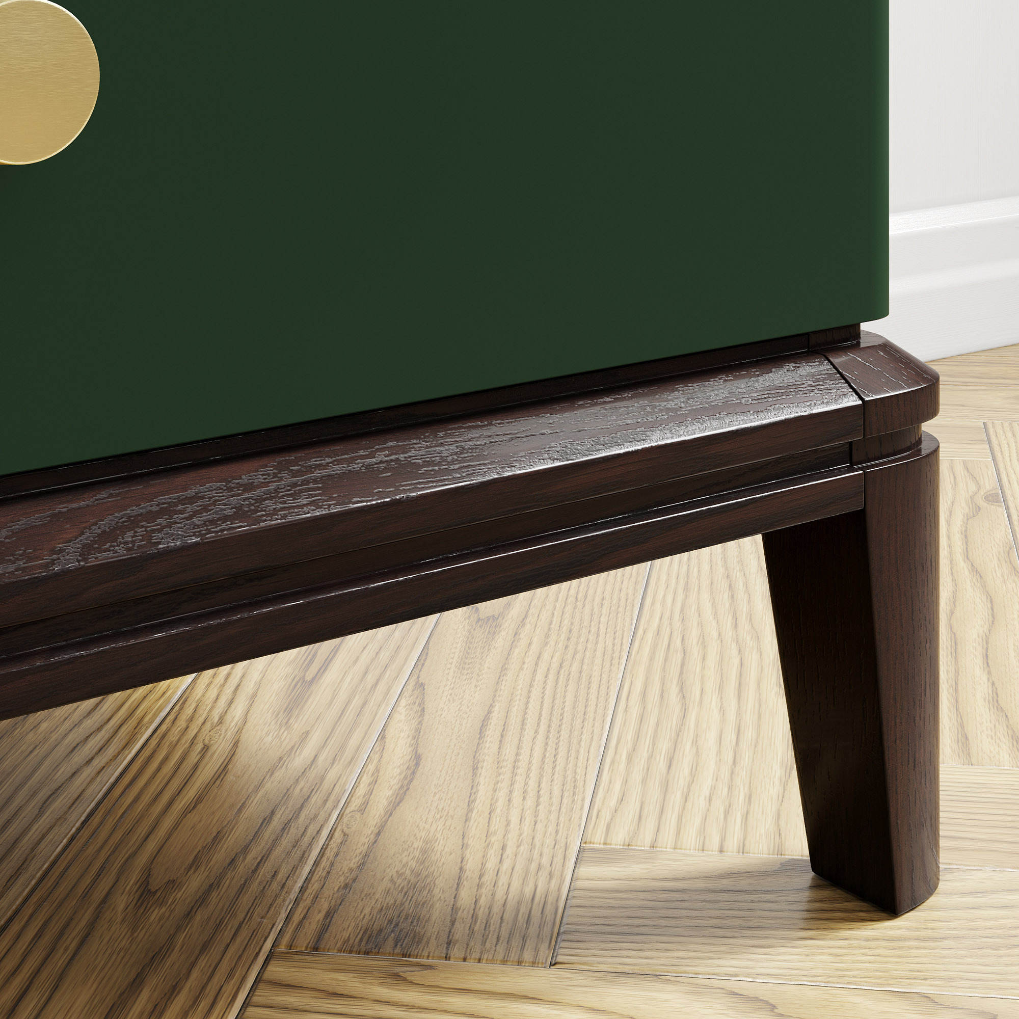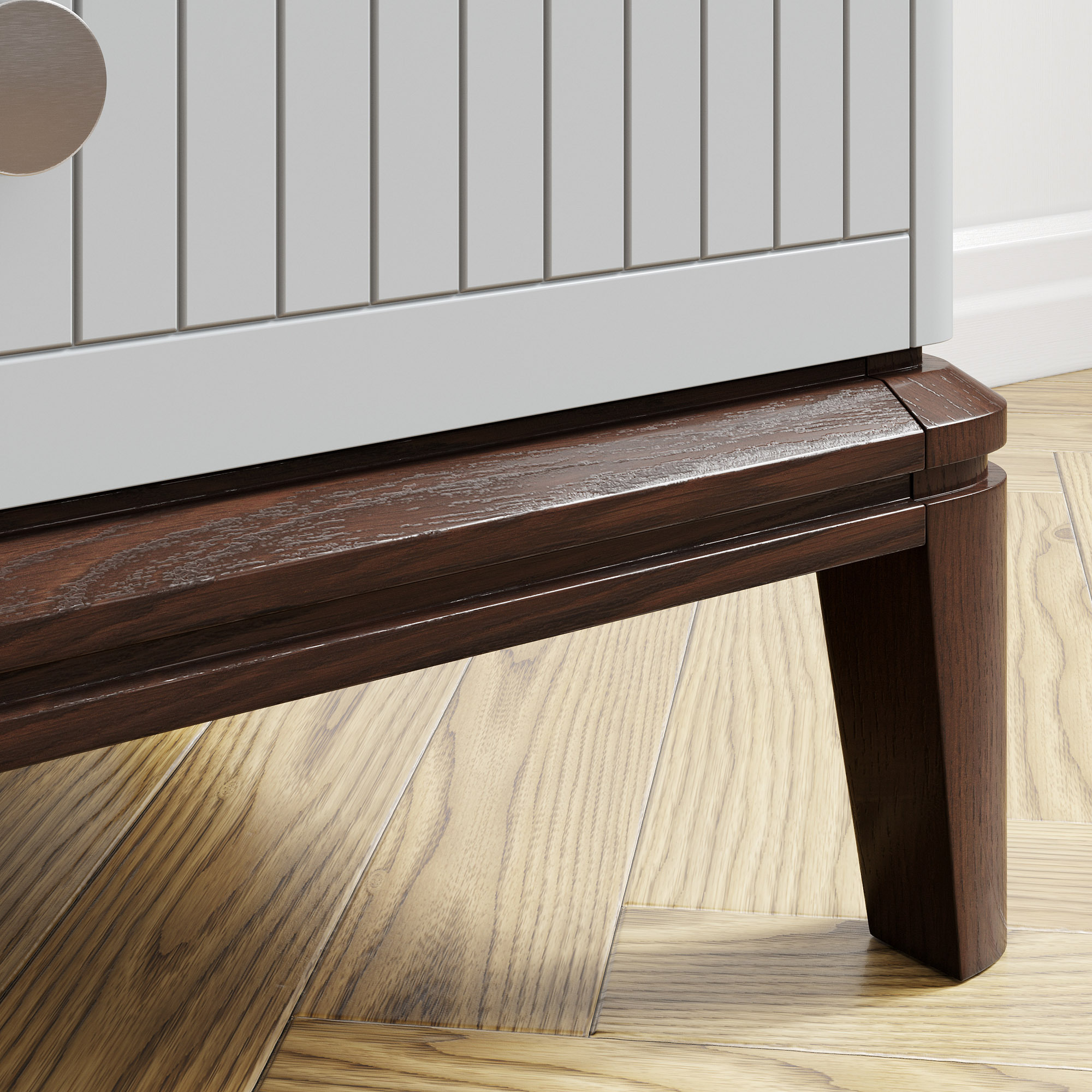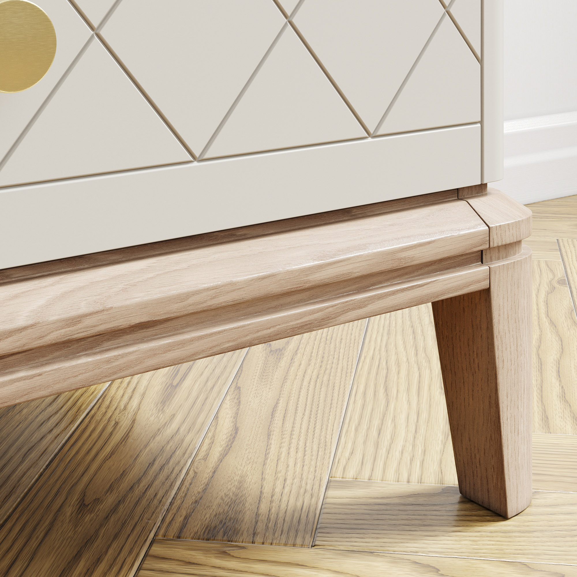 Эксклюзивные детали: массивные ручки-кнопки в четырех исполнениях и многогранные ножки и цоколь из массива дуба, обработанные вручную.