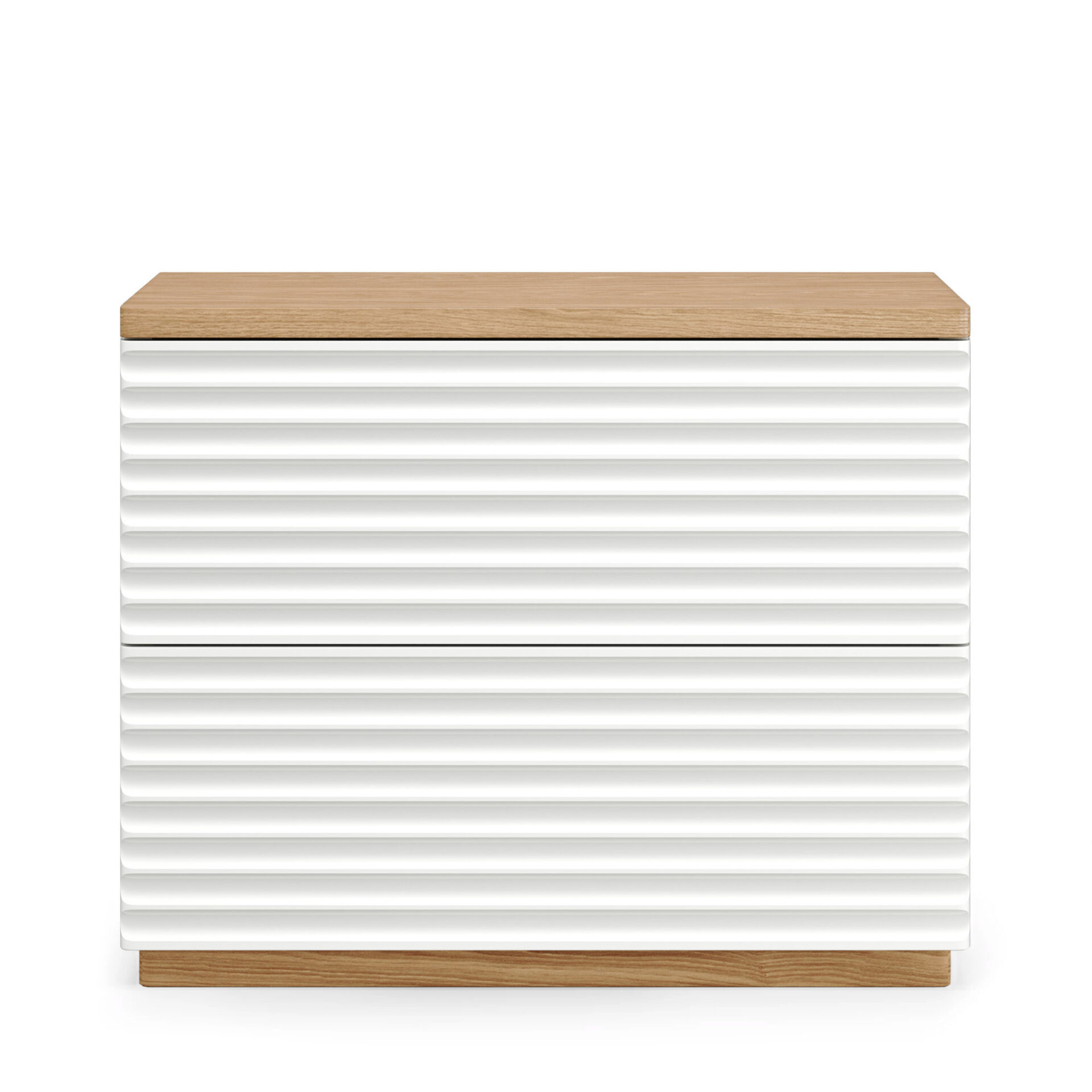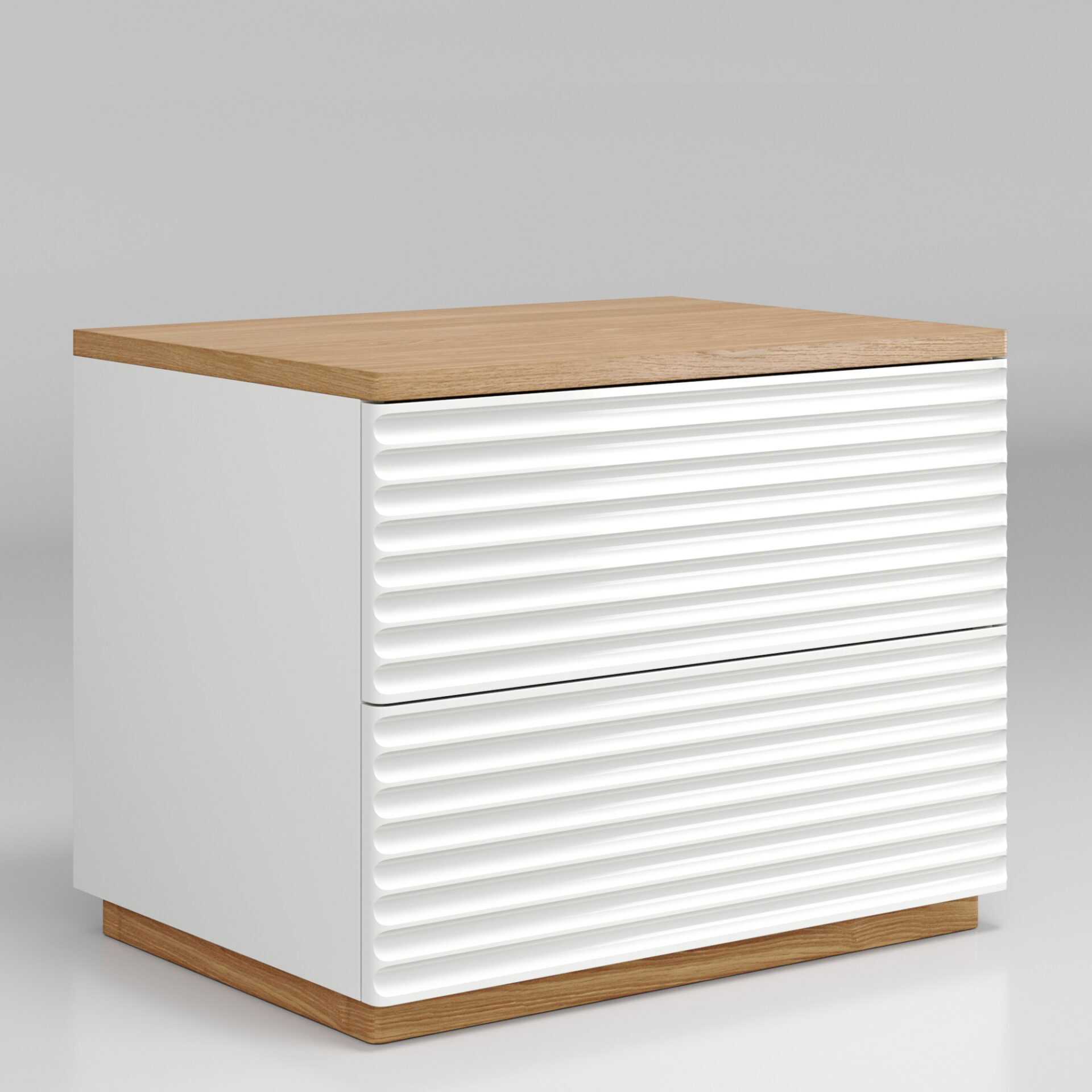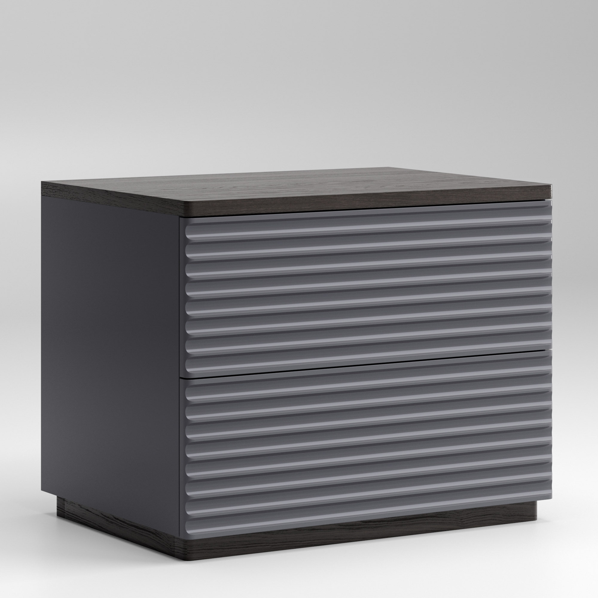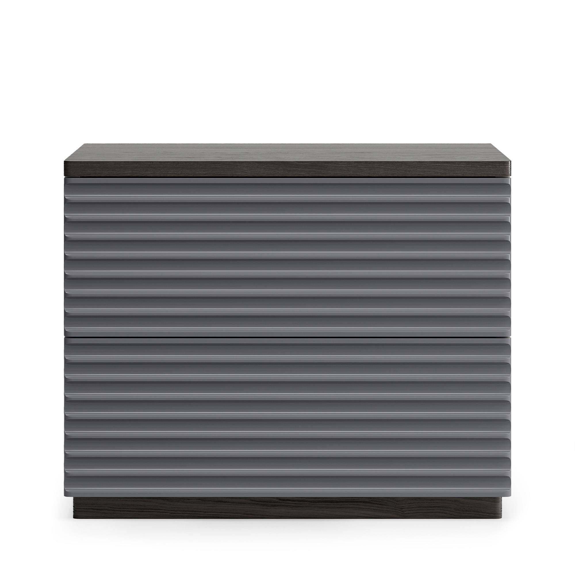 Глубокая горизонтальная фрезеровка на фасадах создает динамичную игру света и тени, а система push-to-open позволяет открывать ящики легким нажатием.