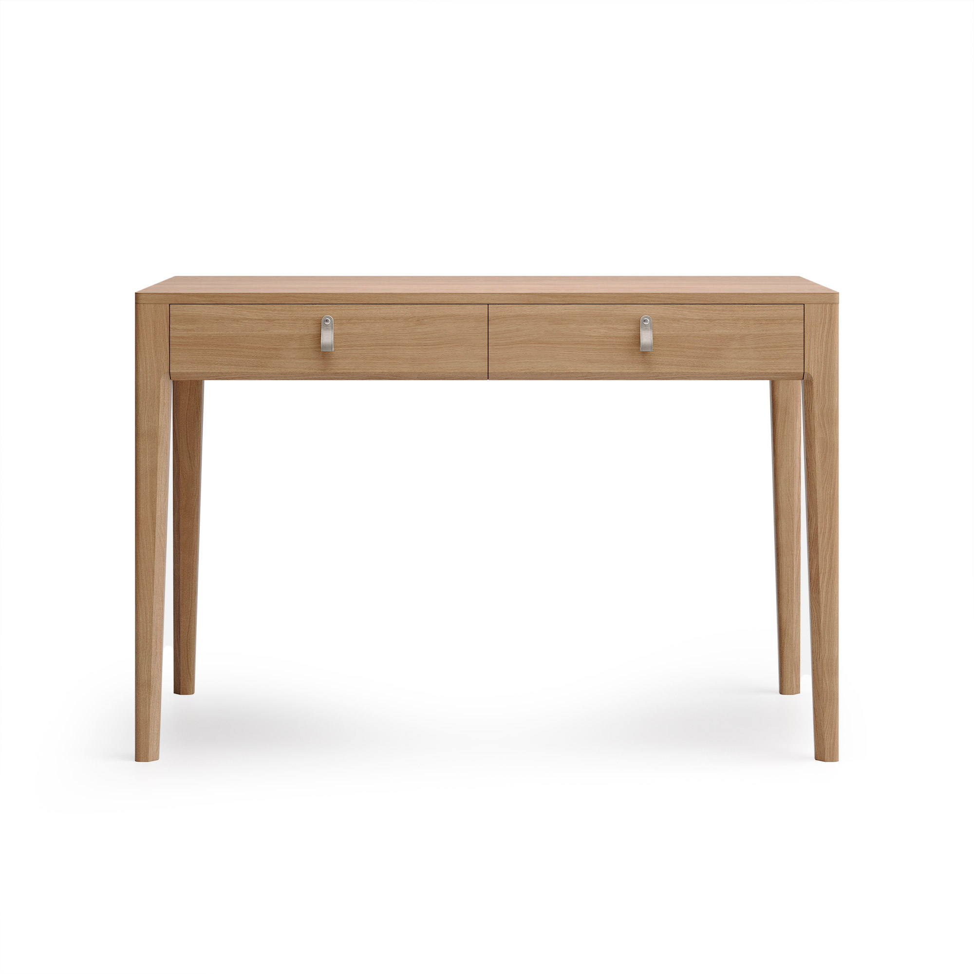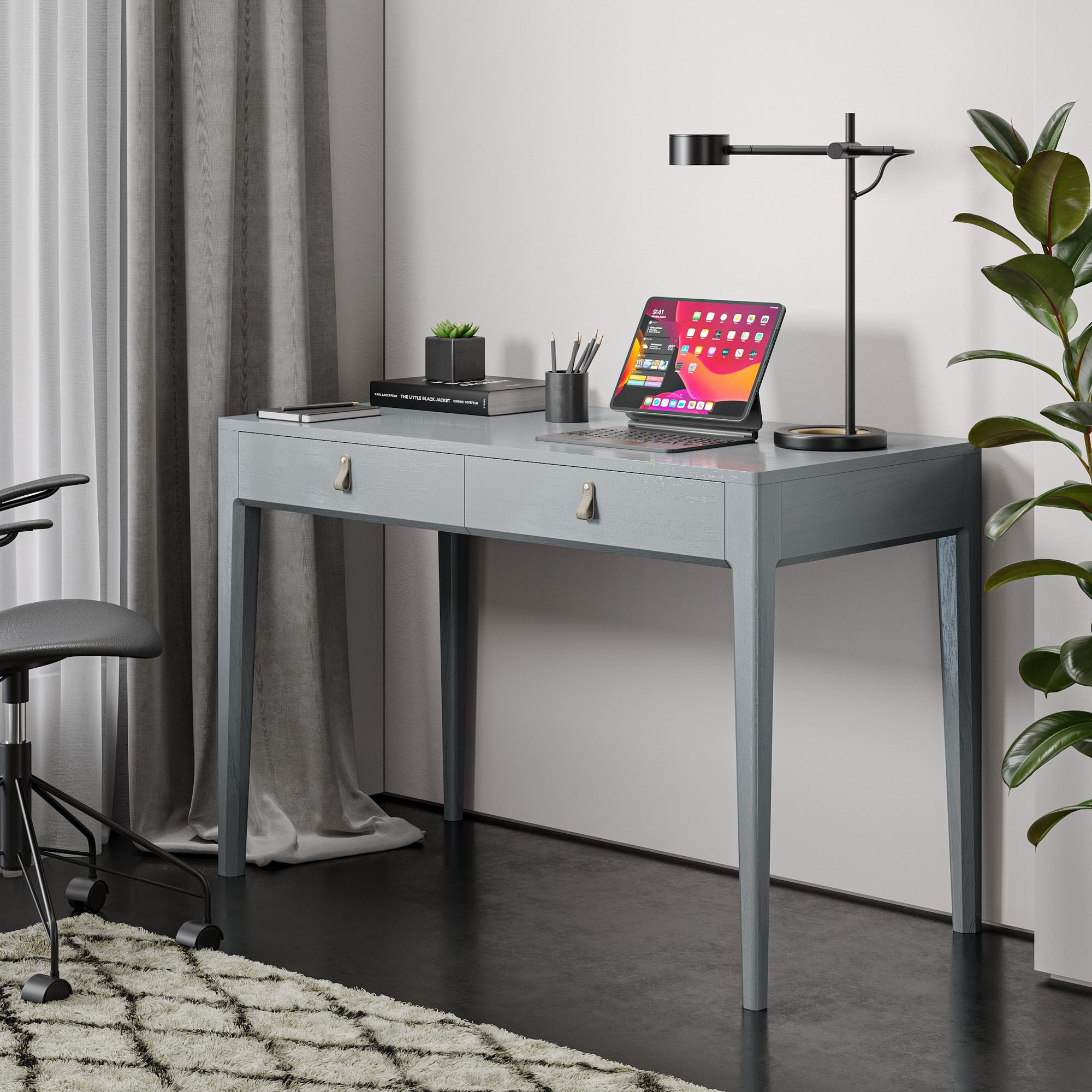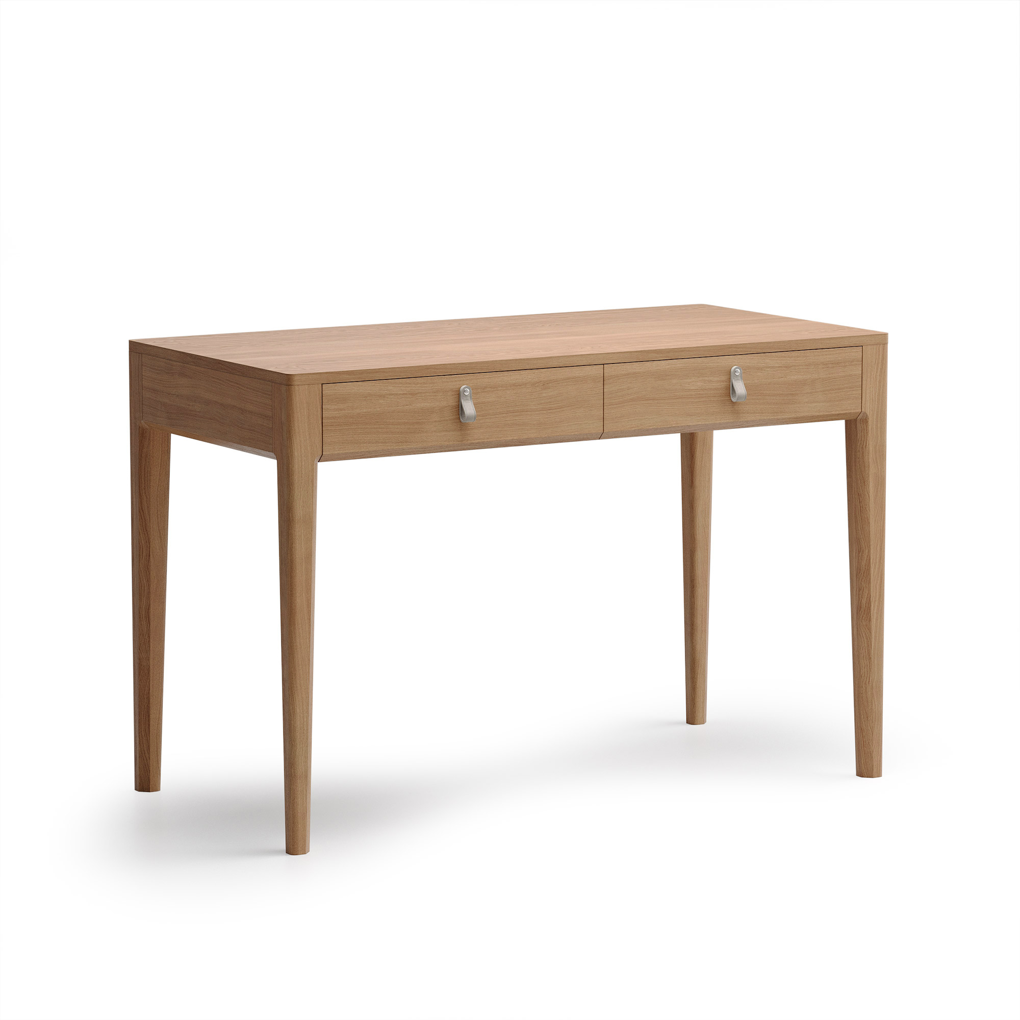 Основательный стол для создания полноценного рабочего места в кабинете или квартире-студии. Глубина 60-70 см обеспечивает достаточно пространства для комфортной работы. Правильная прямоугольная форма, два вместительных ящика для документов и строгий дизайн с акцентными деталями настроят на продуктивный лад.