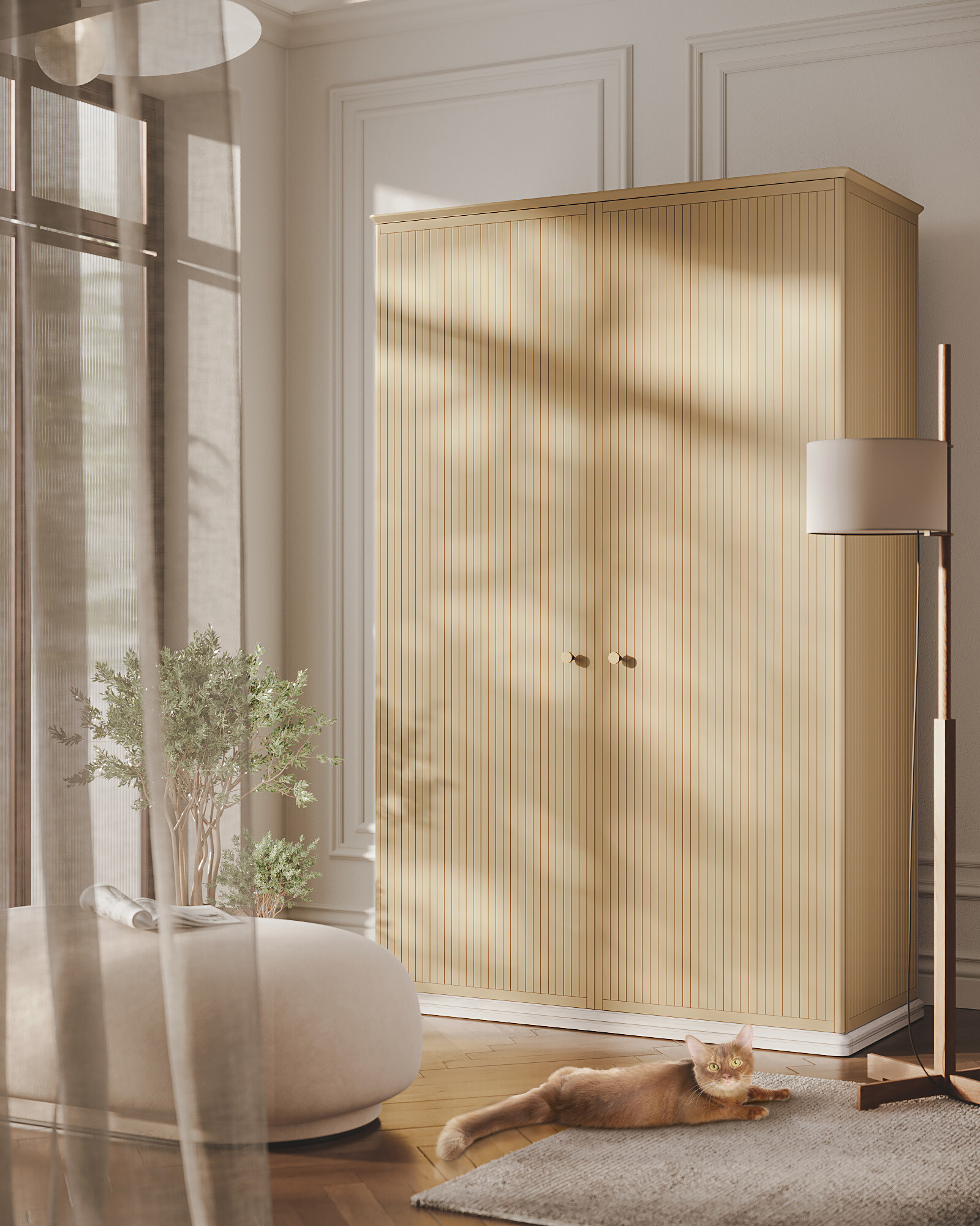 Вдохновленный ар-деко и северным модерном, этот шкаф сочетает плавные очертания, геометрические орнаменты и строгую элегантность. Утонченный дизайн с трехсторонней гравировкой и ступенчатой фрезеровкой создает выразительный образ без намека на китч. Благодаря продуманным габаритам шкаф станет функциональным украшением спальни или просторной прихожей, гармонично используя пространство.