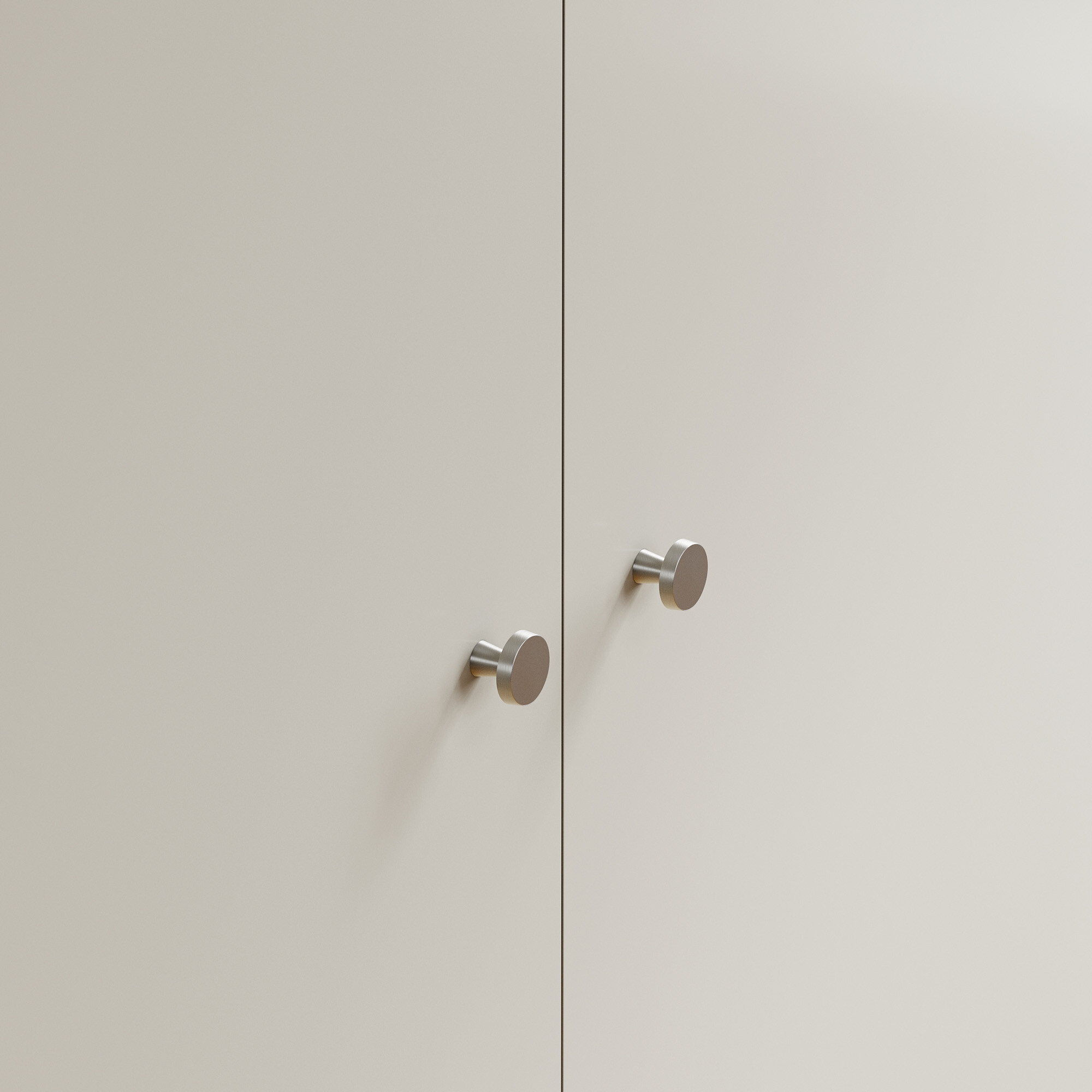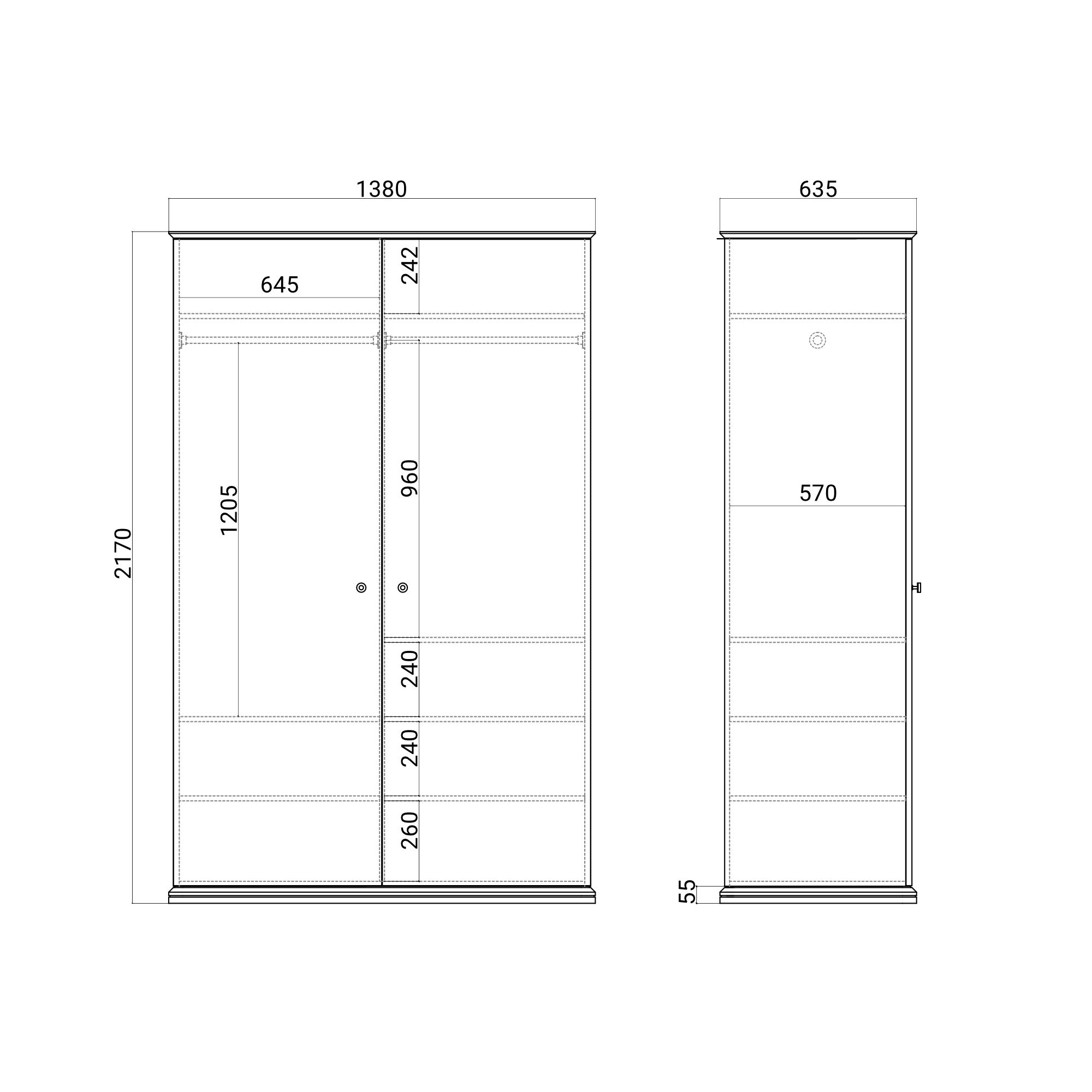 Продуманное наполнение включает секции со штангами для длинных вещей, верхние и нижние полки для негабаритных предметов и аксессуаров. Универсальная система хранения поддерживает идеальный порядок в гардеробе. Доводчики Hettich обеспечивают плавное и бесшумное закрывание дверей.