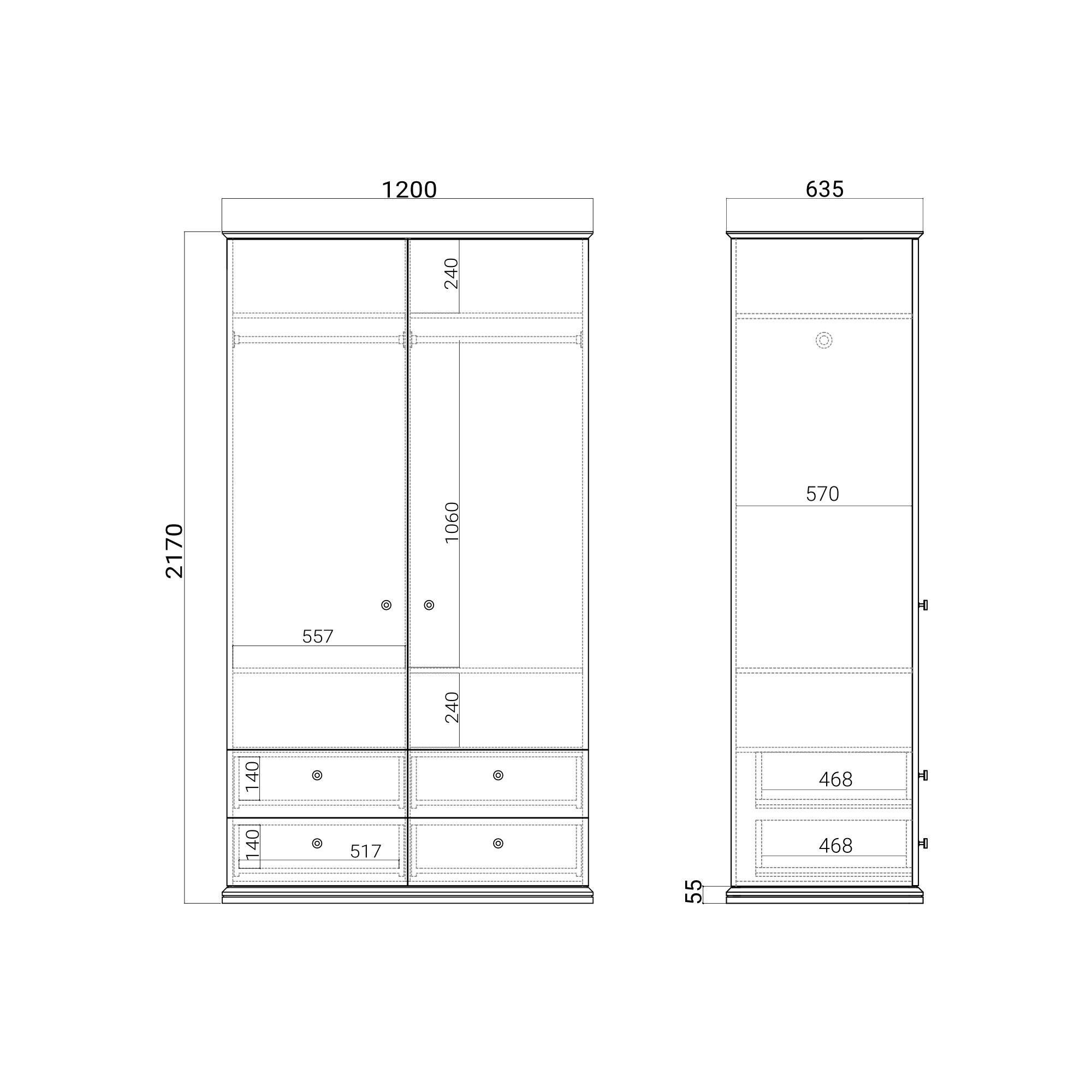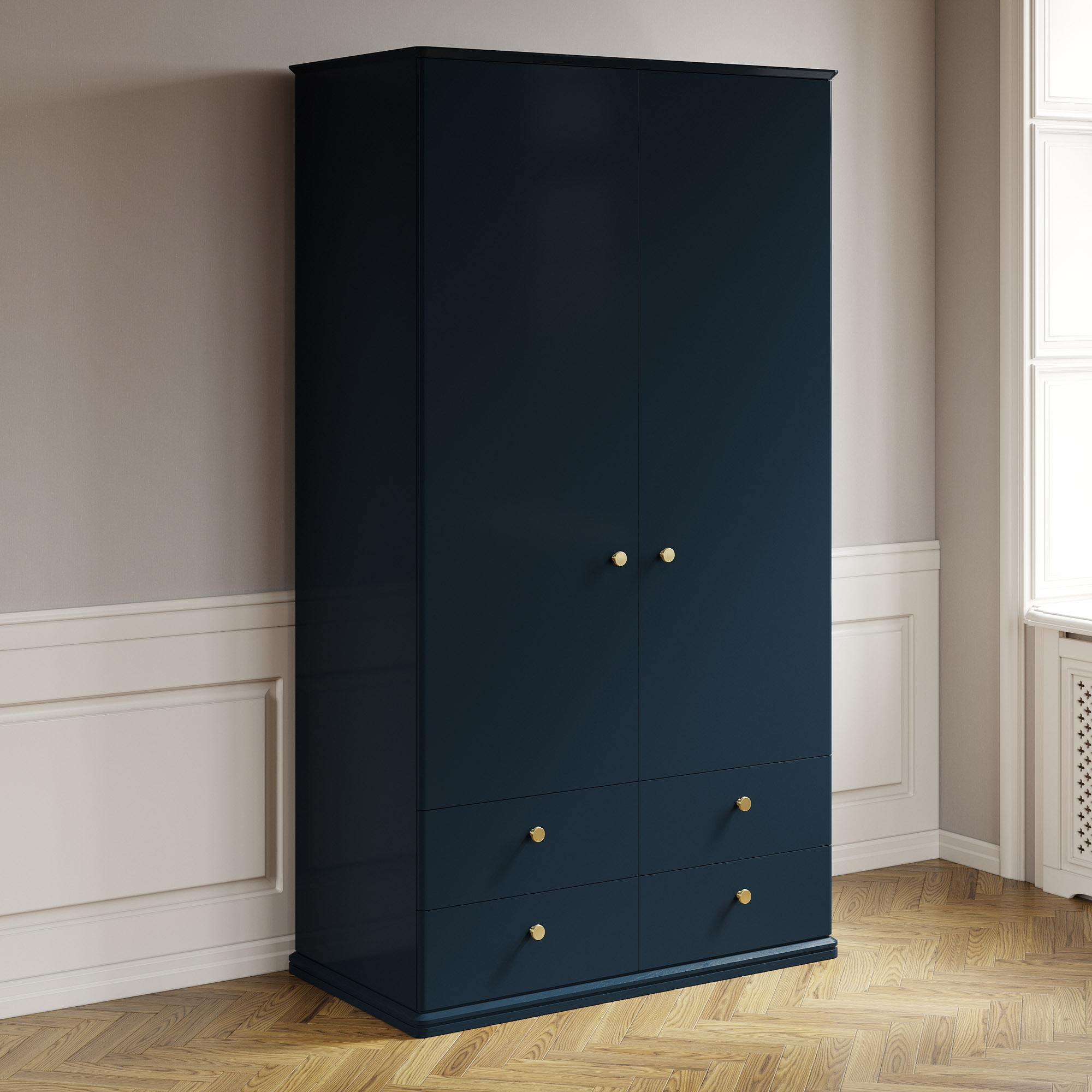Четыре вместительных ящика дополнены секциями со штангами для длинных вещей и полками для аксессуаров. Многоуровневая система хранения поддерживает идеальный порядок в гардеробе. Усиленные каркасы выдерживают до 25 кг, а доводчики Hettich обеспечивают плавное и бесшумное закрывание.
