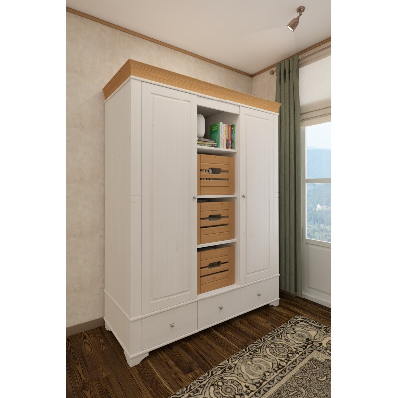 Шкаф имеет 3 отделения: правое и левое отделение с полкой и штангой под ней, среднее отделение имеет 3 полки, которые регулируются по высоте. Под каждым отделением имеется выдвижной ящик на роликовых направляющих. Дополнительно можно приобрести полки в левое или правое отделение.