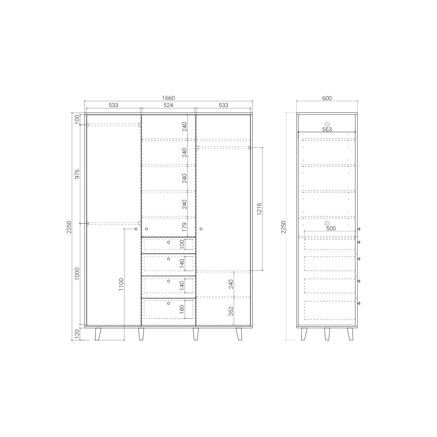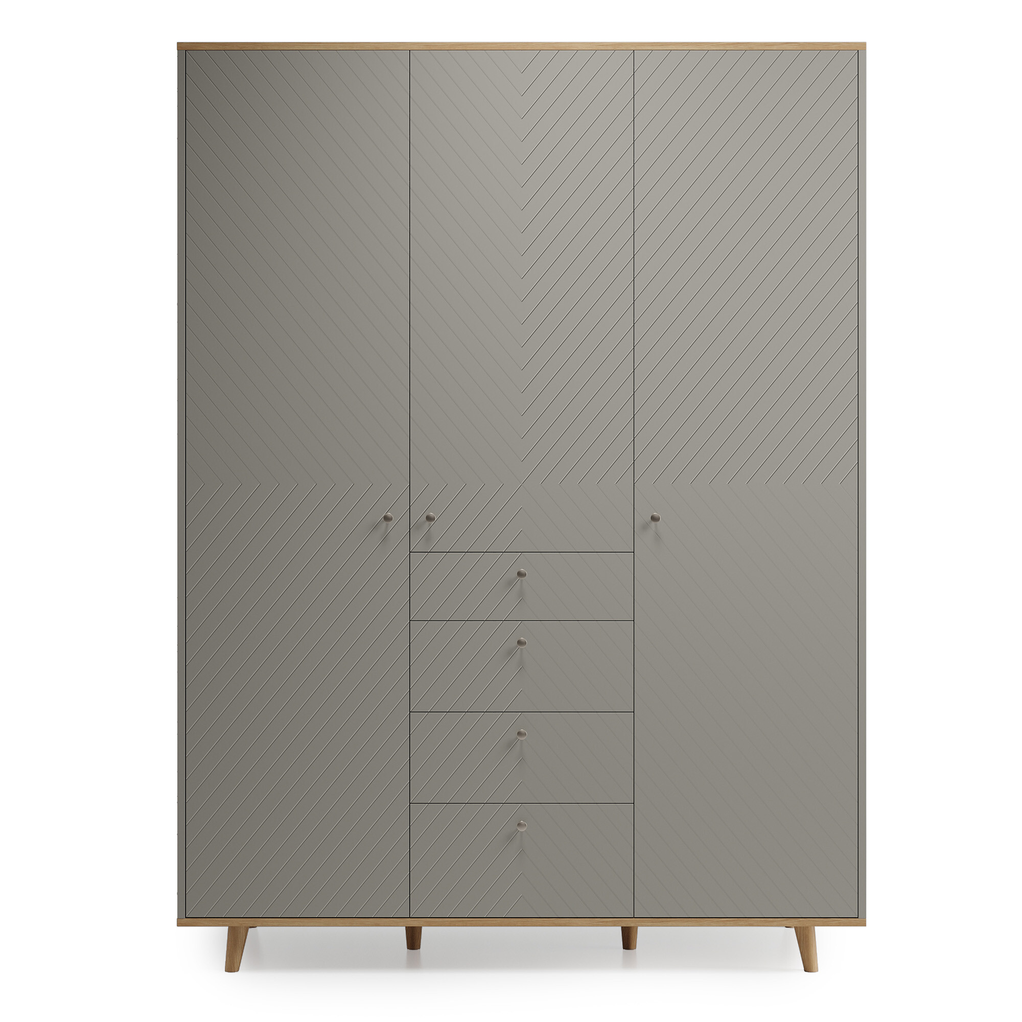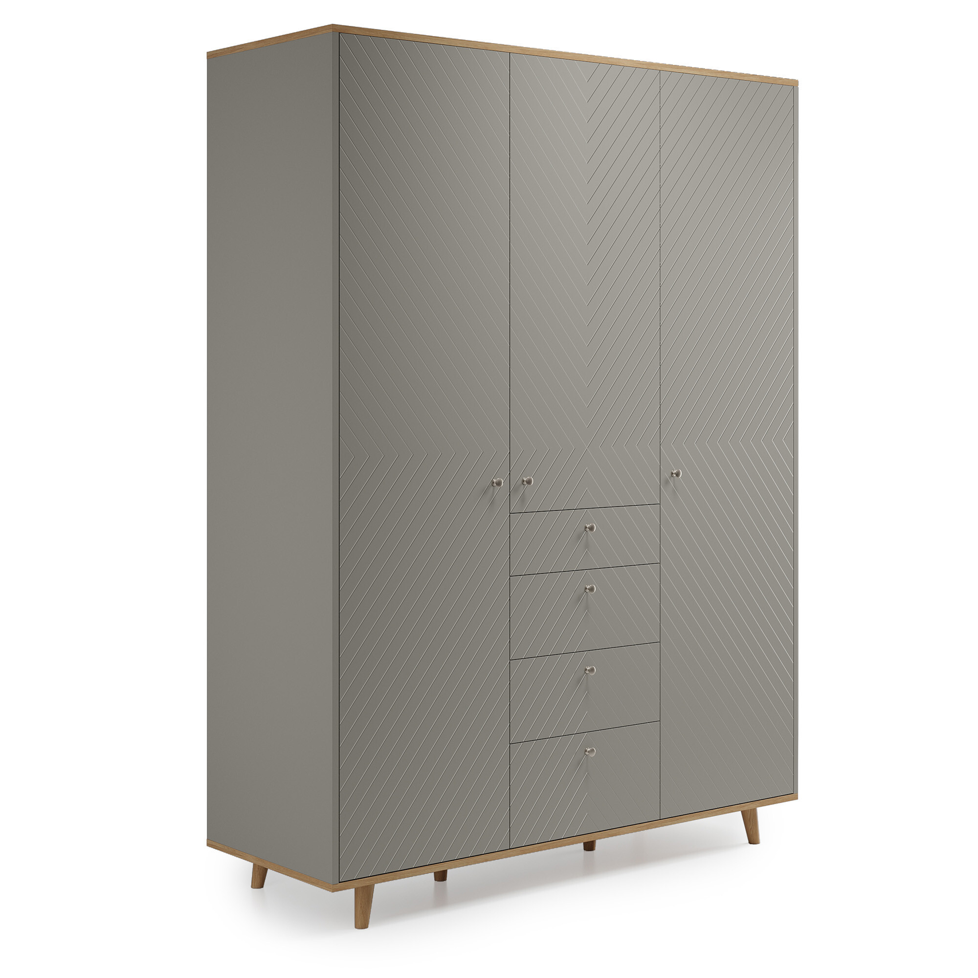 Один из самых вместительных шкафов в коллекции. Продуманная система хранения и современным дизайн в стиле mid-century. Модель разделена на три функциональные просторные секции со штангами и полками, а также четыре вместительных ящика позволят организовать комфортное хранение вещей. Благодаря универсальному дизайну и натуральным материалам — массиву дуба и шпону — шкаф станет элегантным дополнением любого интерьера.
