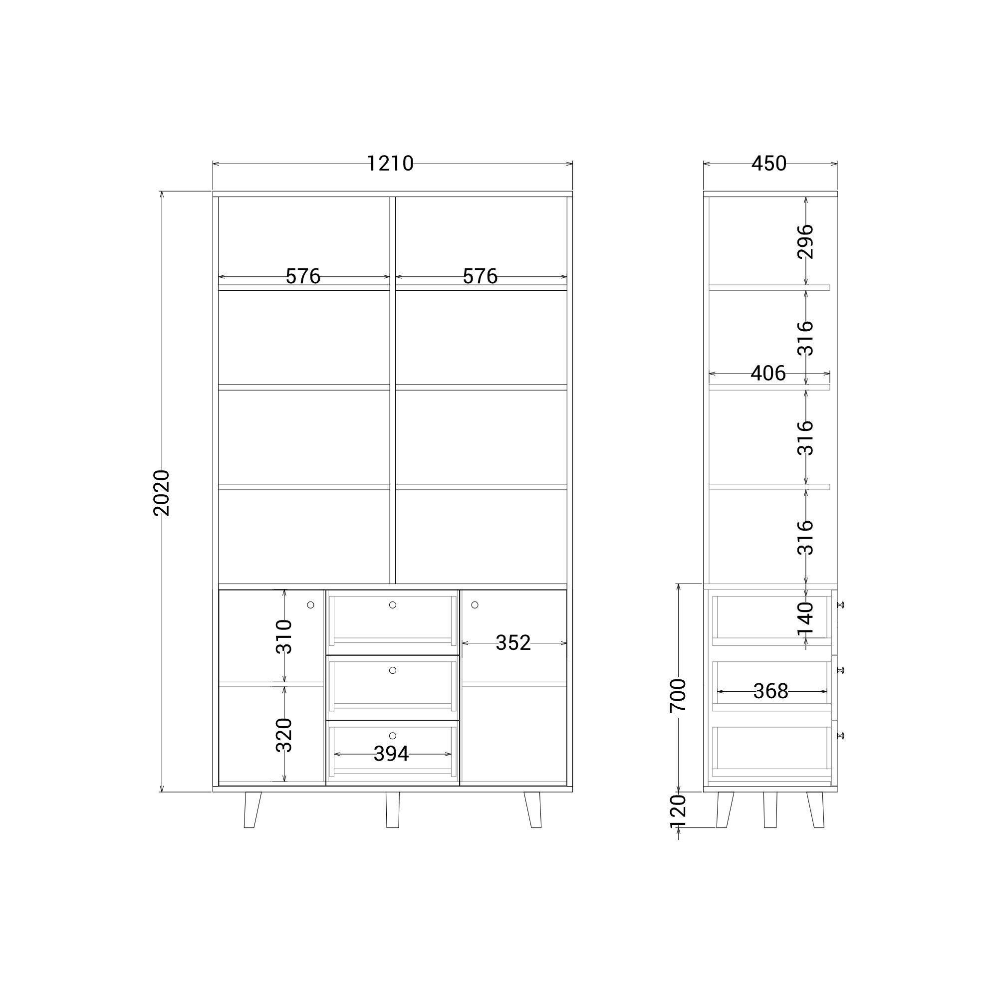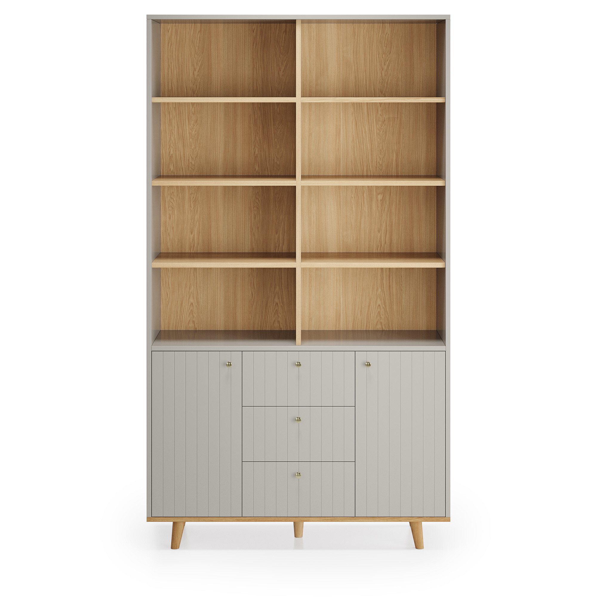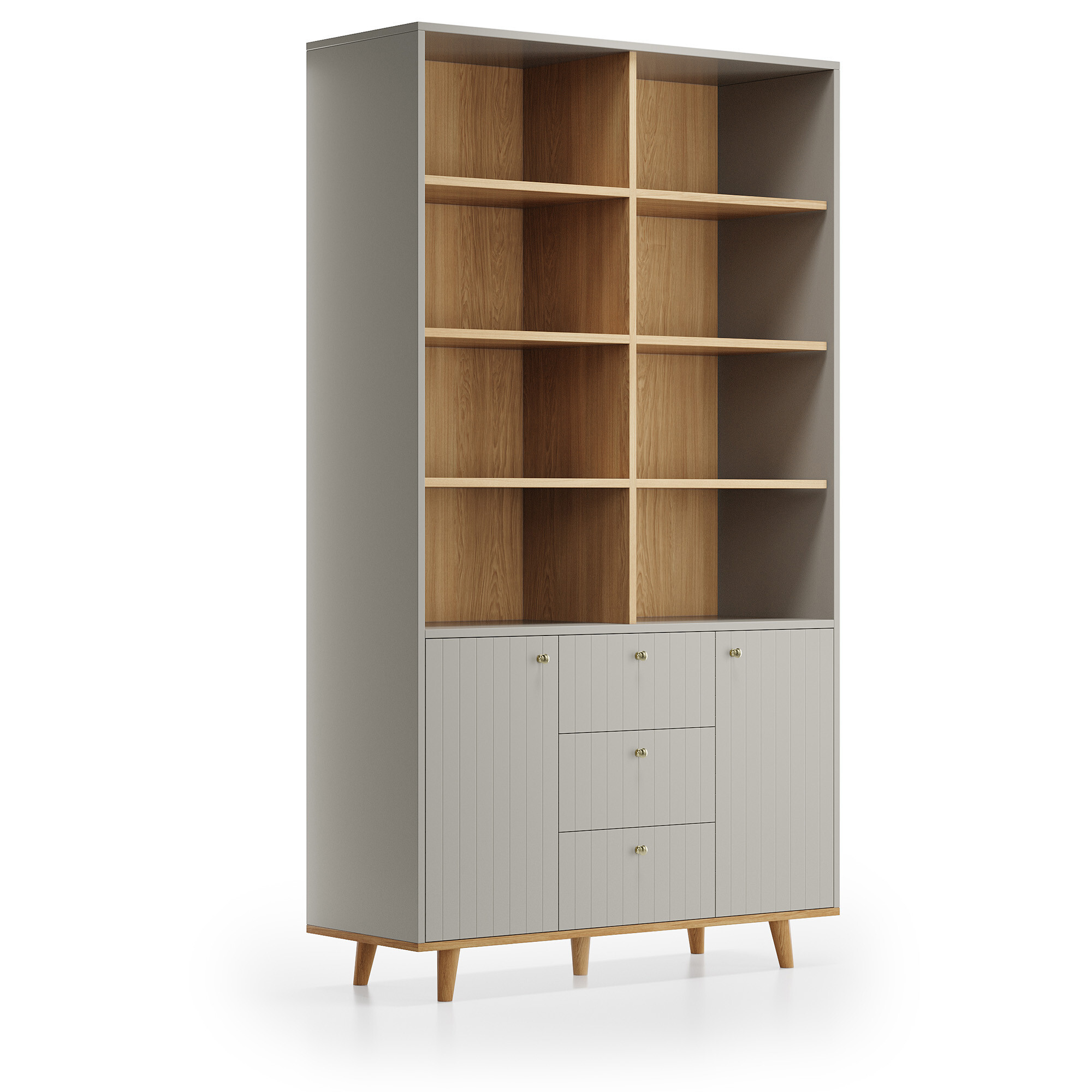 Стеллаж — удобное, практичное, стильное решение для тех, кто ценит качественный дизайн и комфорт. Основательная конструкция стеллажа не выглядит перегруженной благодаря изящным ножкам. Акцент на функциональности: стеллаж имеет восемь открытых полок в верхней секции, 3 ящика и 2 отделения с полками в нижней секции.